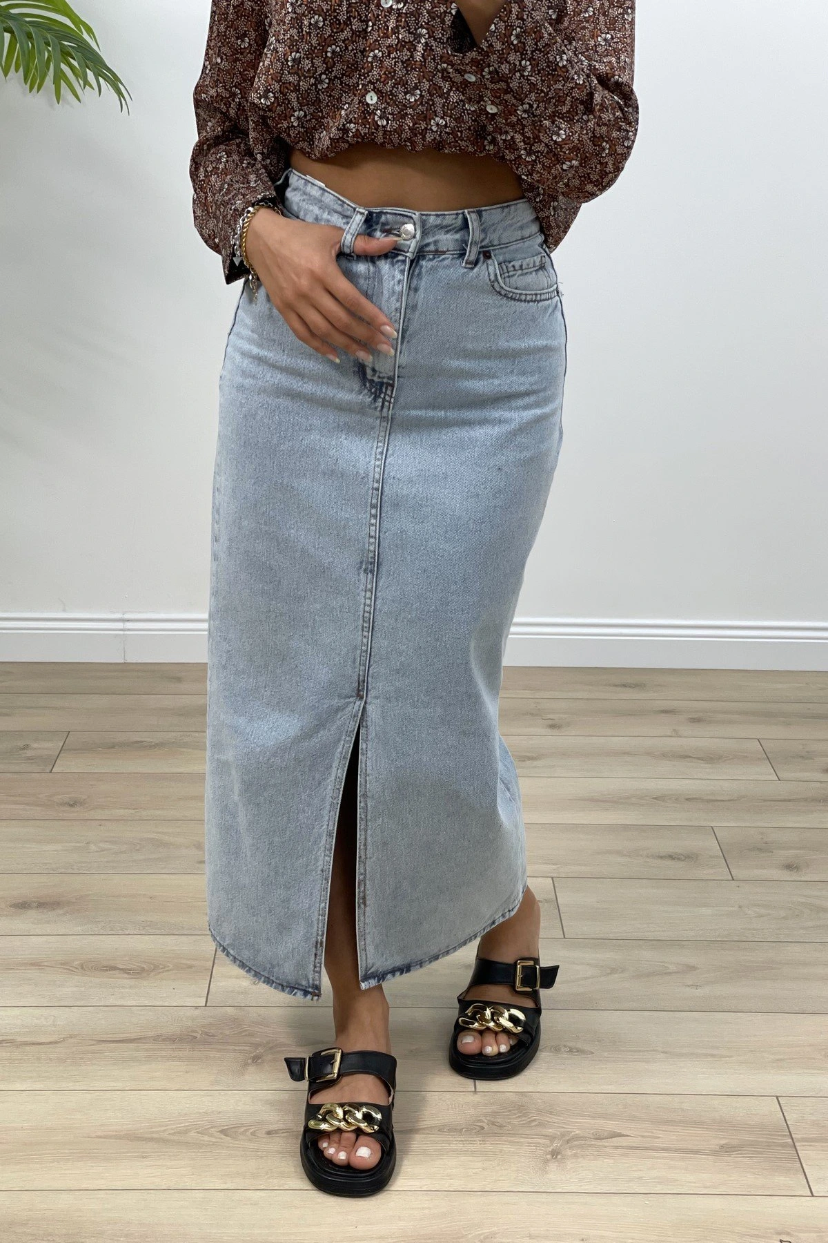 ÖN YIRTMAÇ UZUN JEAN ETEK – BUZ MAVİ