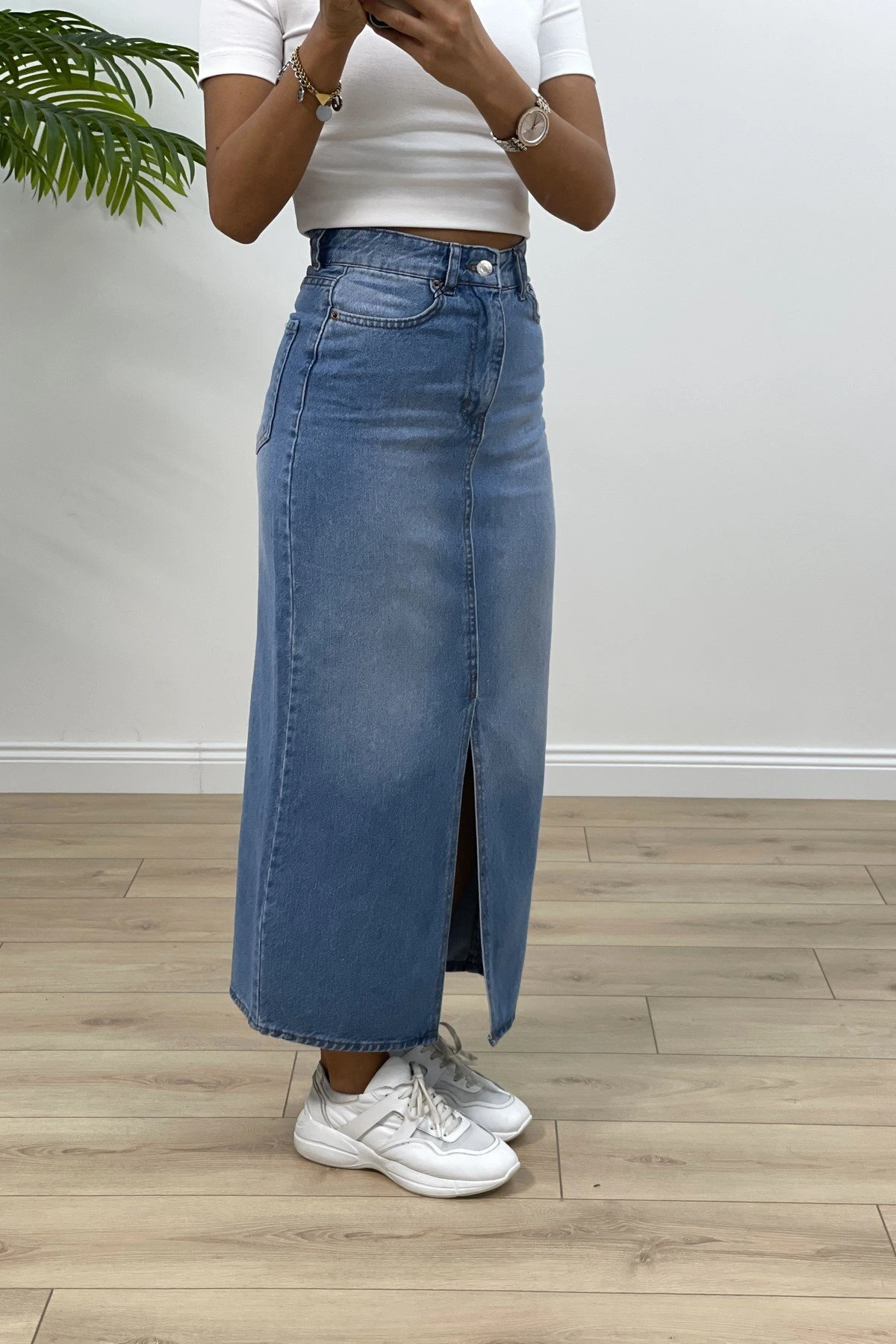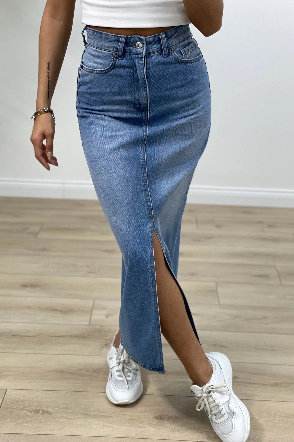 ÖN YIRTMAÇ UZUN JEAN ETEK – MAVİ