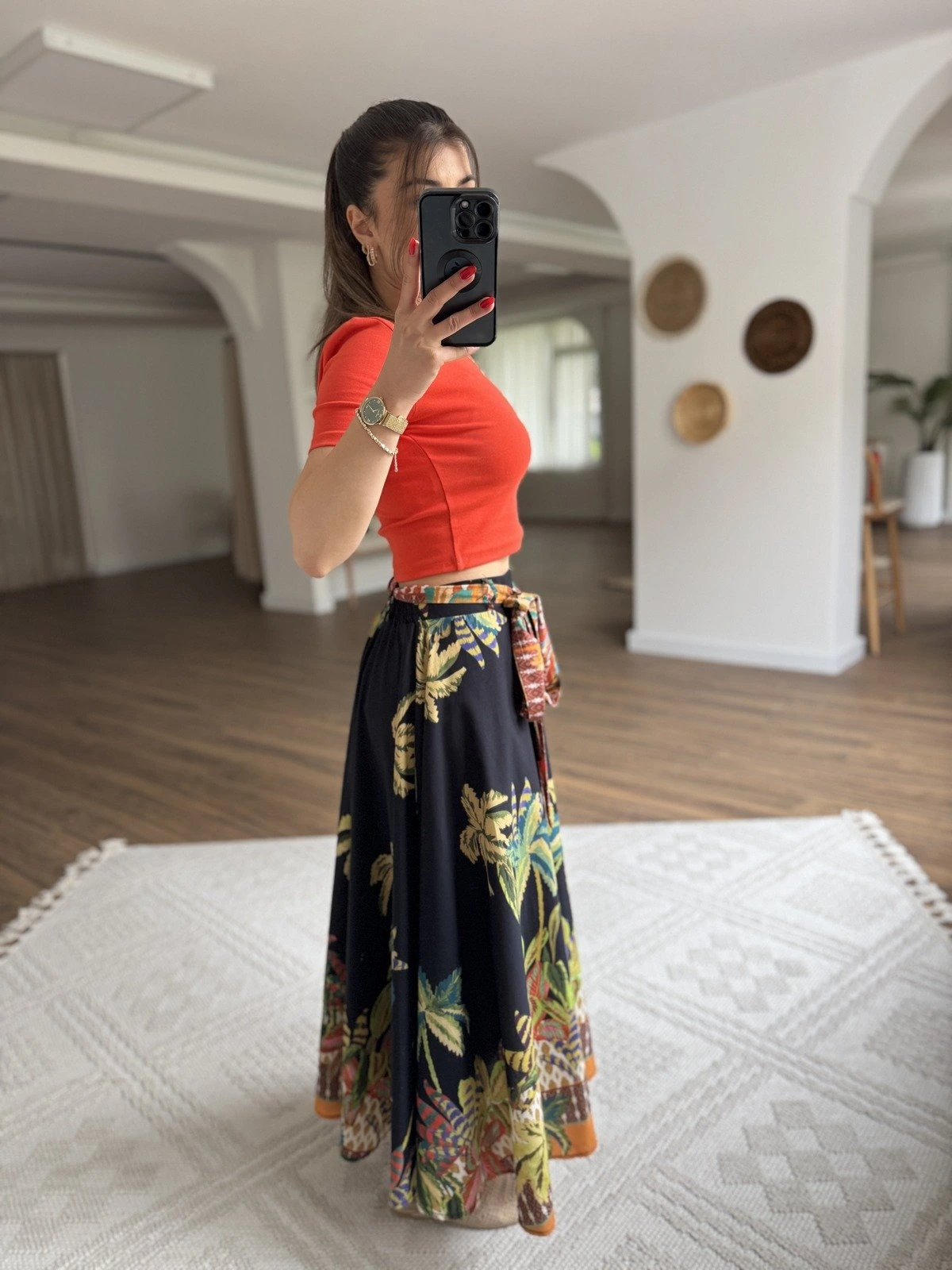PALMİYE DESEN KUŞAKLI MİDİ PAMUK ETEK – SİYAH