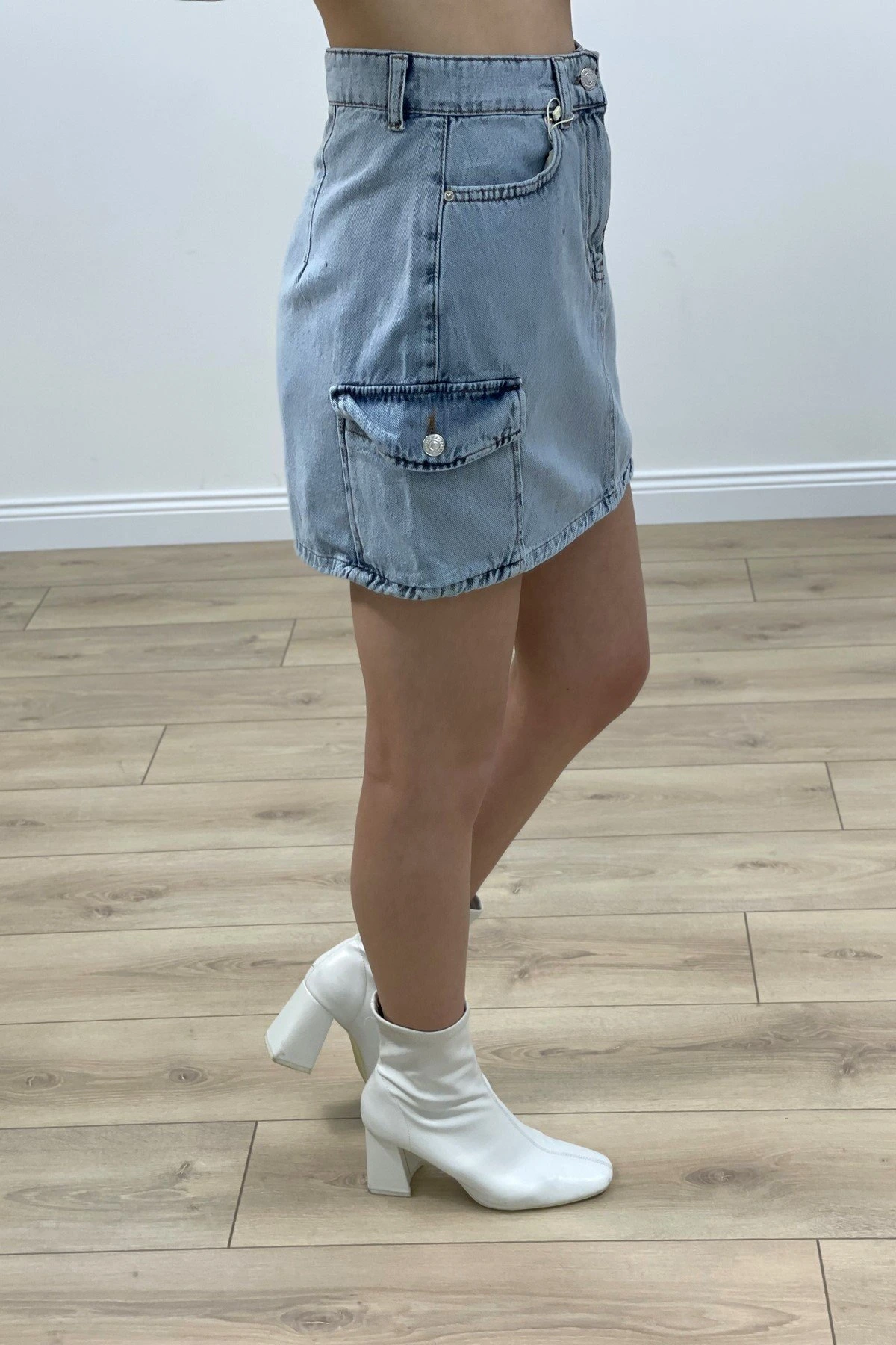 YAN CEPLİ MİNİ KOT ETEK – MAVİ