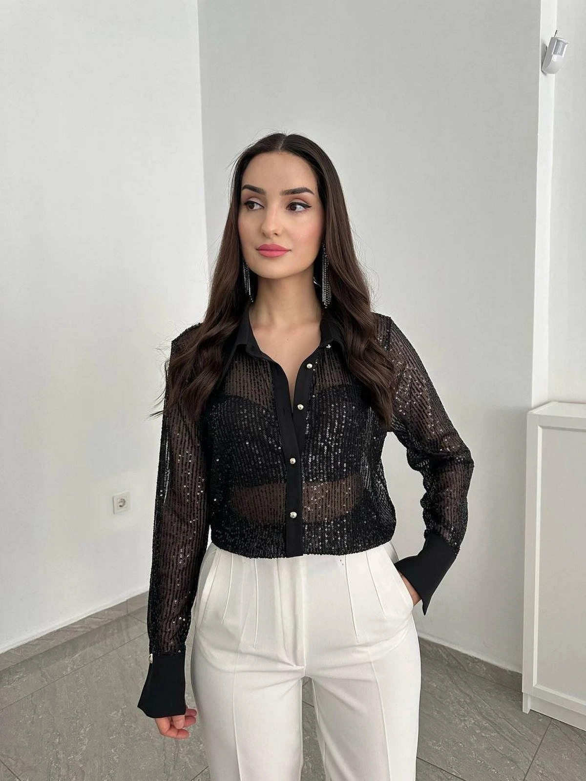 ORGANZE SIRT ETİKETLİ CROP GÖMLEK - SİYAH