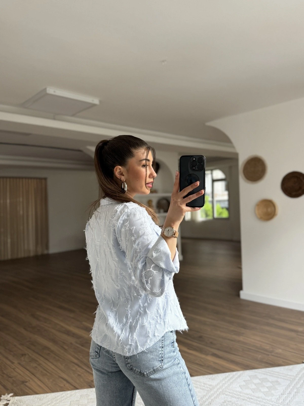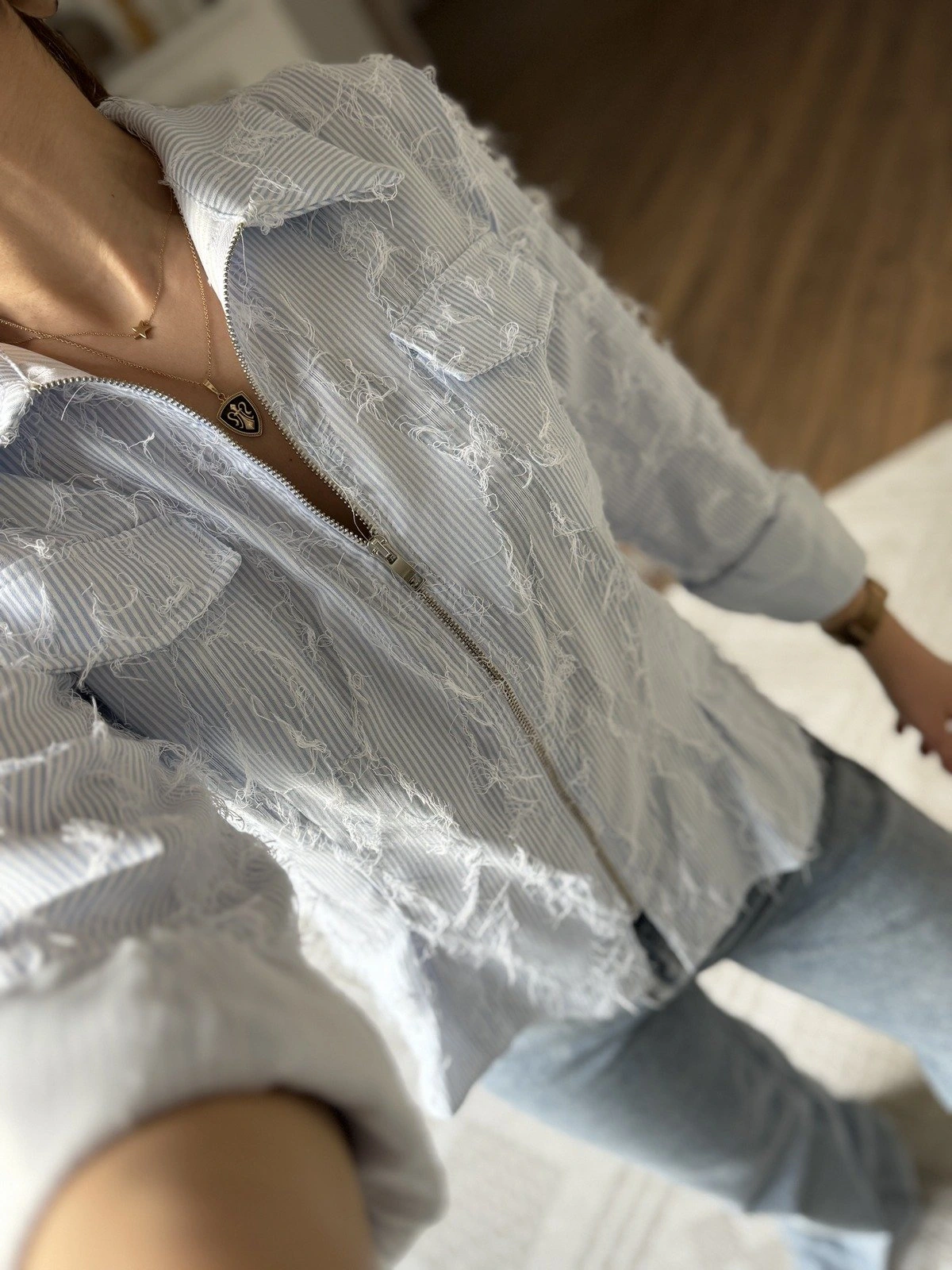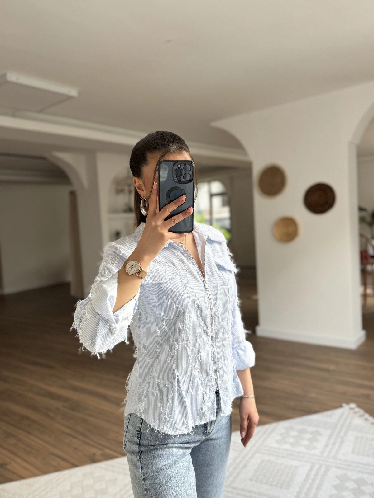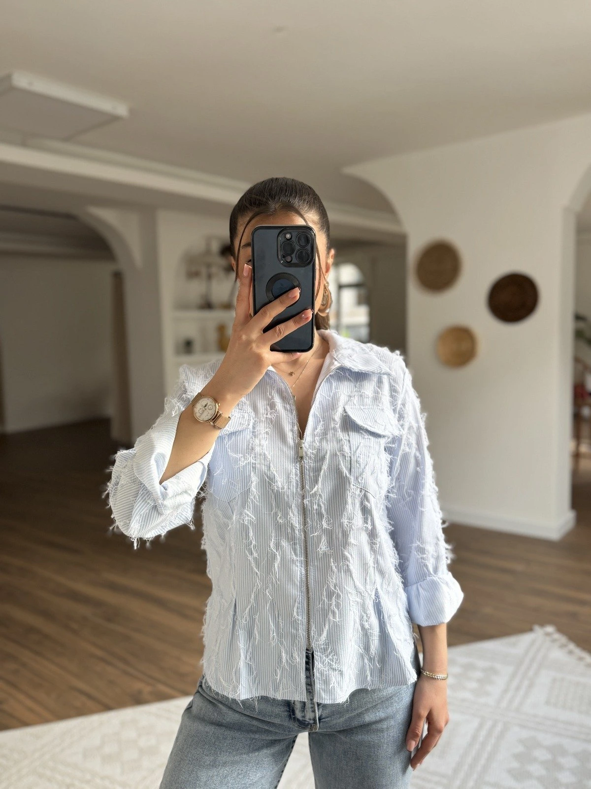 3024 İP PÜSKÜL KAPAK CEP ÇİZGİLİ FERMUARLI PAMUK GÖMLEK – MAVİ