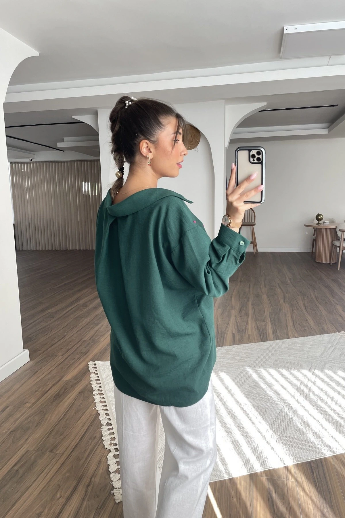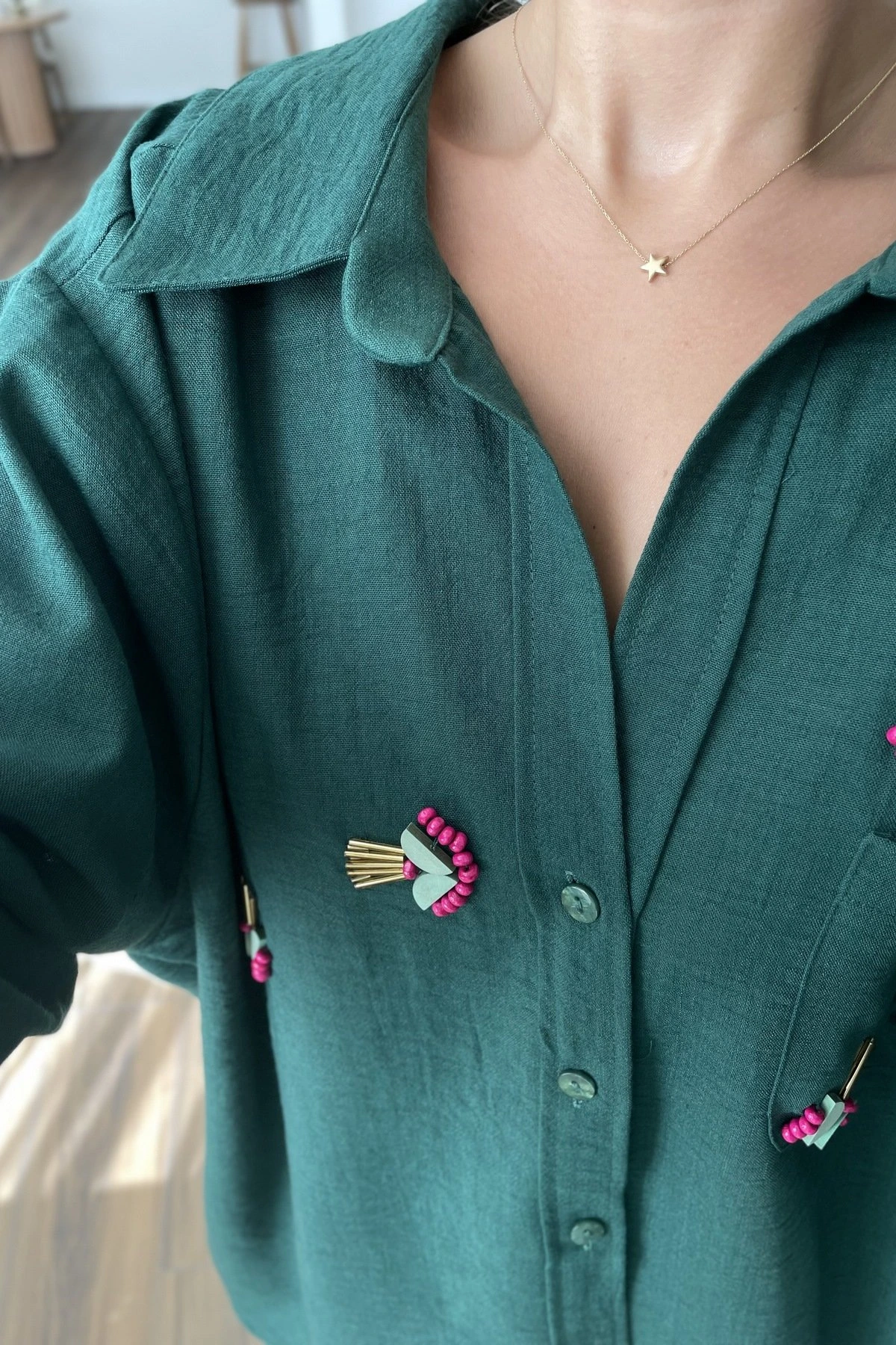 AHŞAP BONCUK İŞLEME VİSKOS SALAŞ GÖMLEK – ZÜMRÜT YEŞİL