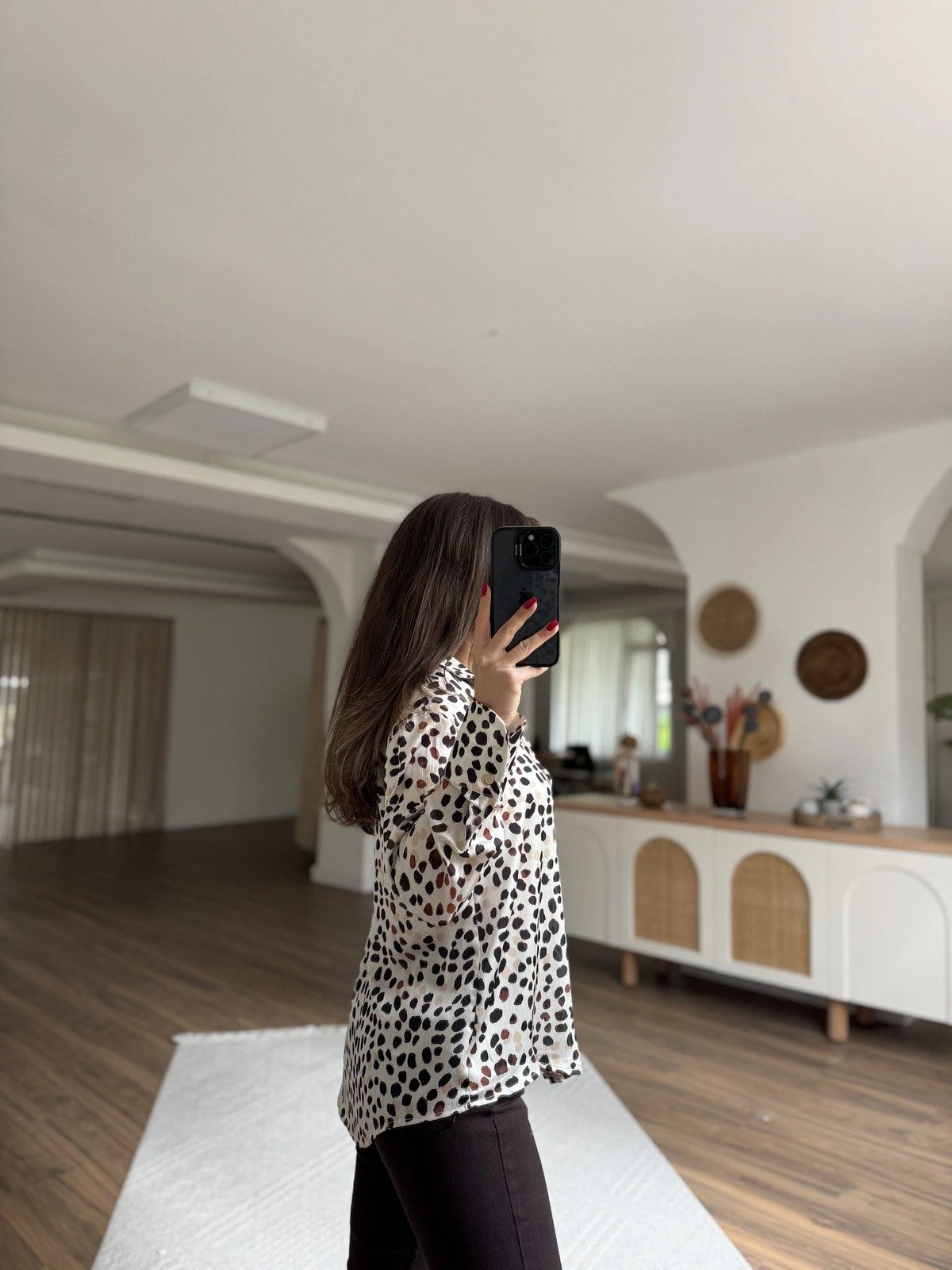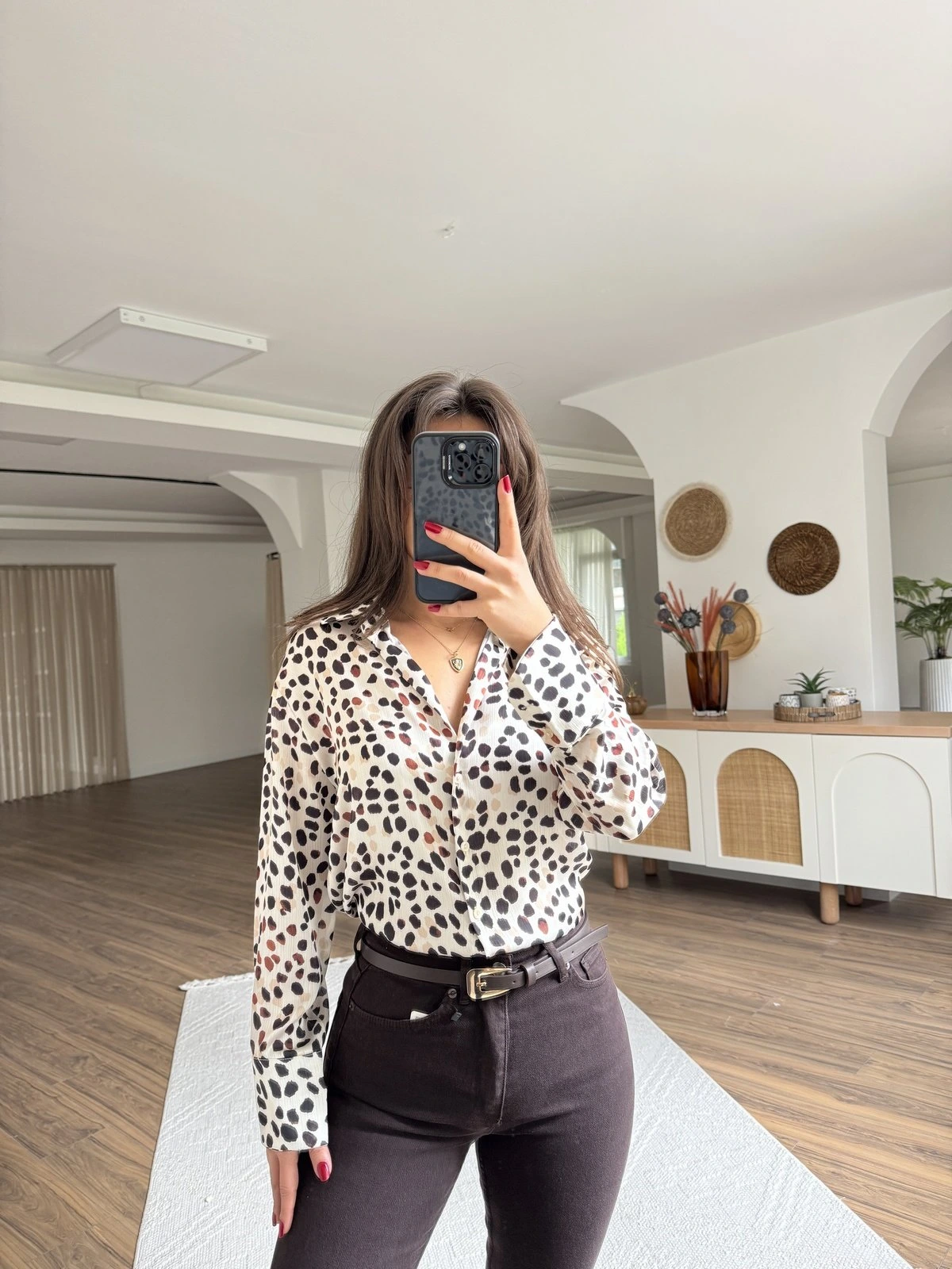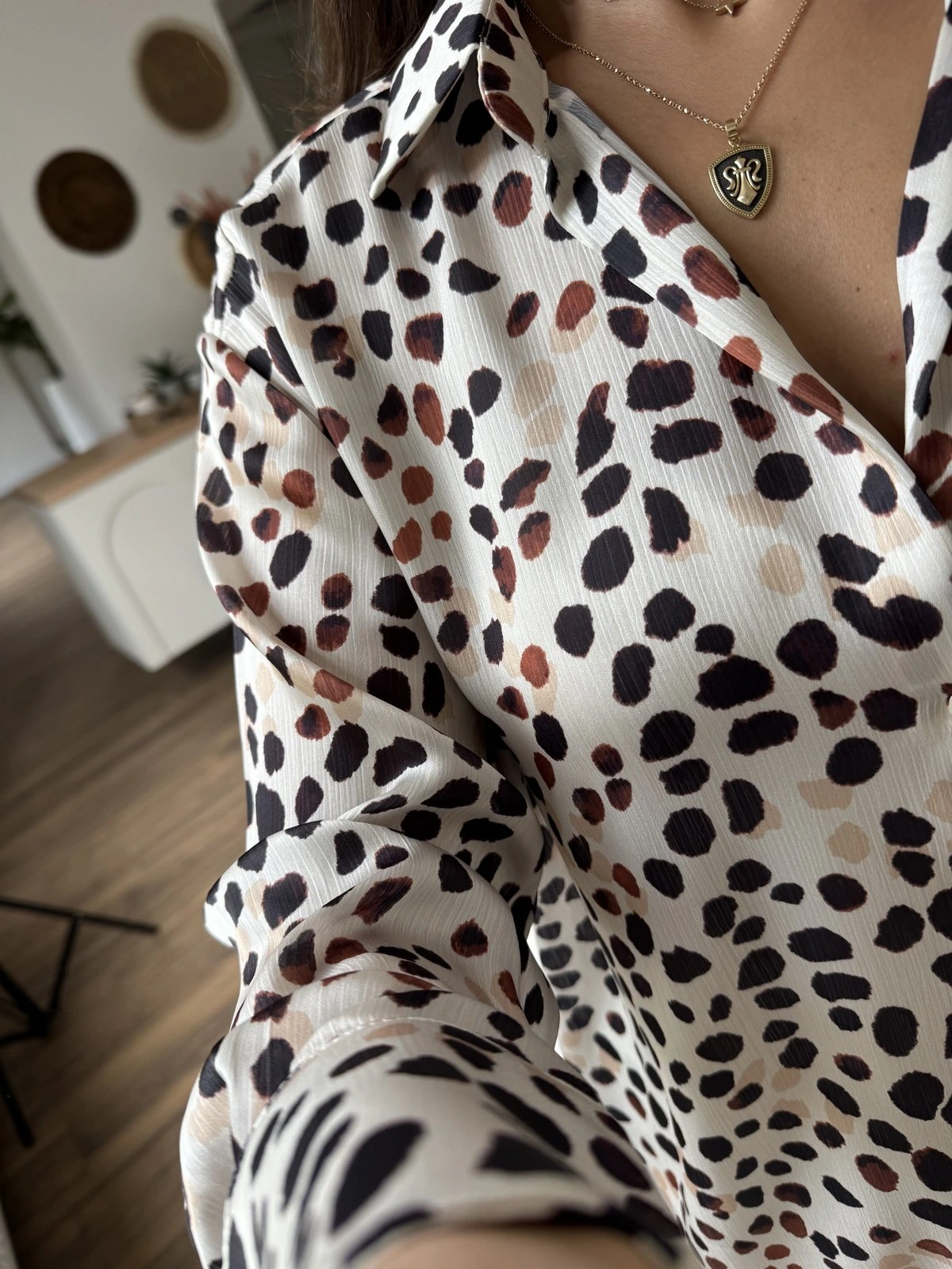 ANİMAL DESEN V YAKA SATEN GÖMLEK – BEJ