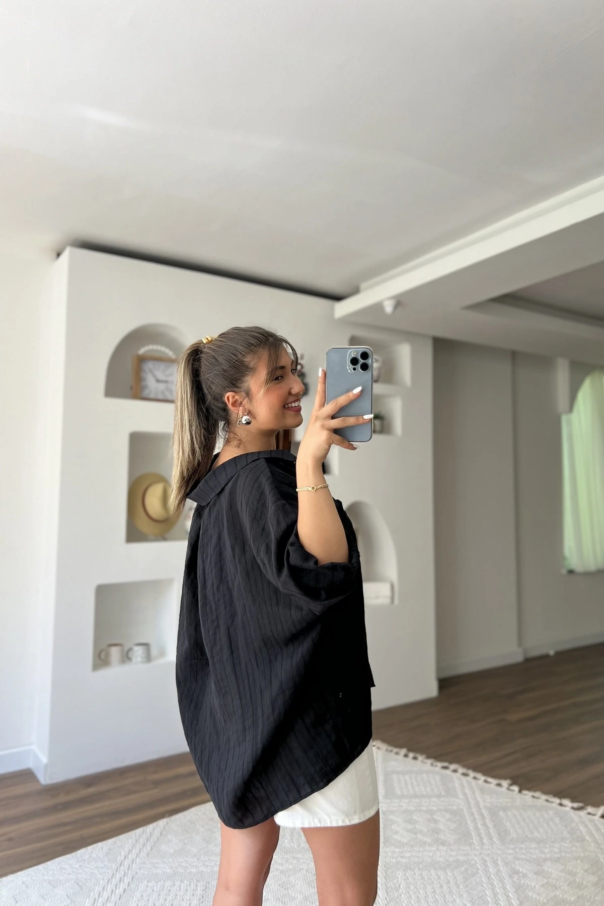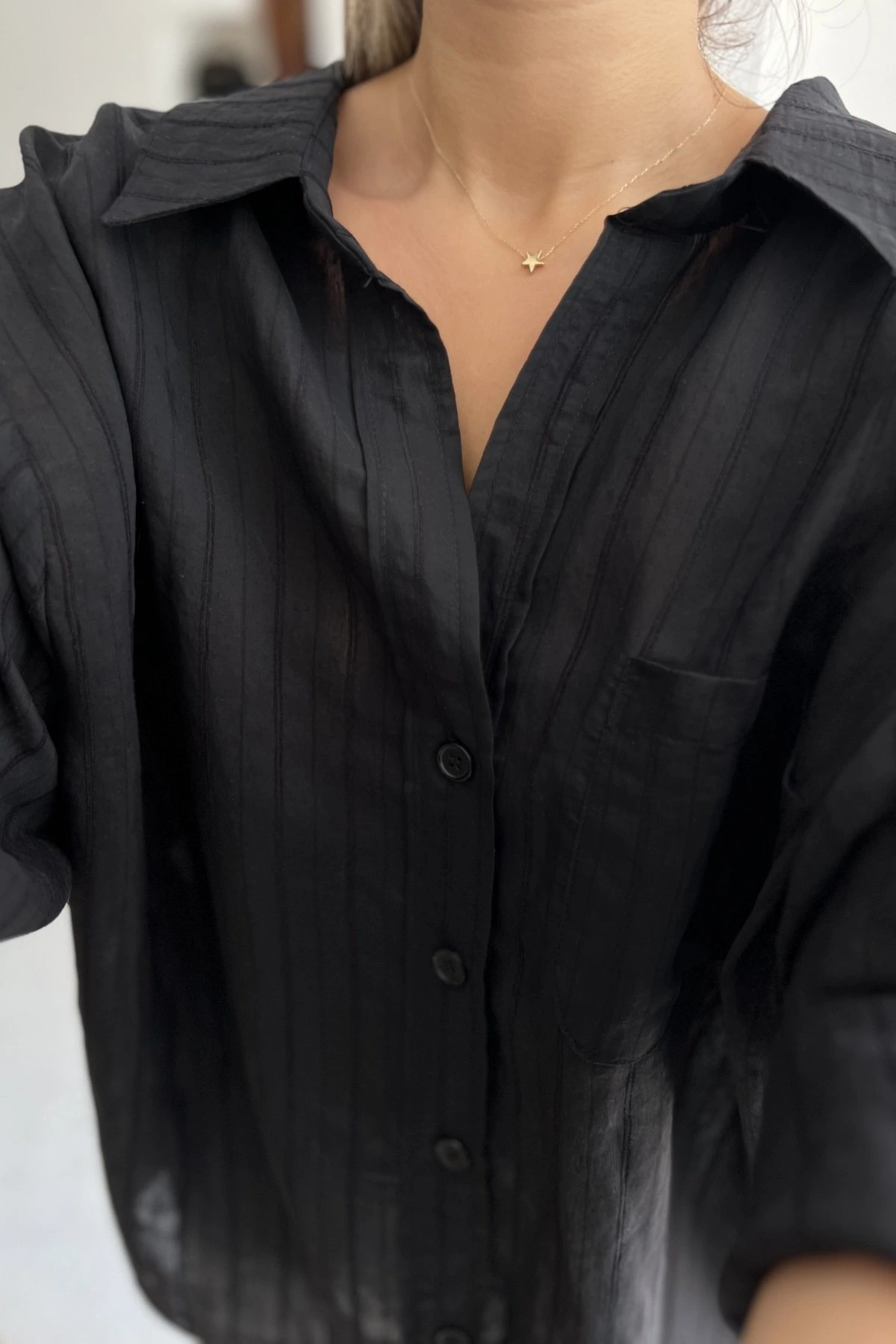ARKA A PİLE ÇİZGİ DOKU MODAL VİSKON GÖMLEK – SİYAH