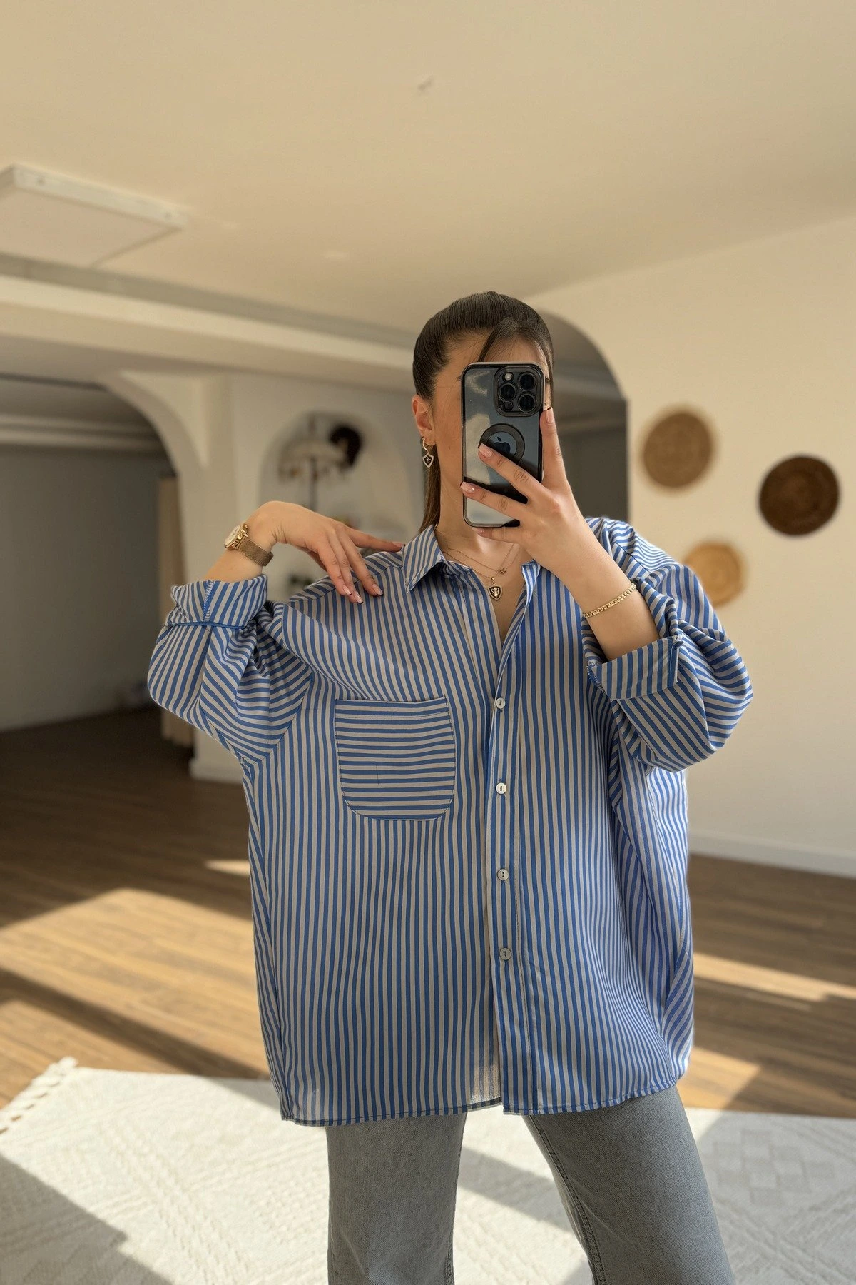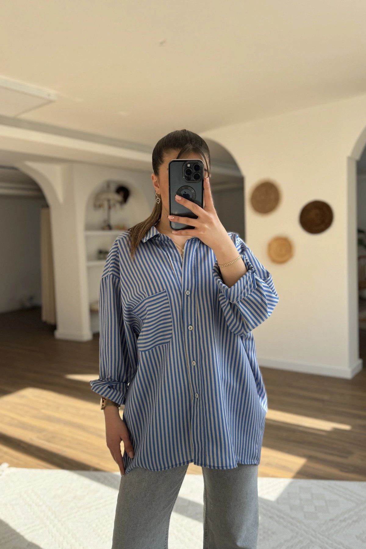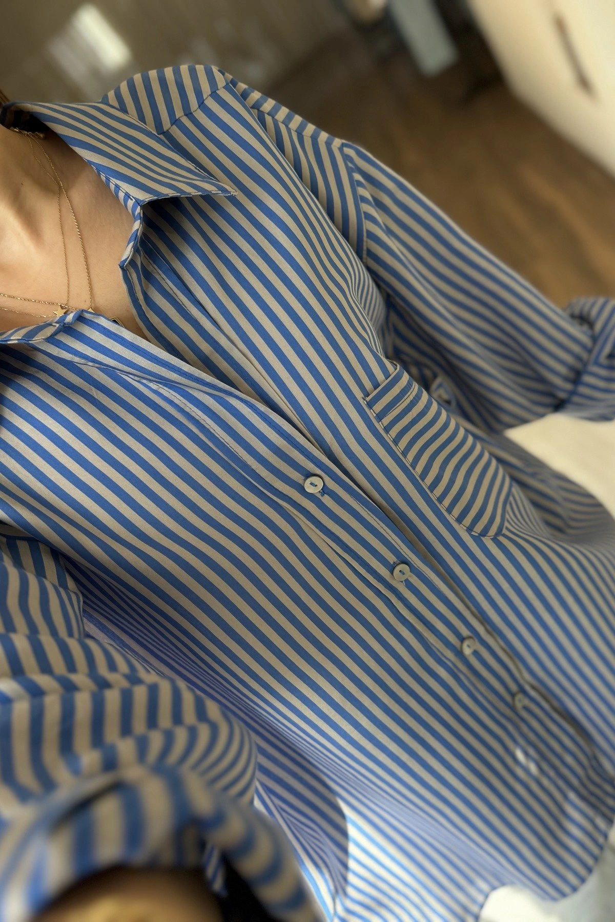 ARKA A PİLE ÇİZGİLİ VİSKON SALAŞ GÖMLEK – GRİ