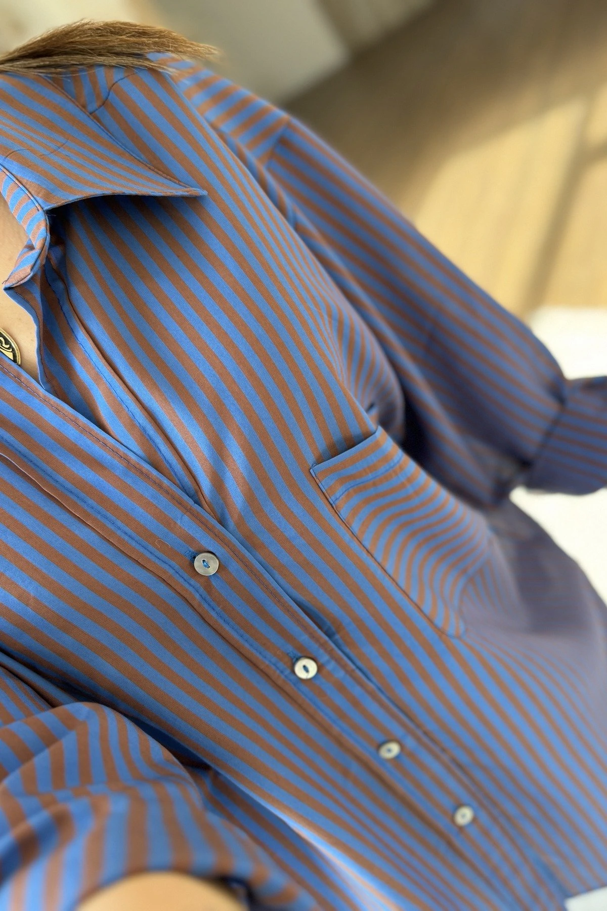 ARKA A PİLE ÇİZGİLİ VİSKON SALAŞ GÖMLEK – SAKS
