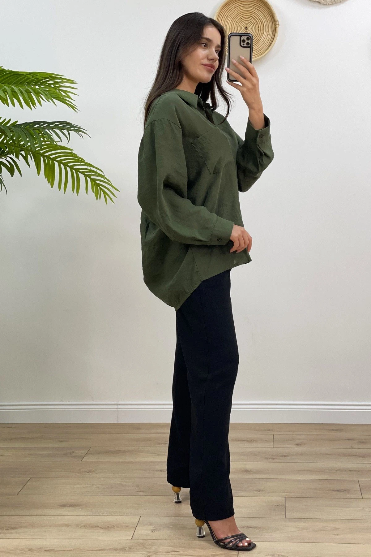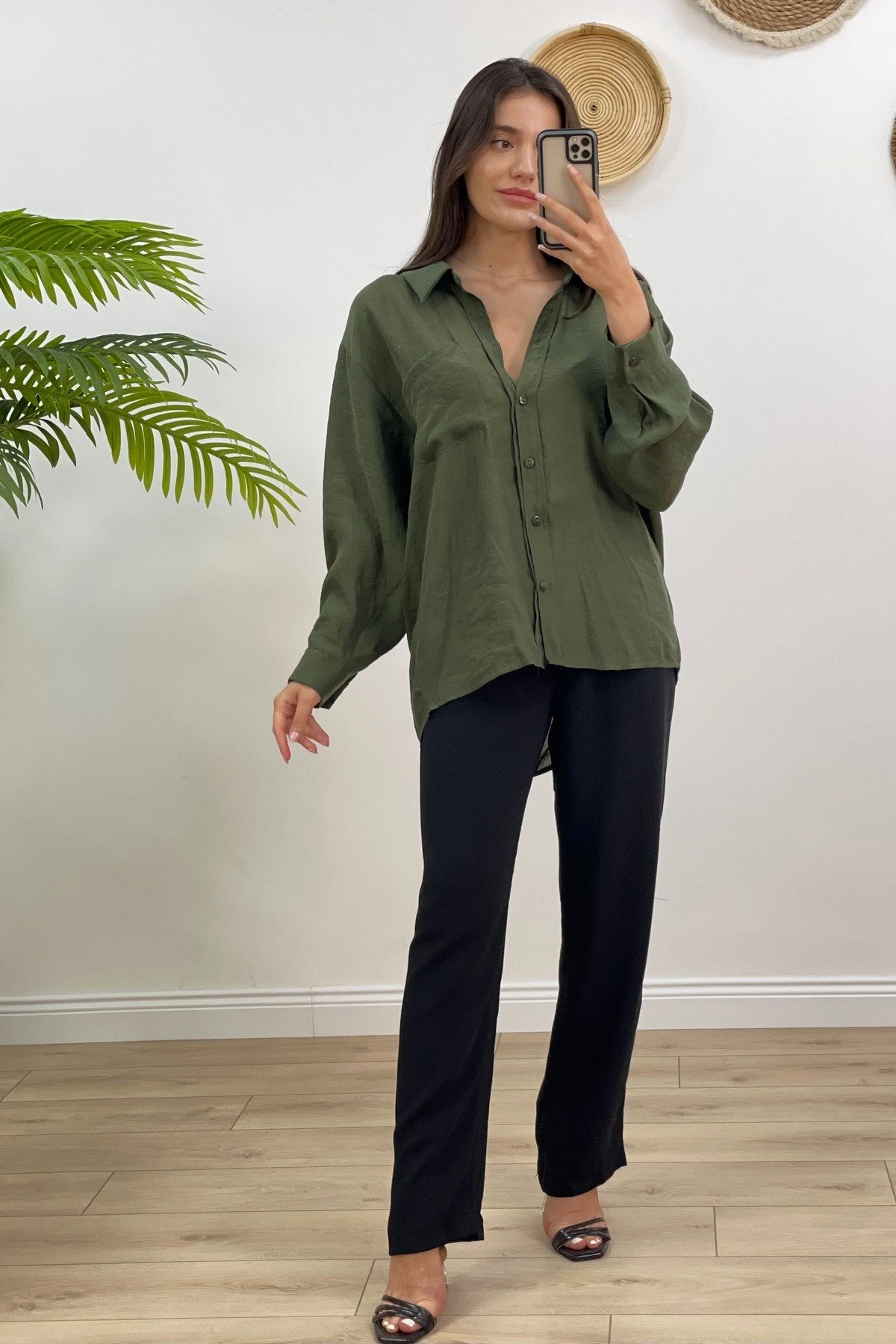 ARKA A PİLE V YAKA CEPLİ MODAL GÖMLEK – KOYU HAKİ