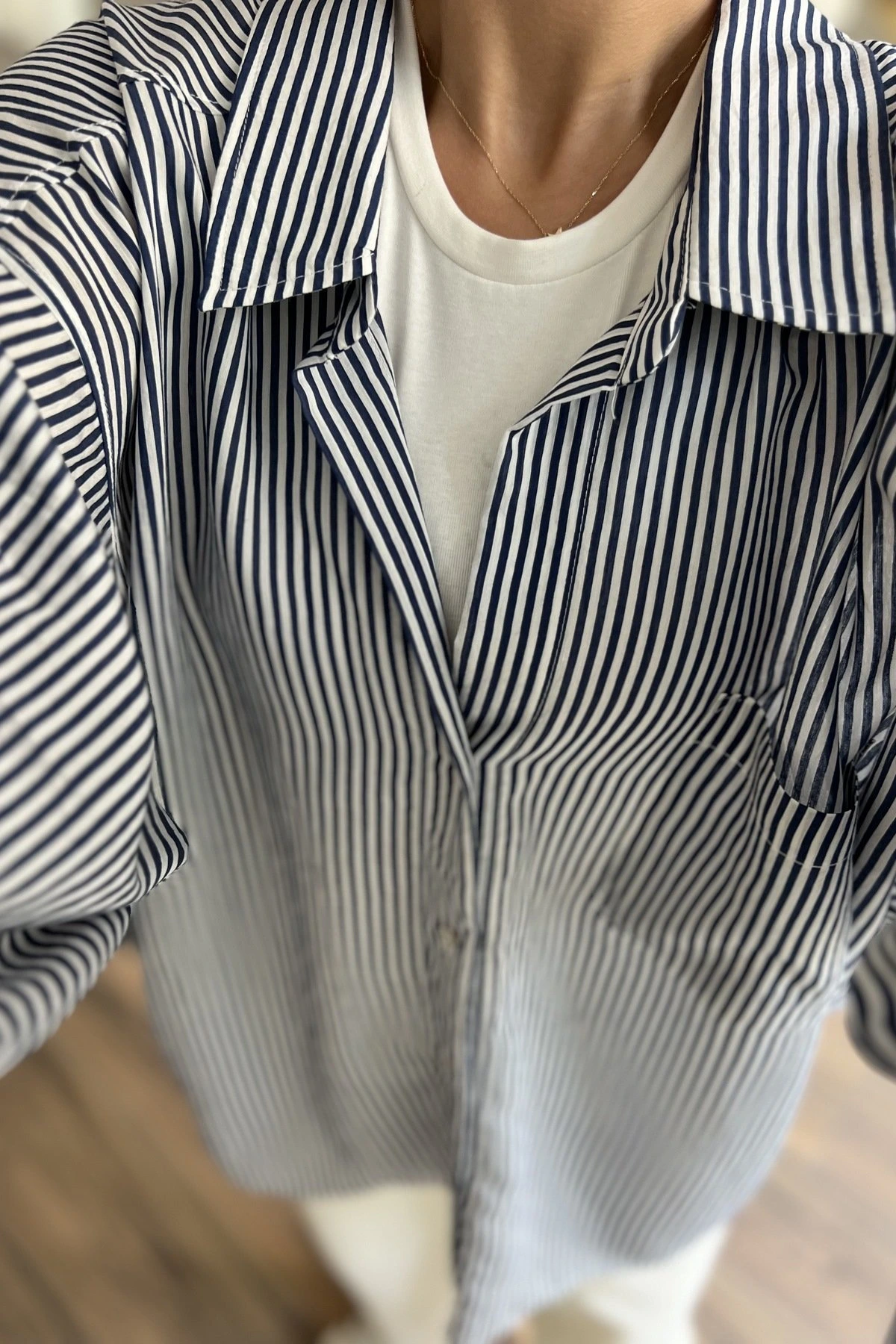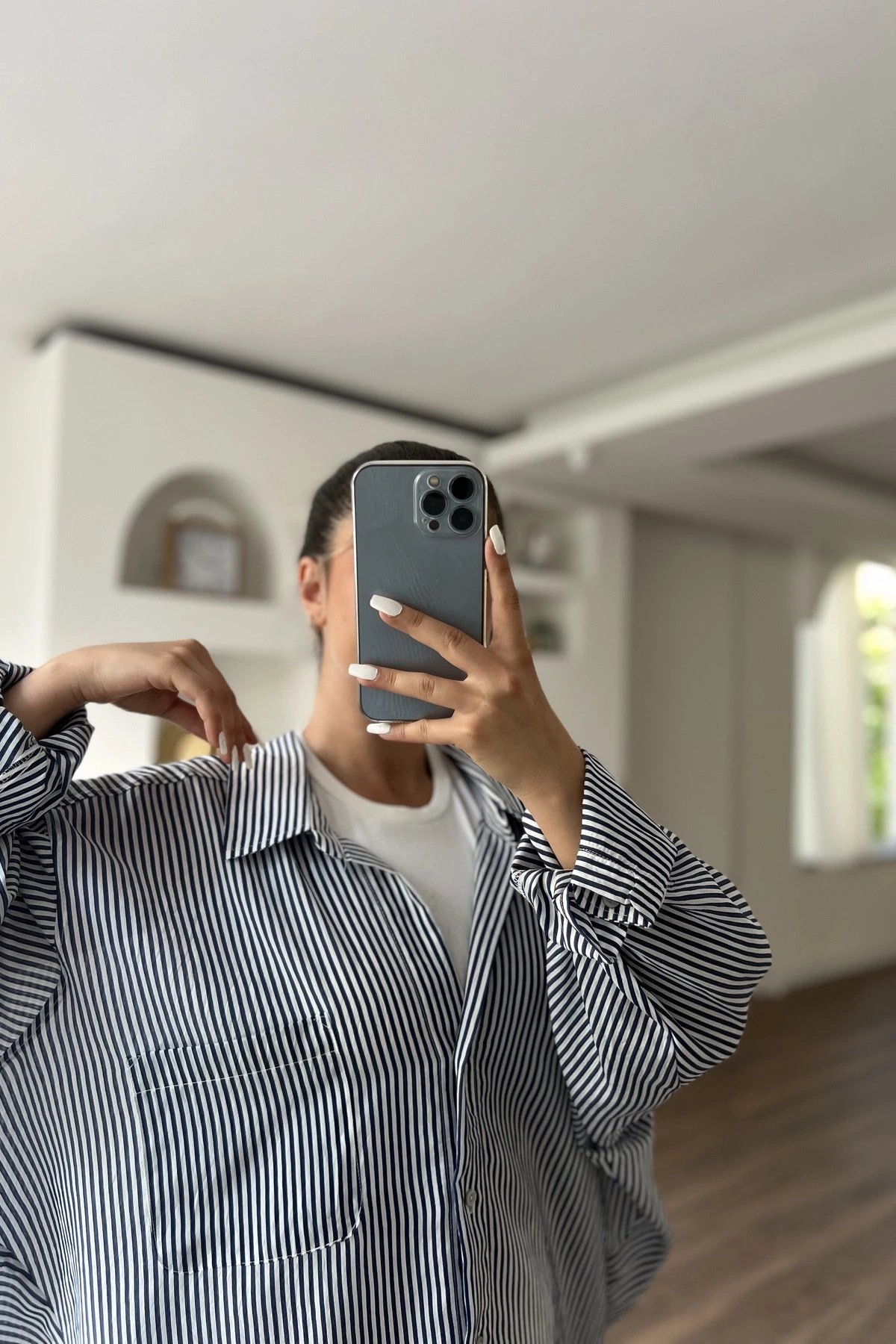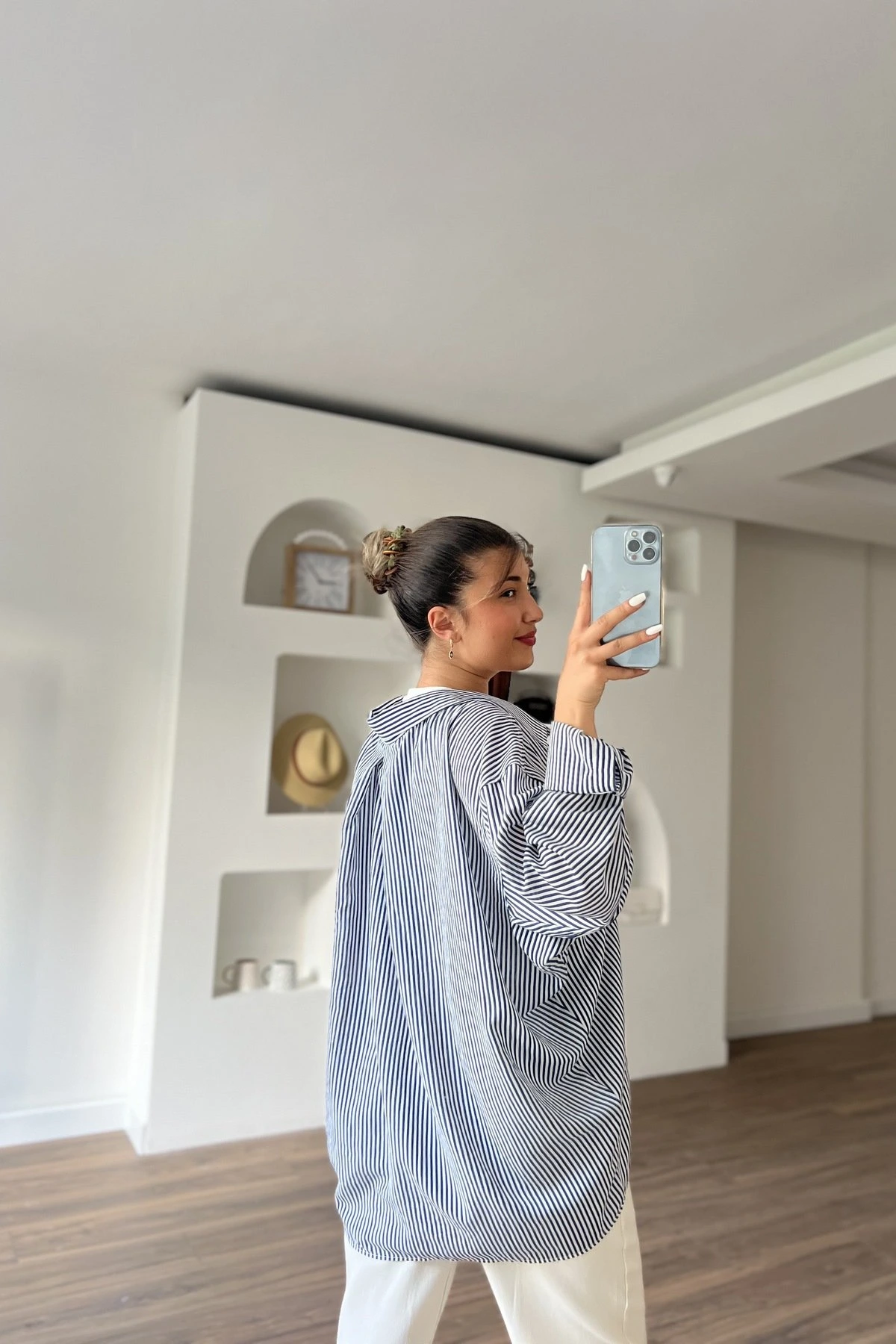 ARKA A PİLE V YAKA ÇİZGİLİ SALAŞ PAMUK GÖMLEK – LACİVERT