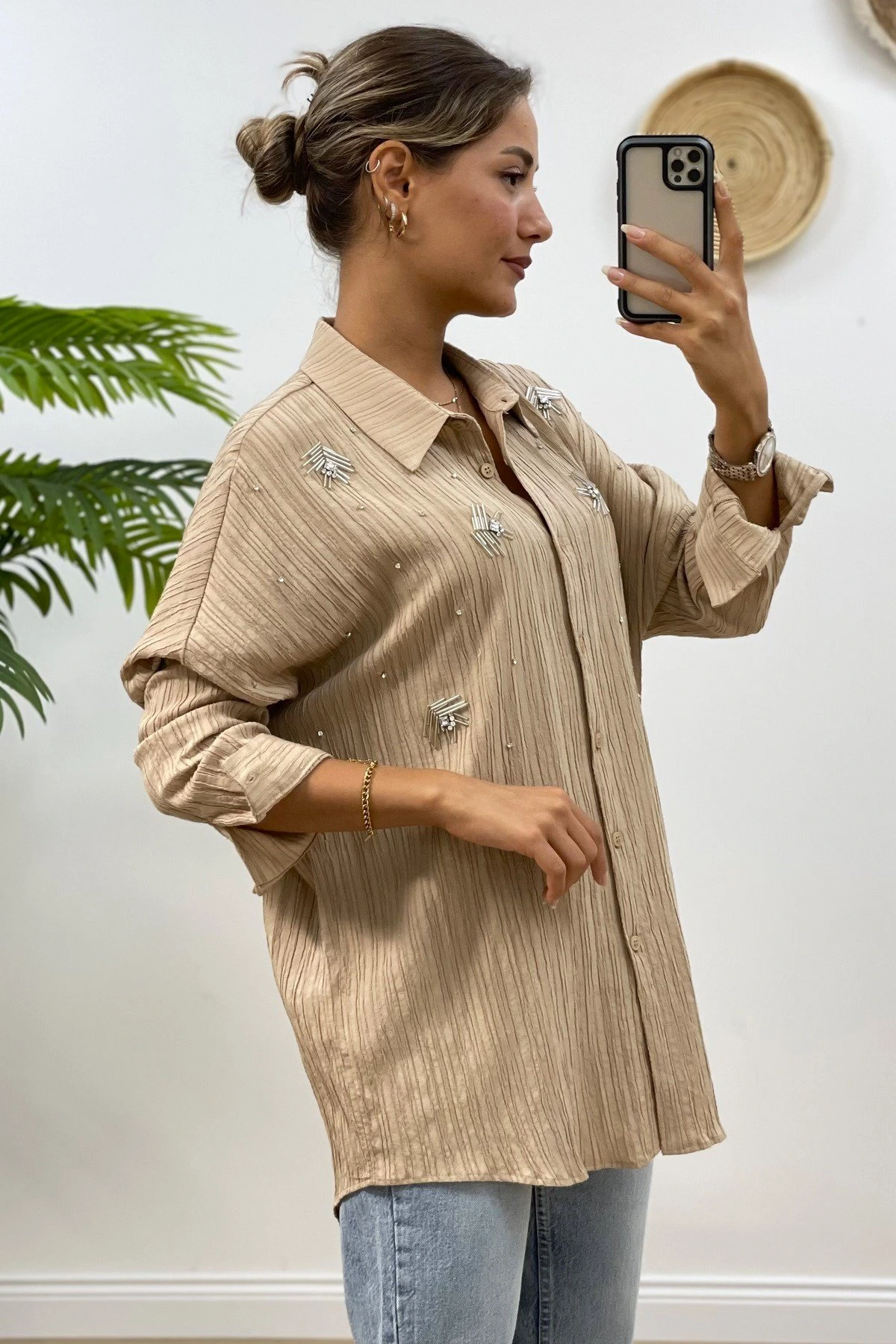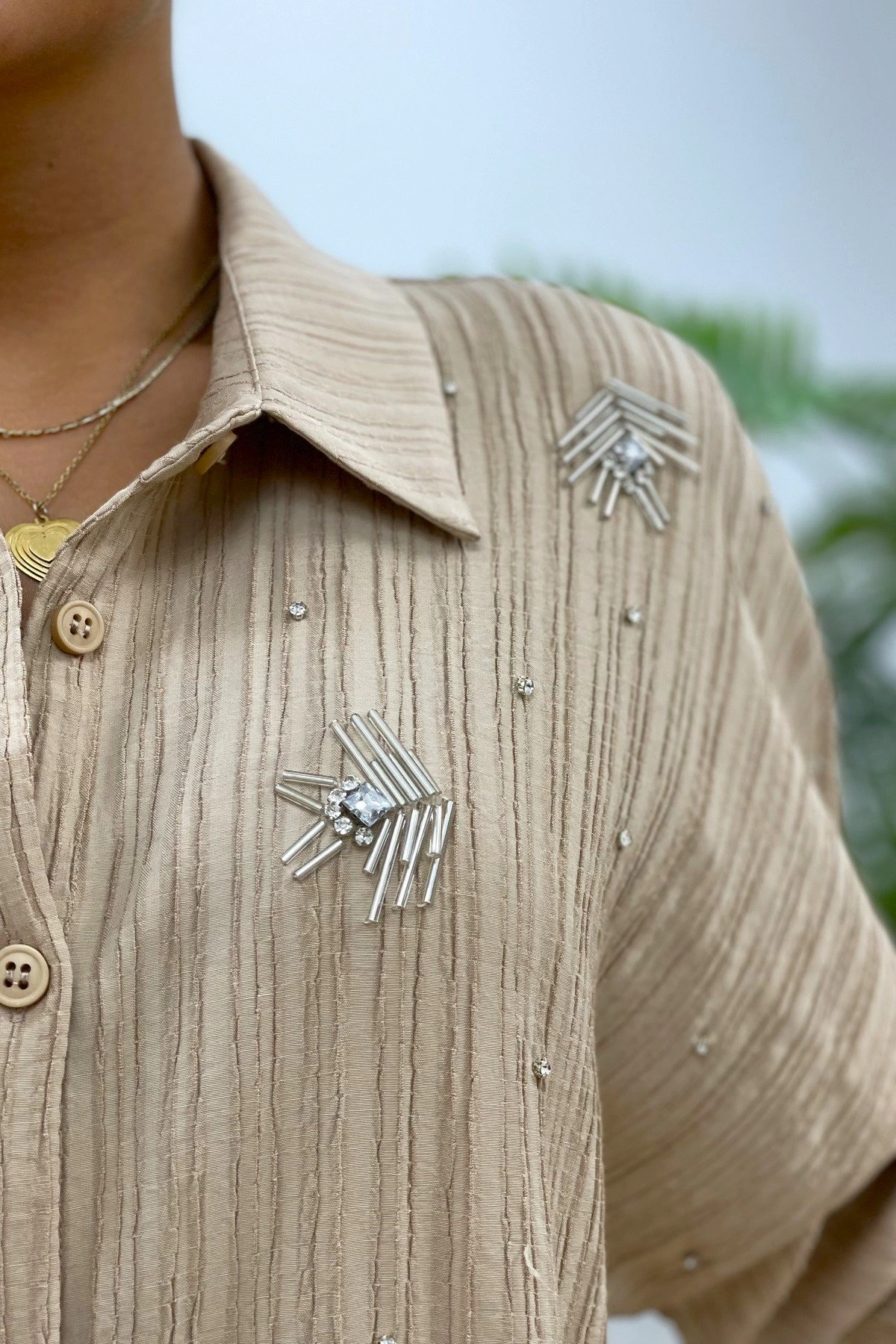 ARKA UZUN TAŞ İŞLEME VİSKON GÖMLEK – BEJ