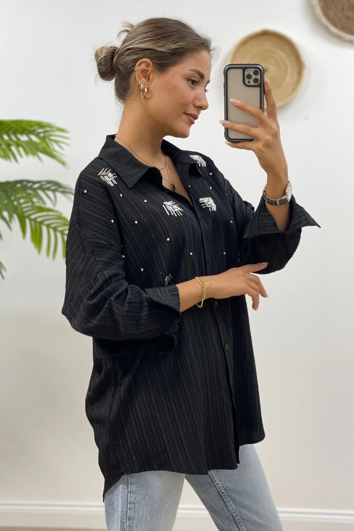 ARKA UZUN TAŞ İŞLEME VİSKON GÖMLEK – SİYAH