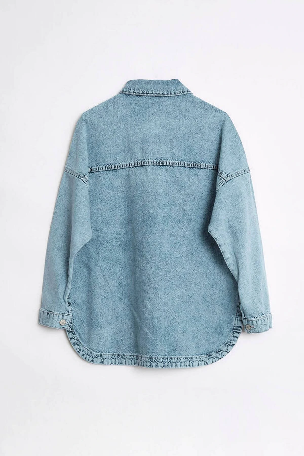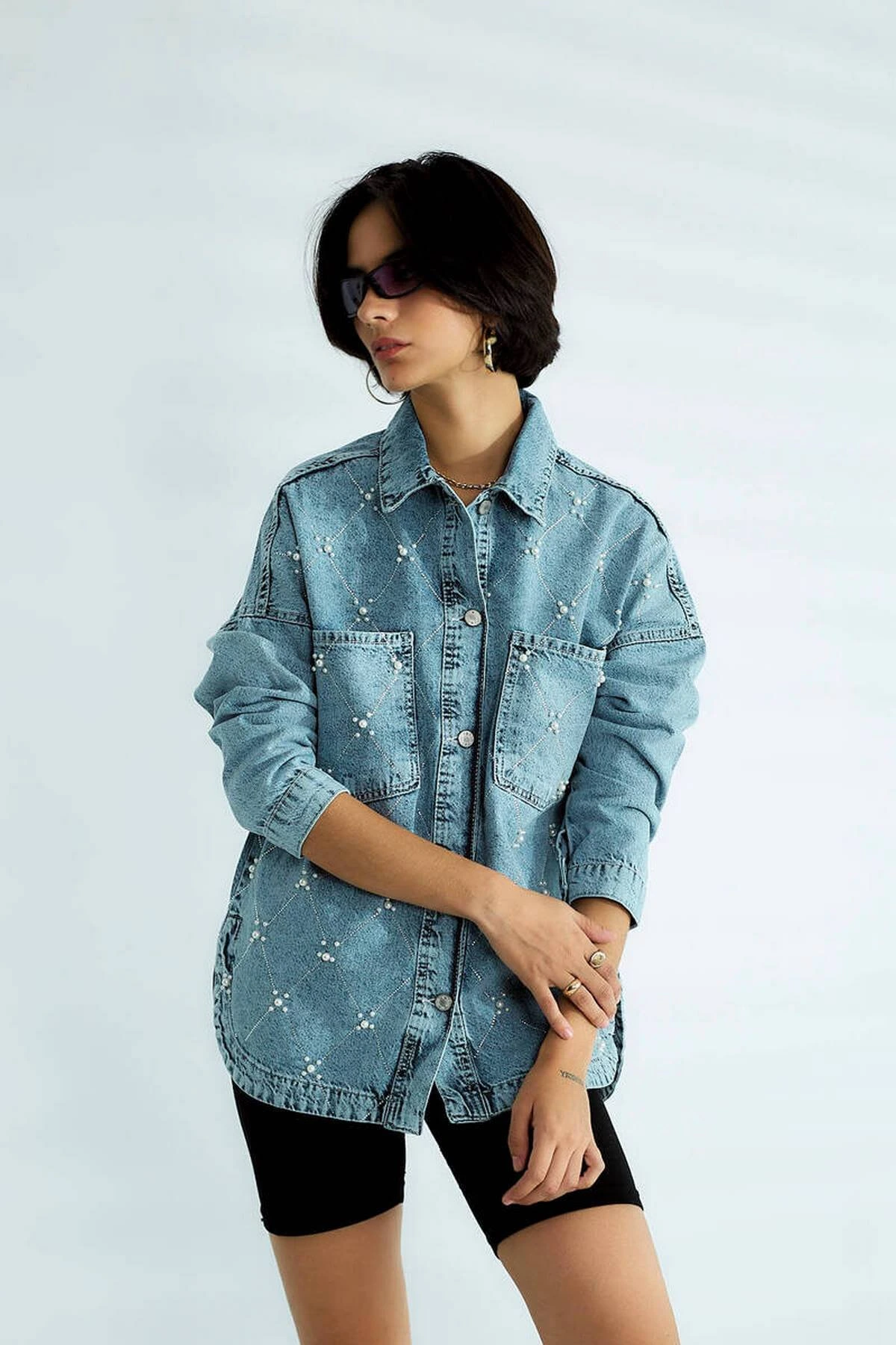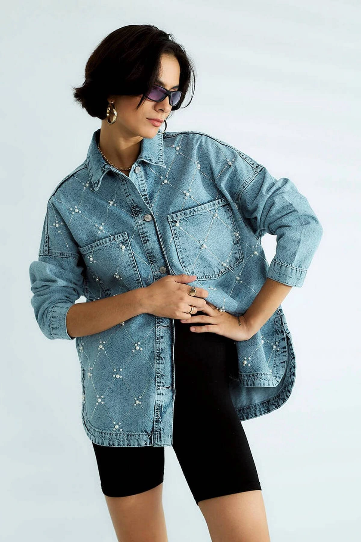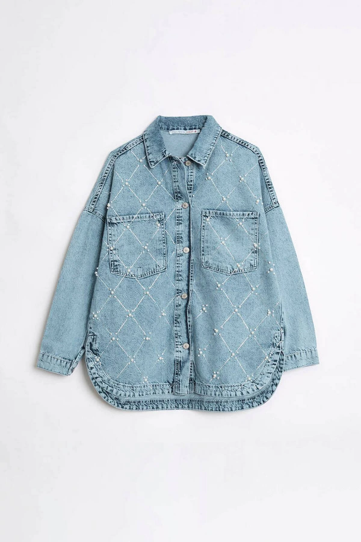 BAKLAVA TAŞ BASKI İNCİ ÇAKIM JEAN GÖMLEK – AÇIK MAVİ