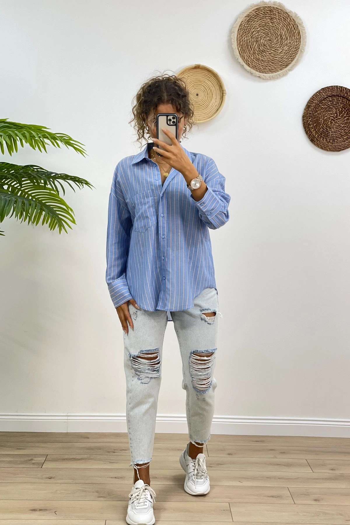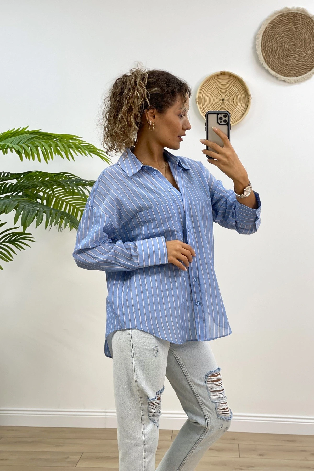 BASİC POPLİN TEK CEP ÇİZGİLİ GÖMLEK – MAVİ