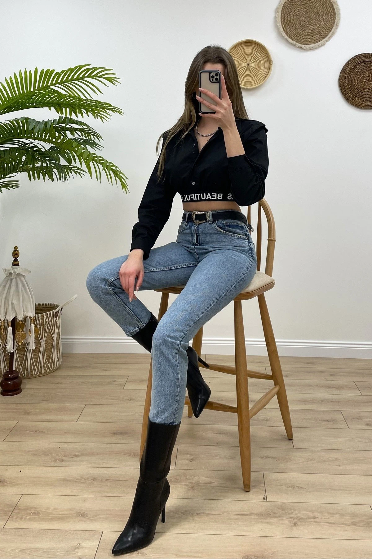 BEL LASTİK VATKALI CROP GÖMLEK – SİYAH