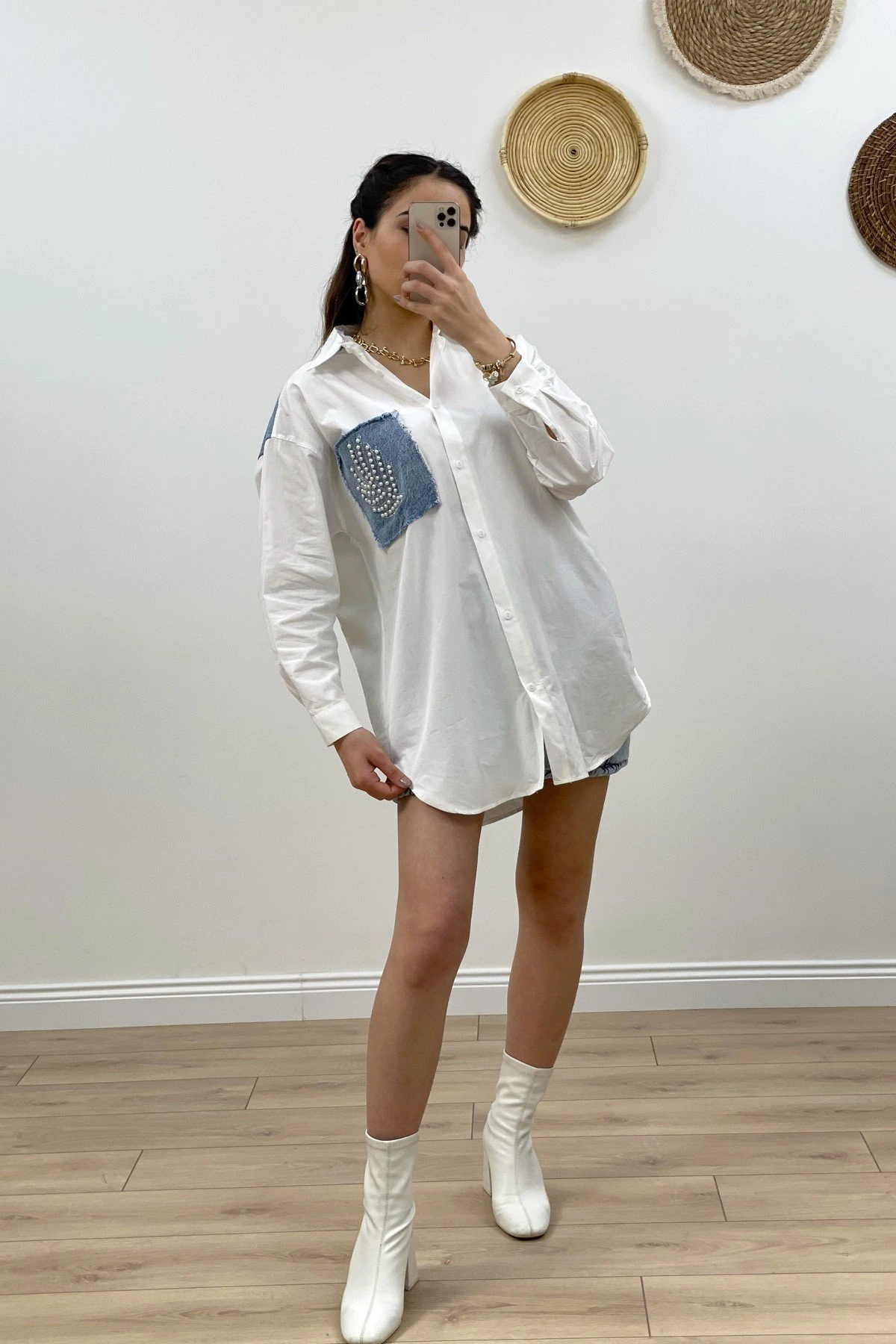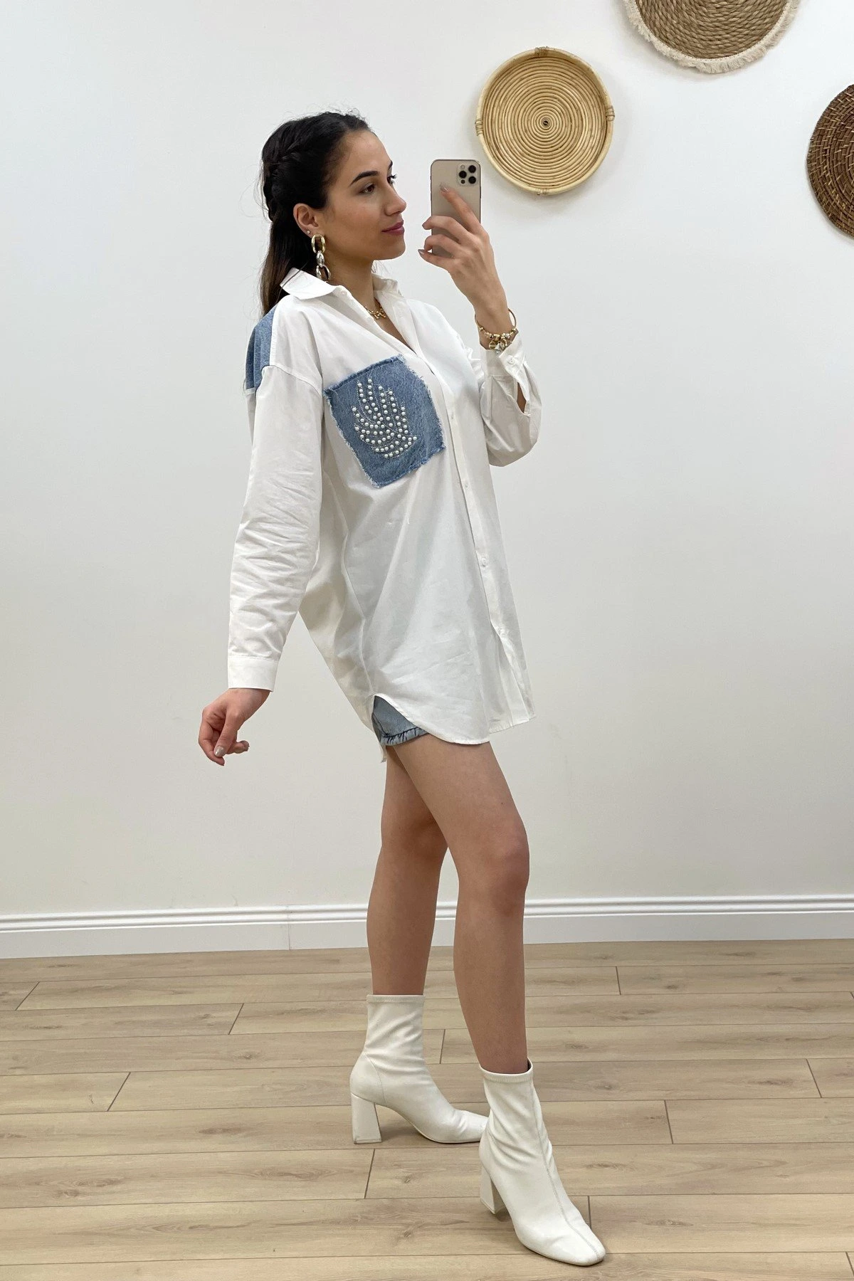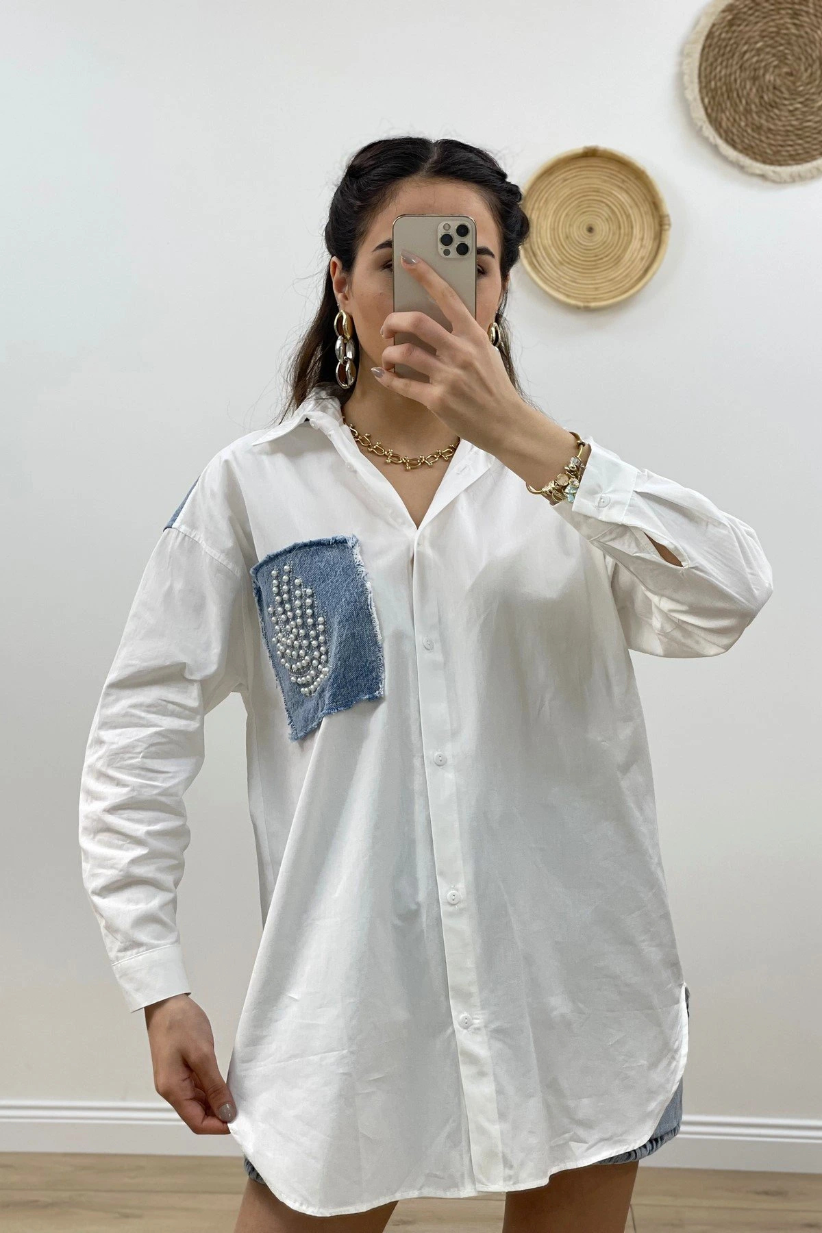 CEP İNCİLİ KOT DETAY GÖMLEK – EKRU