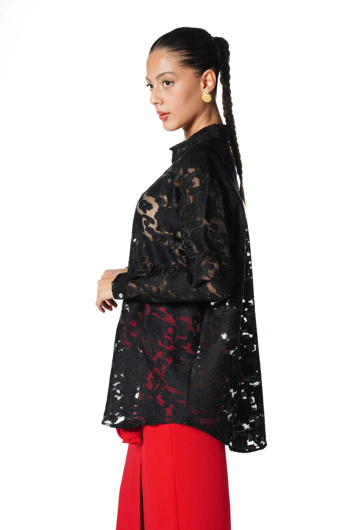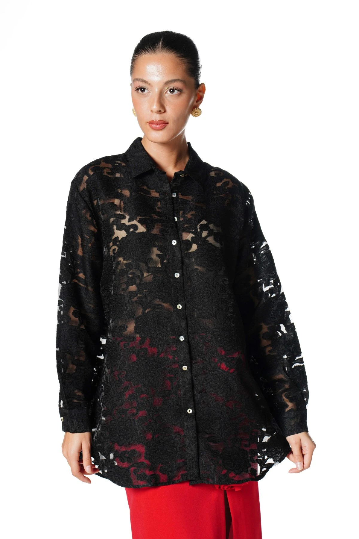 ÇİÇEK DESEN GÜPÜR VİSKON SALAŞ GÖMLEK – SİYAH