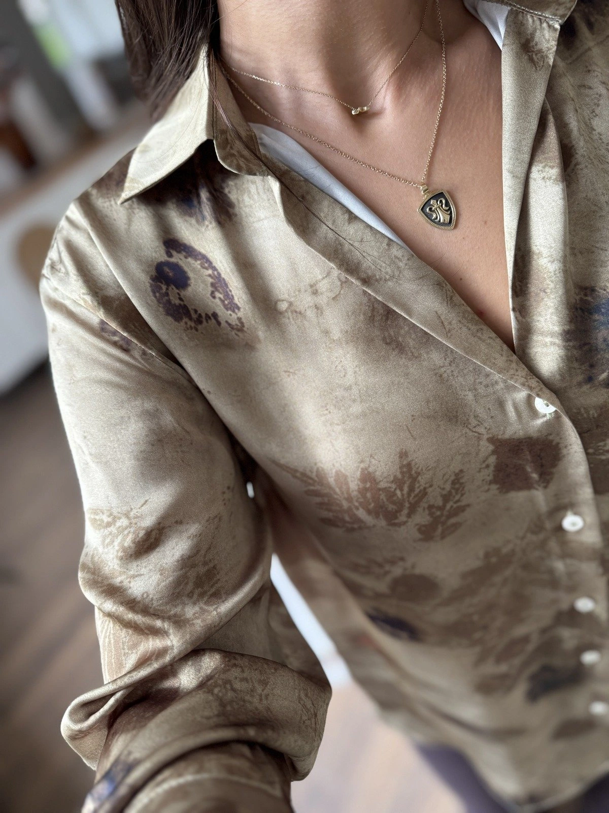 ÇİÇEK DESEN V YAKA SATEN GÖMLEK – HAKİ