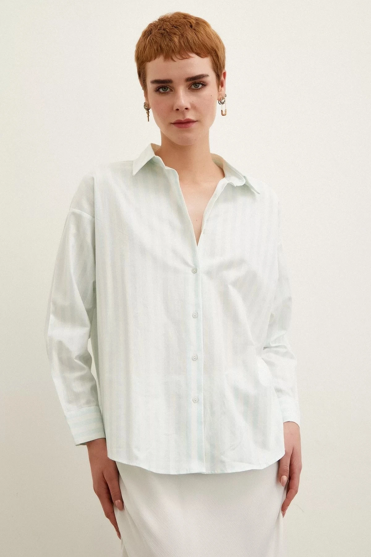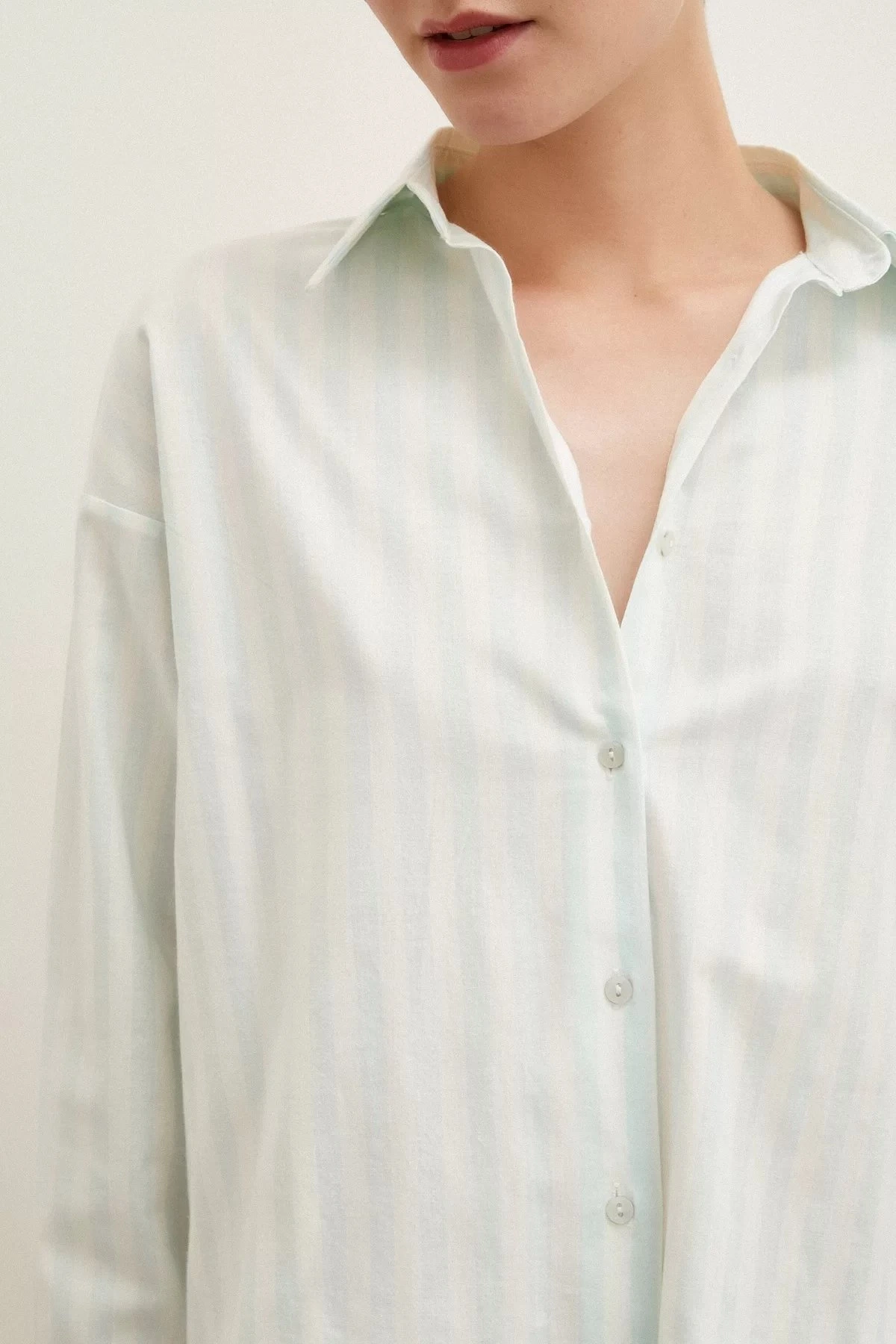 ÇİZGİLİ ARKA UZUN SALAŞ PAMIK GÖMLEK – MİNT YEŞİLİ