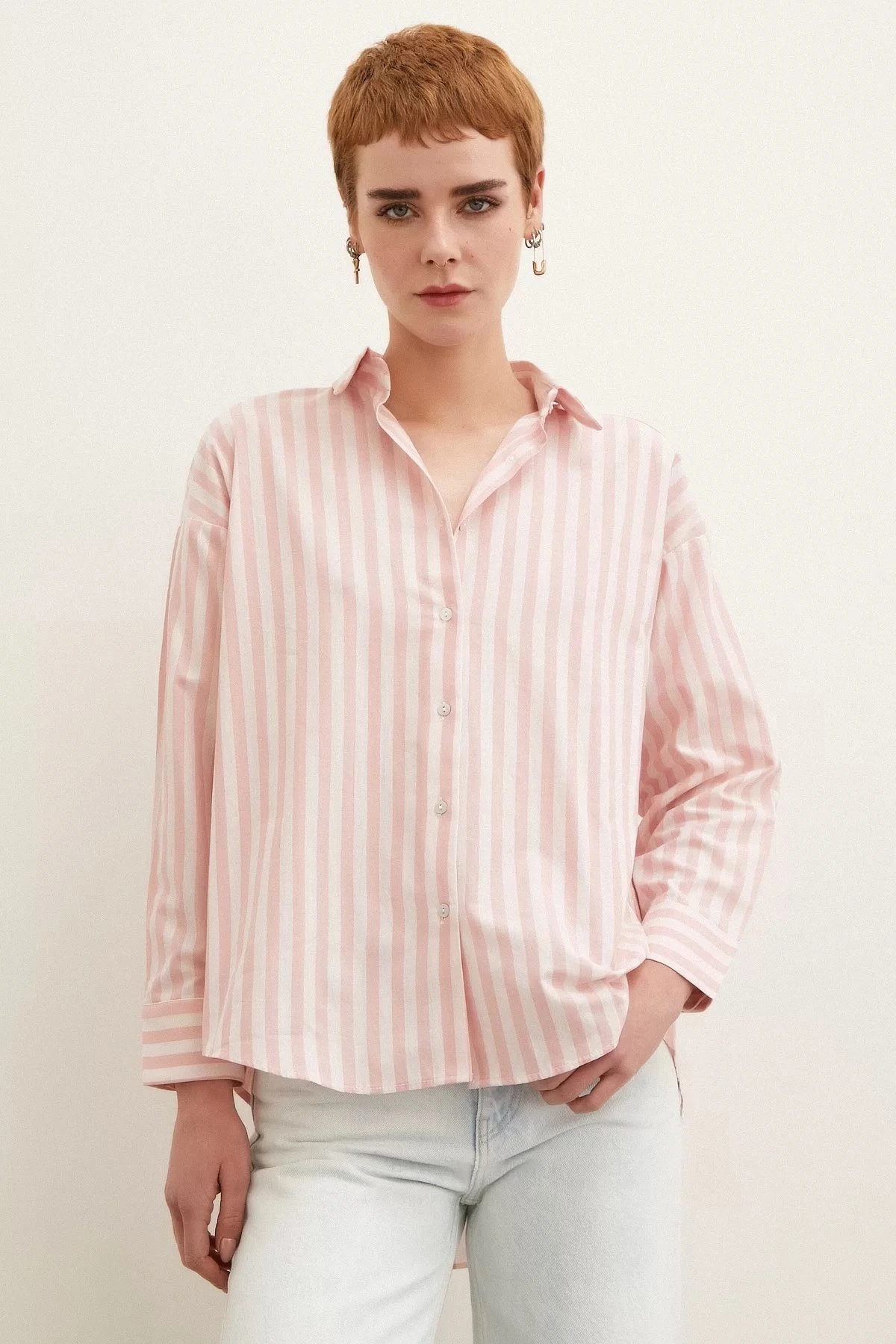 ÇİZGİLİ ARKA UZUN SALAŞ PAMIK GÖMLEK – PEMBE