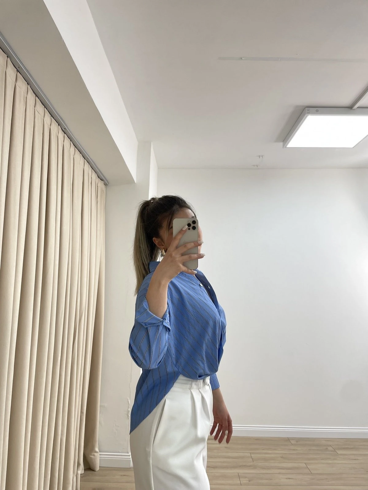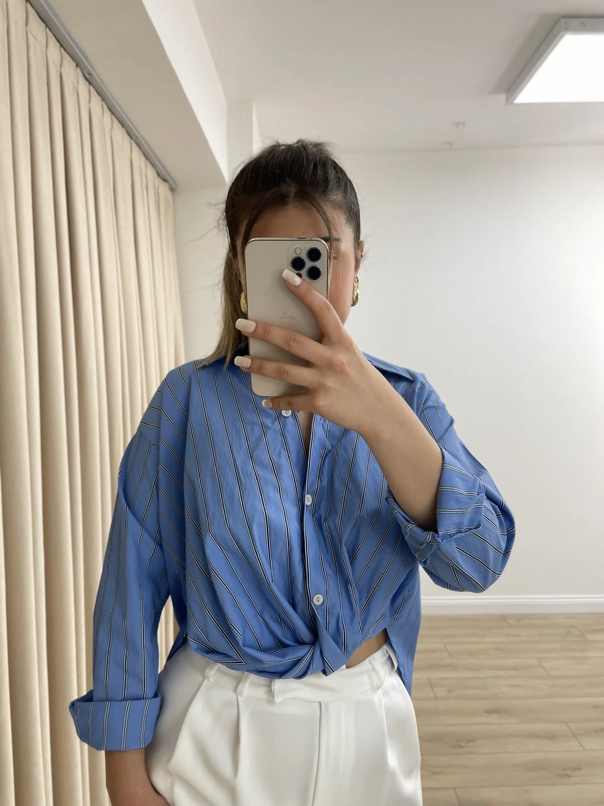 ÇİZGİLİ ÖN DÜĞÜMLÜ ARK UZUN GÖMLEK – MAVİ