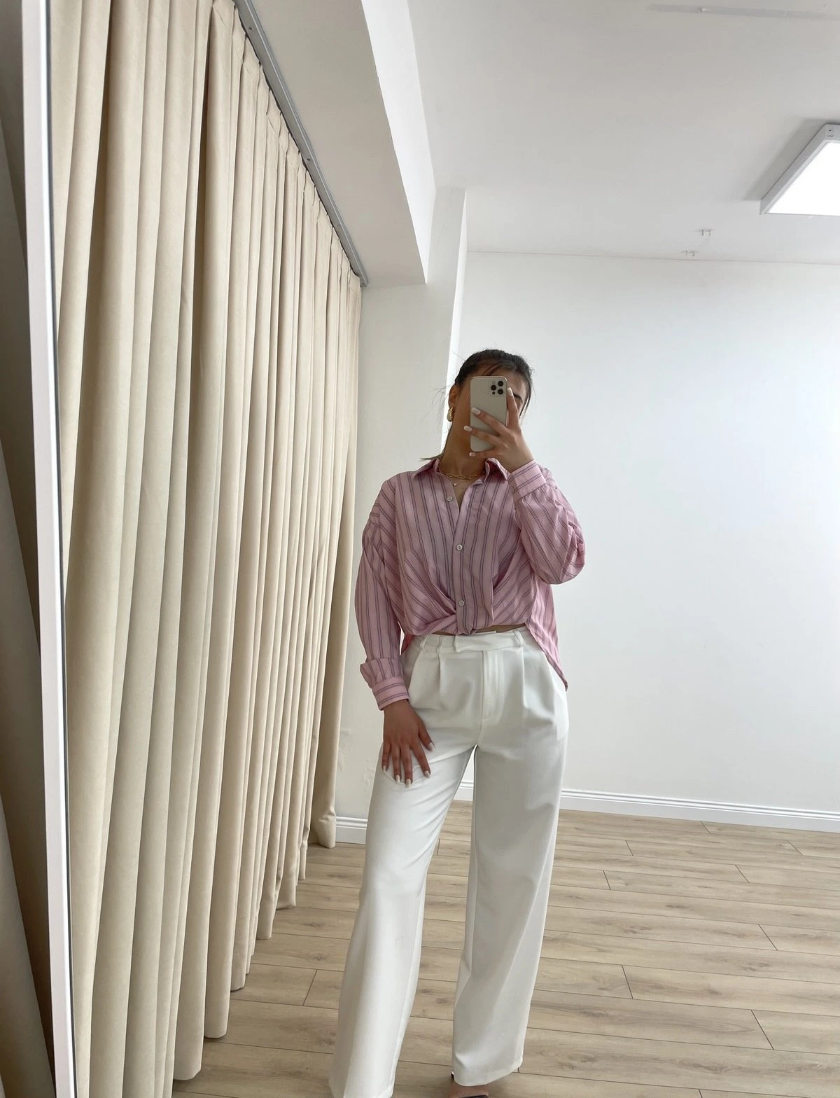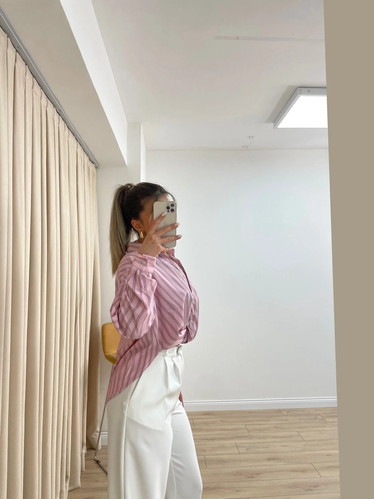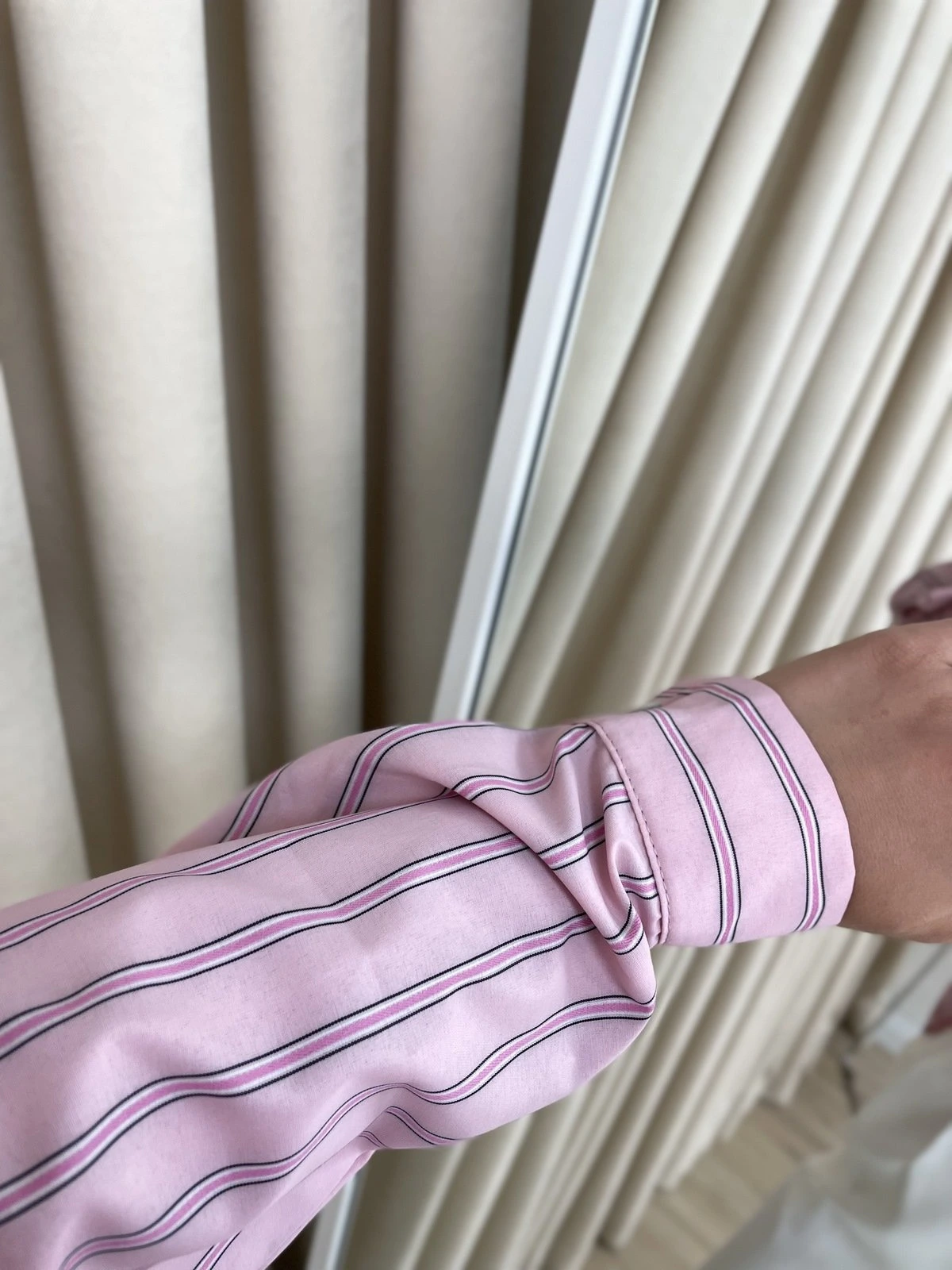 ÇİZGİLİ ÖN DÜĞÜMLÜ ARK UZUN GÖMLEK – PEMBE
