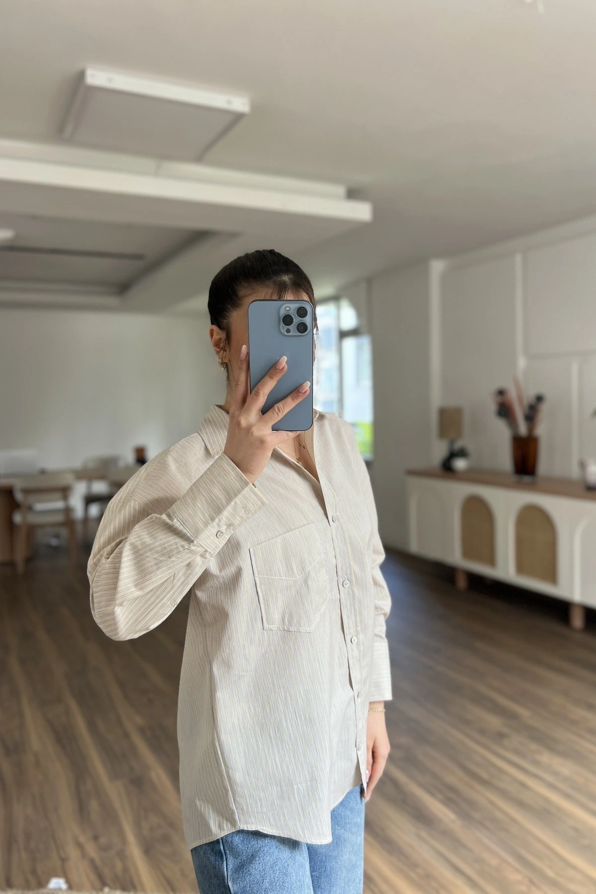 ÇİZGİLİ OVERSİZE TEK CEP PAMUK GÖMLEK – BEJ