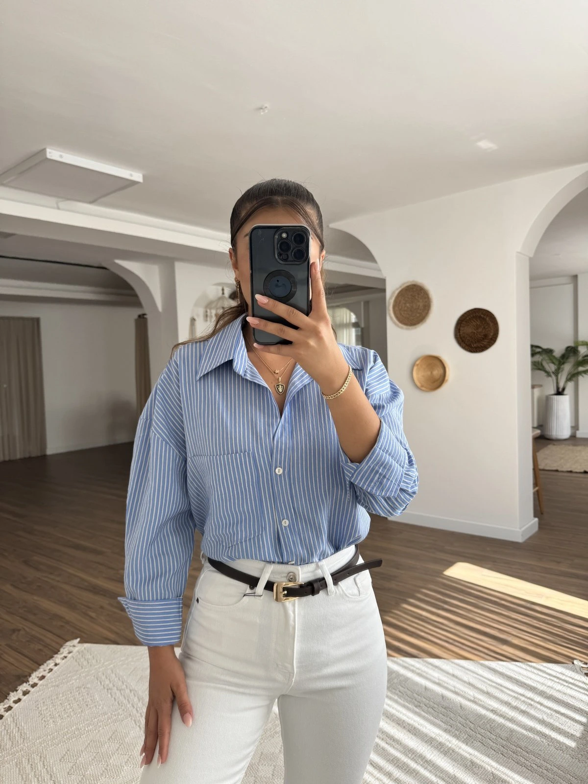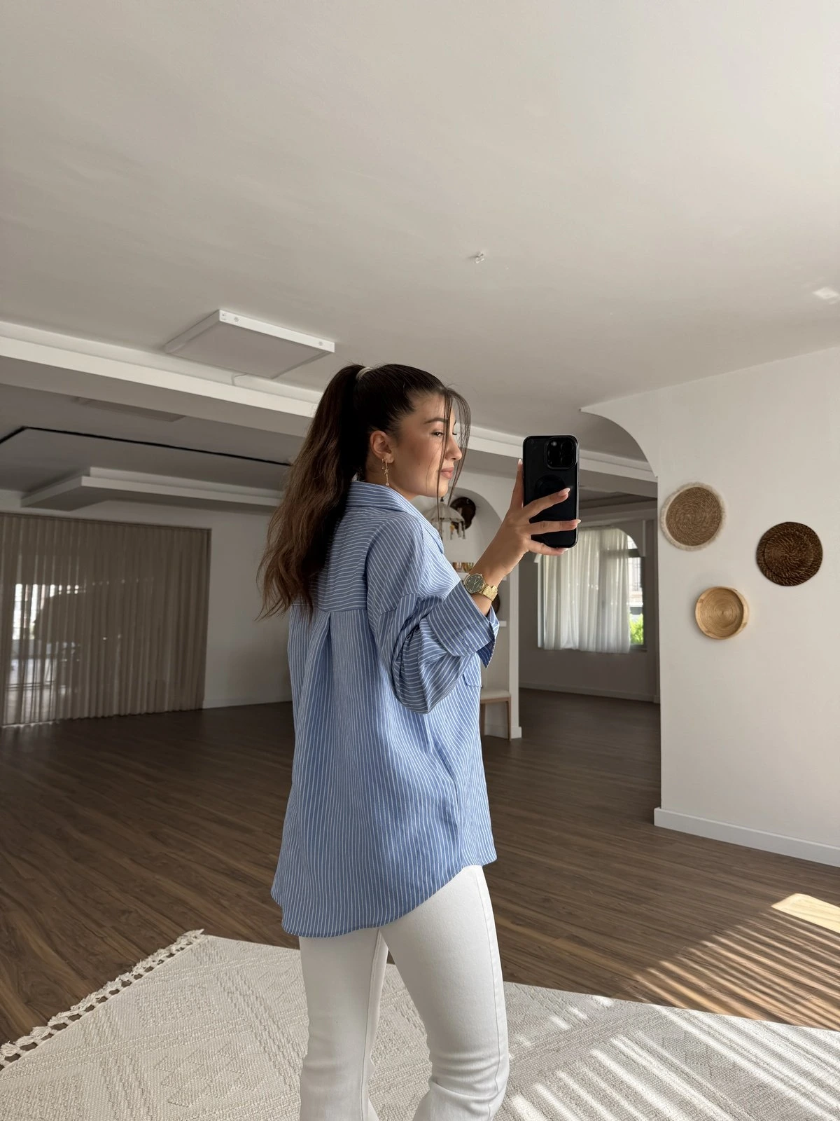 ÇİZGİLİ OVERSİZE TEK CEP PAMUK GÖMLEK – MAVİ