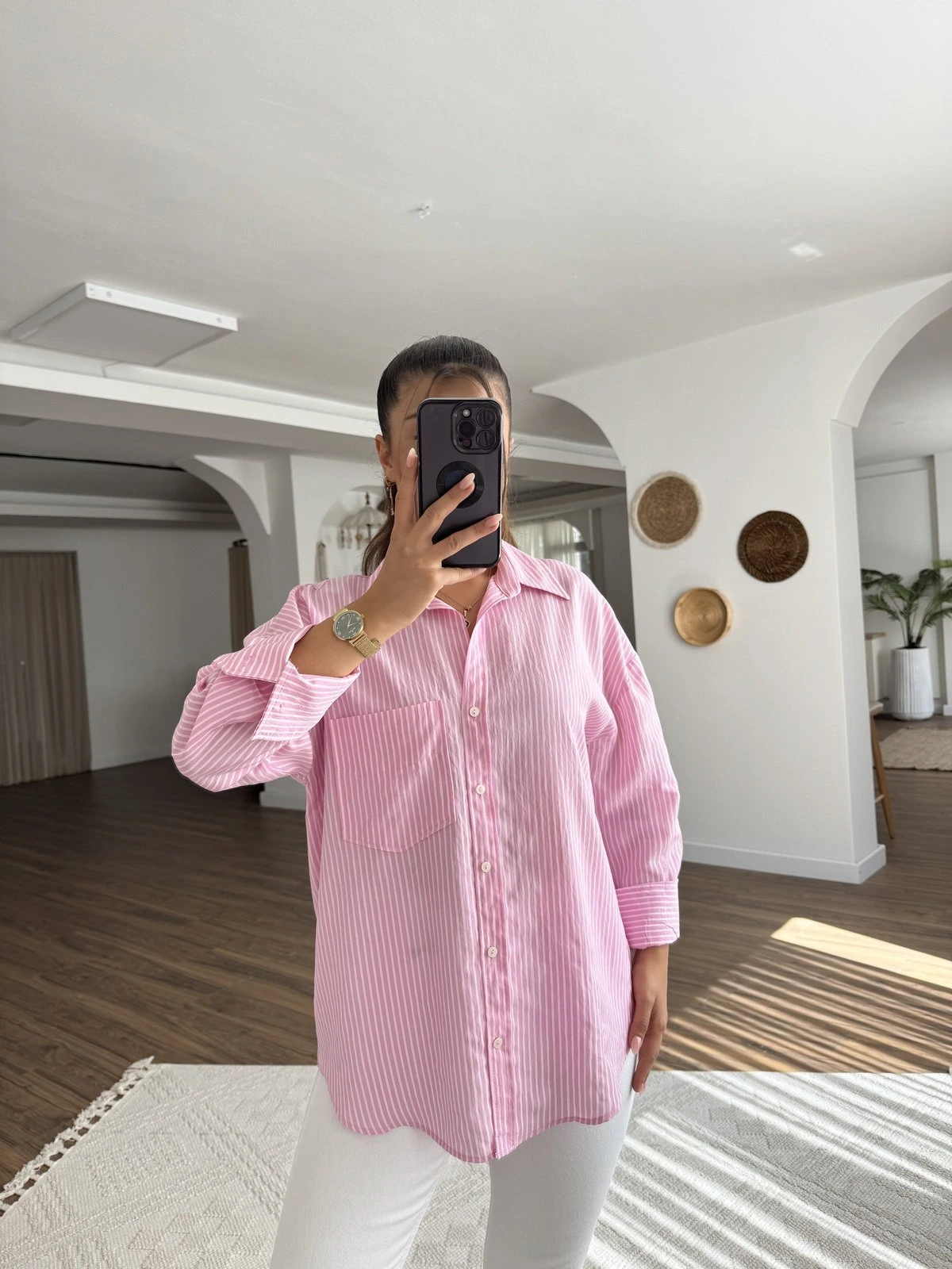 ÇİZGİLİ OVERSİZE TEK CEP PAMUK GÖMLEK – PEMBE