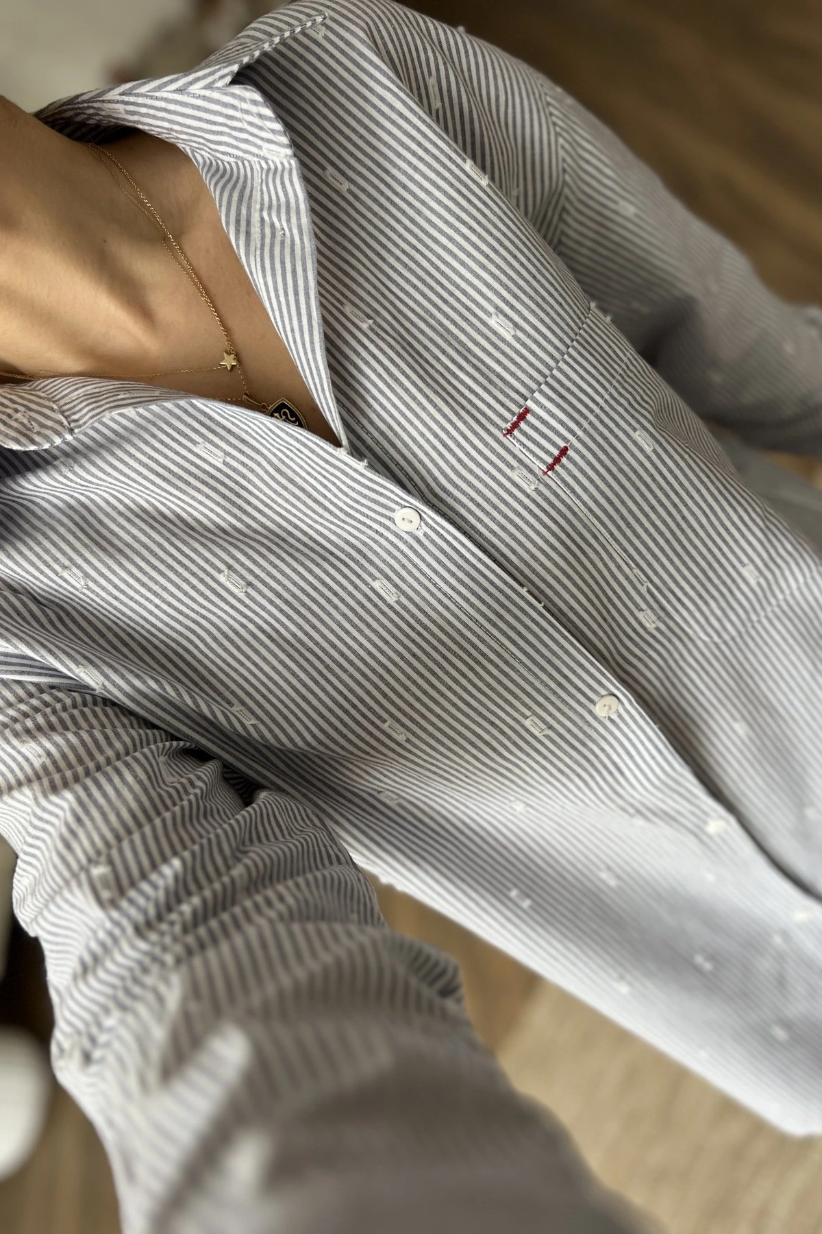 ÇİZGİLİ SERPME DOKU TEK CEP PAMUK SALAŞ GÖMLEK – LACİVERT