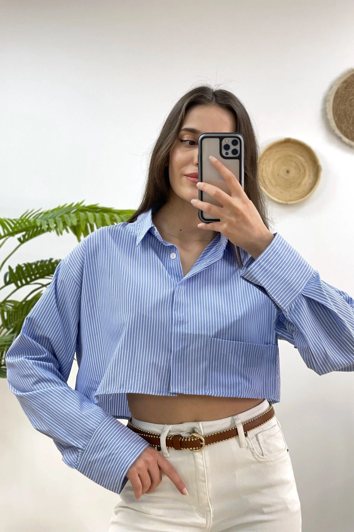ÇİZGİLİ TEK CEP CROP SALAŞ GÖMLEK – MAVİ