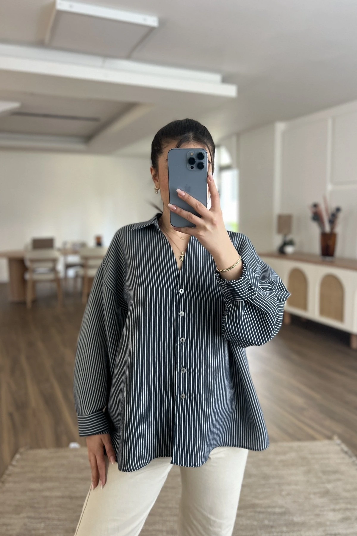 ÇİZGİLİ V YAKA SALAŞ MODAL GÖMLEK – LACİVERT