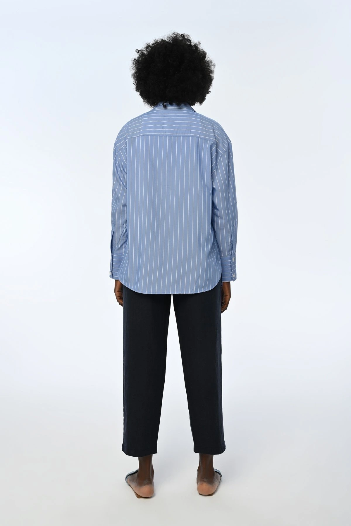 ÇİZGİLİ V YAKA YAN YIRTMAÇ MODAL GÖMLEK – MAVİ