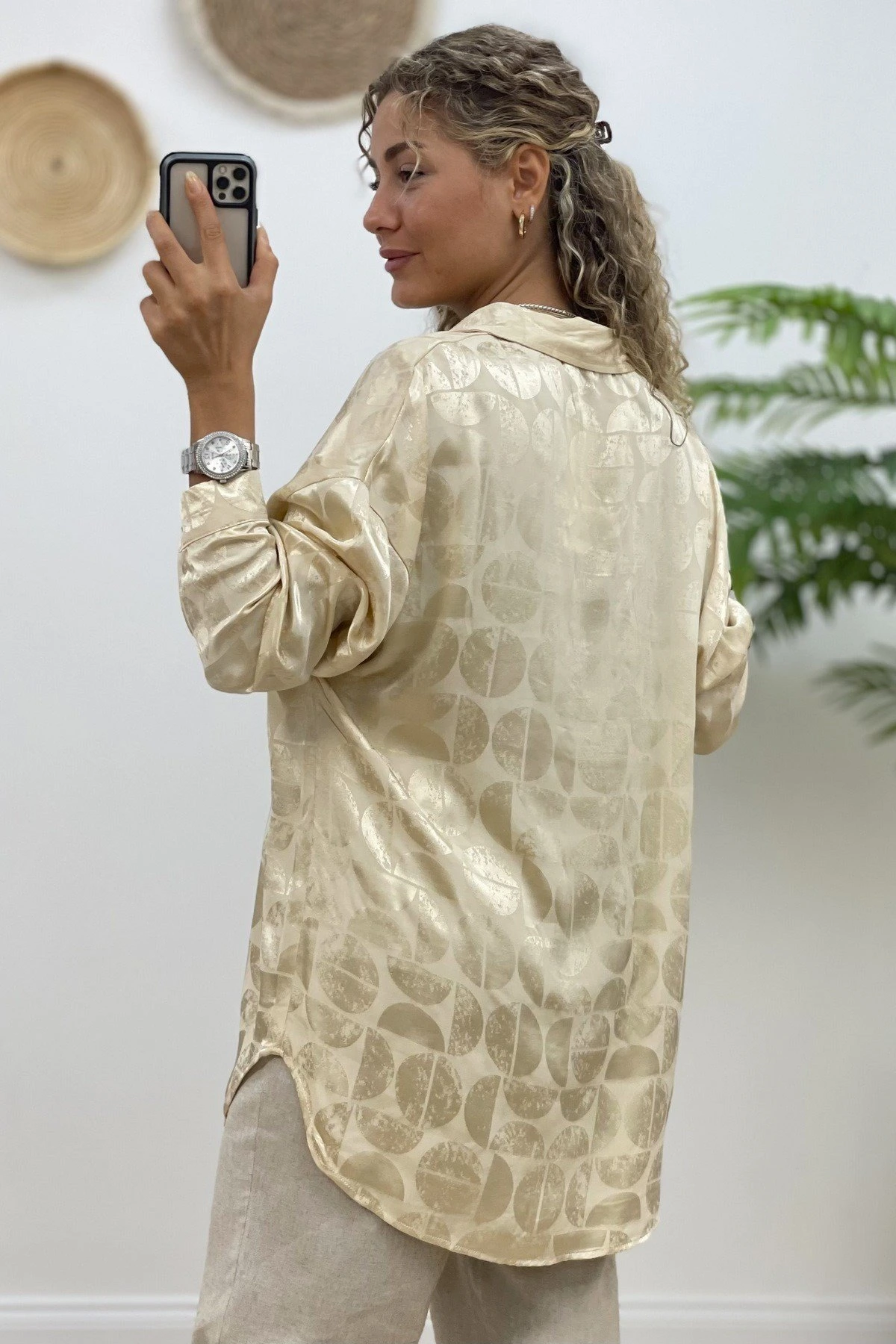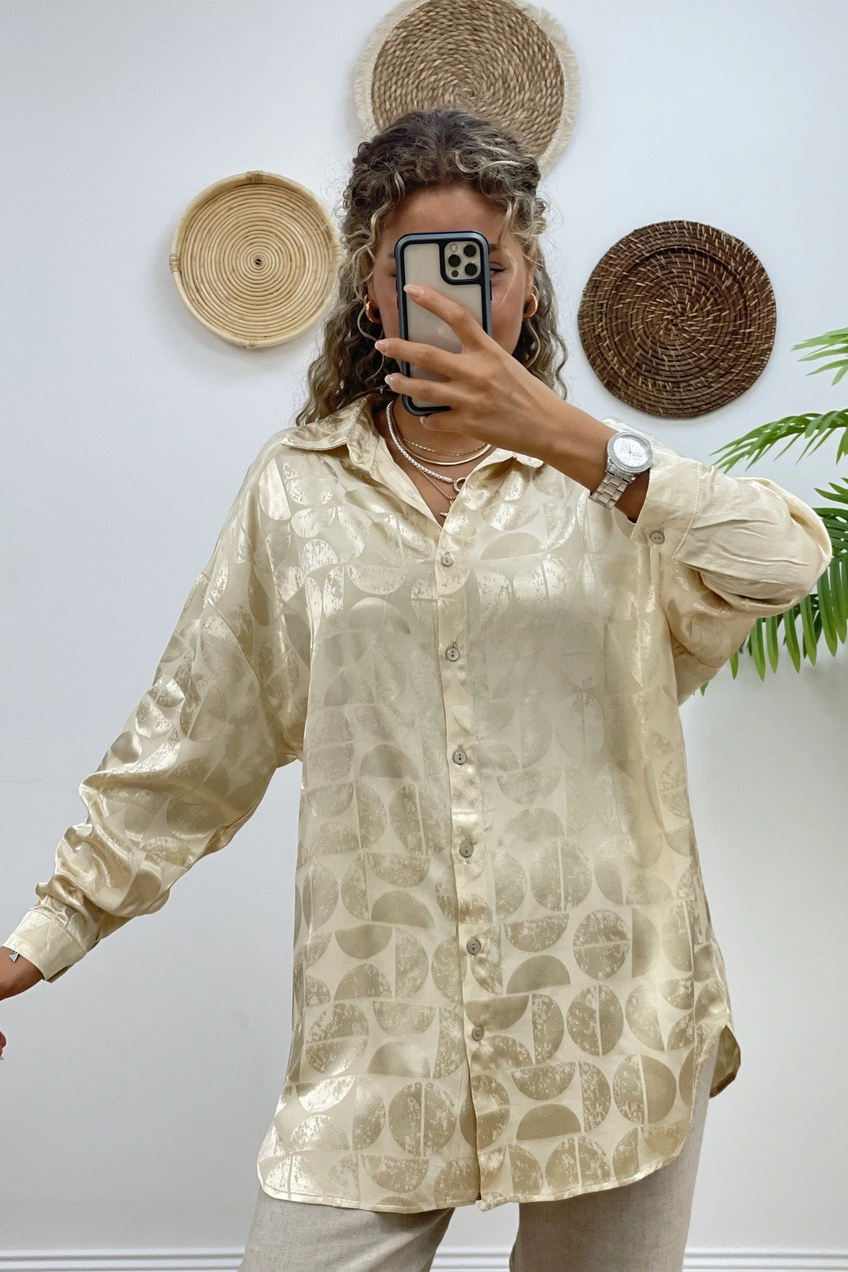 DAİRE DESEN SALAŞ SATEN GÖMLEK – BEJ