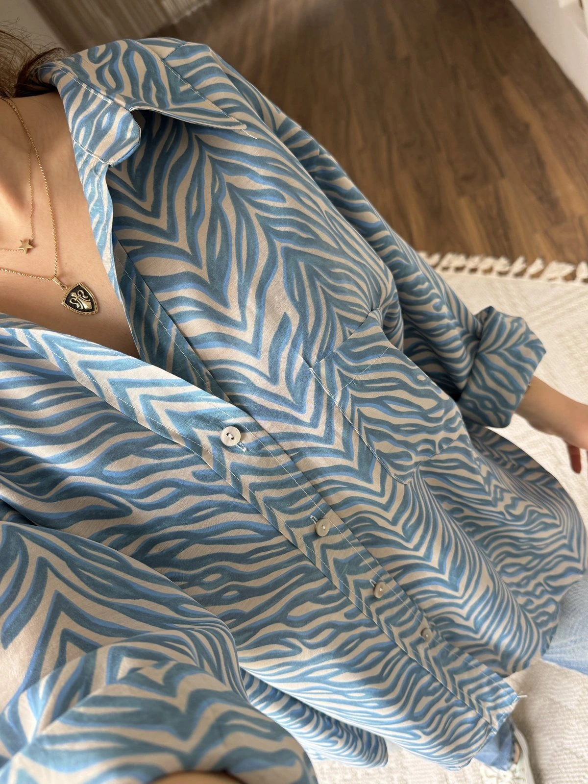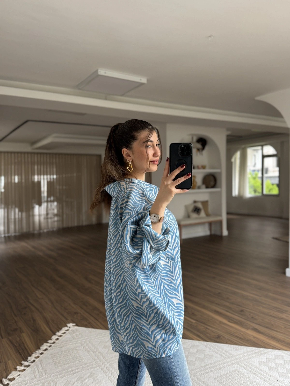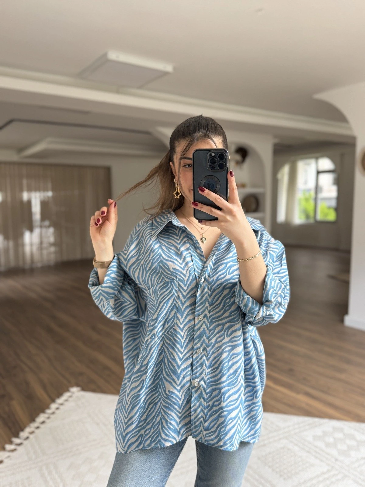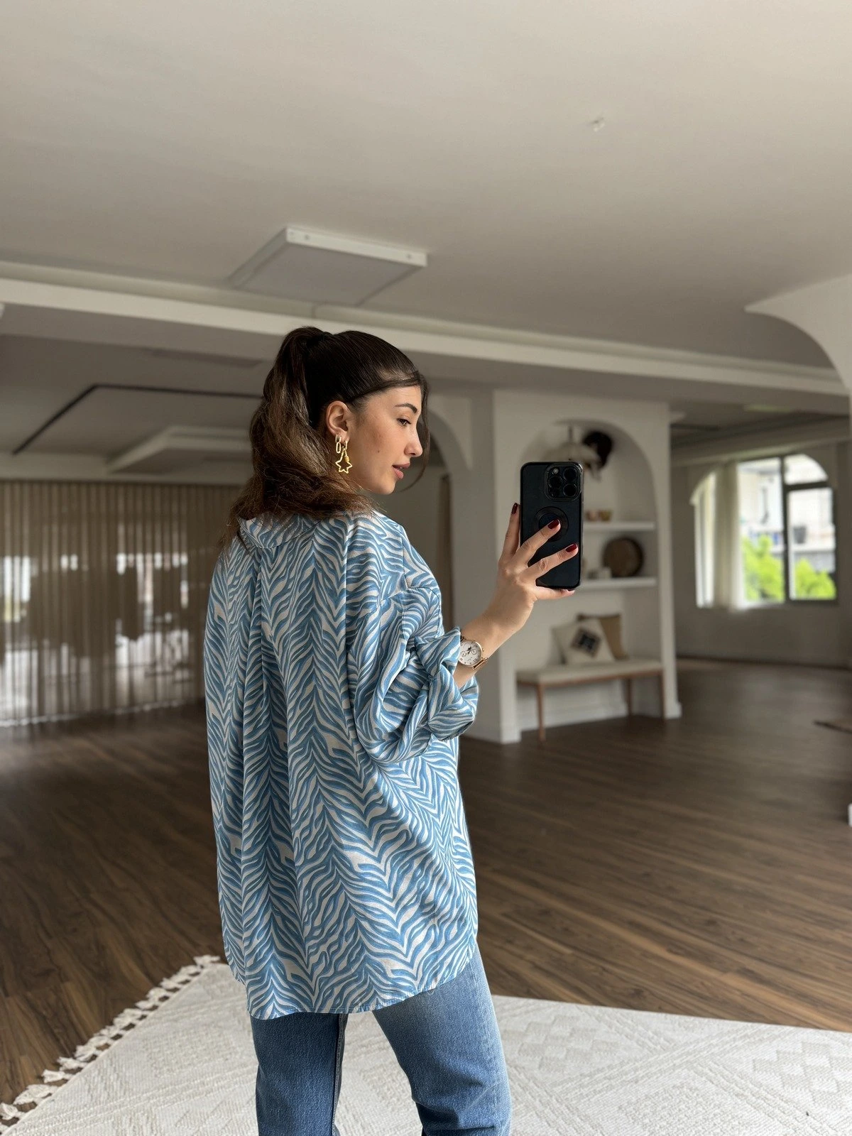 DESENLİ ARKA PİLE OVERSİZE MODAL GÖMLEK – İNDİGO