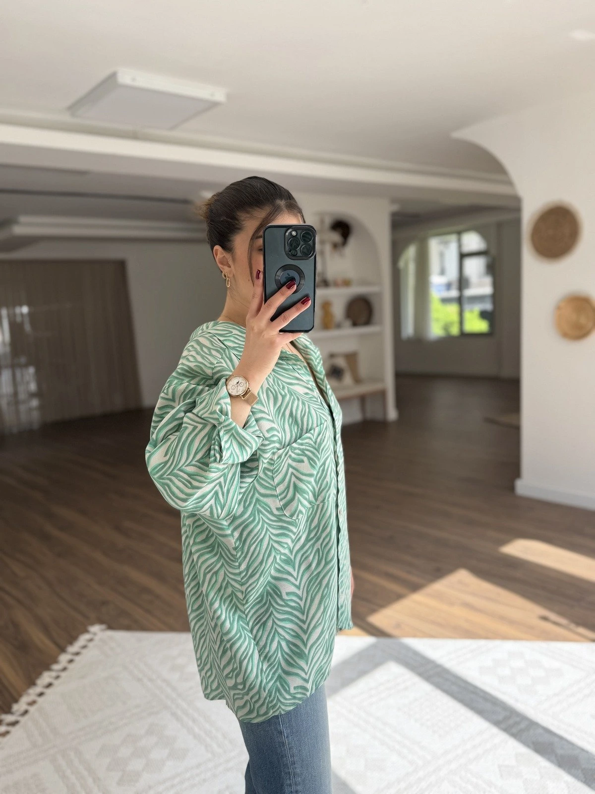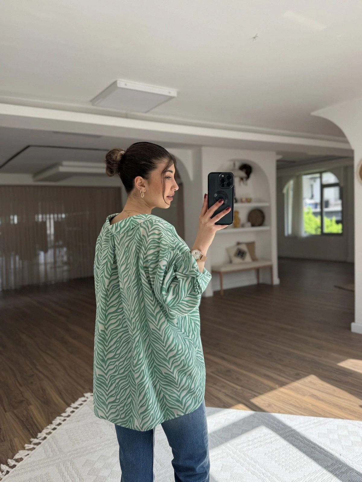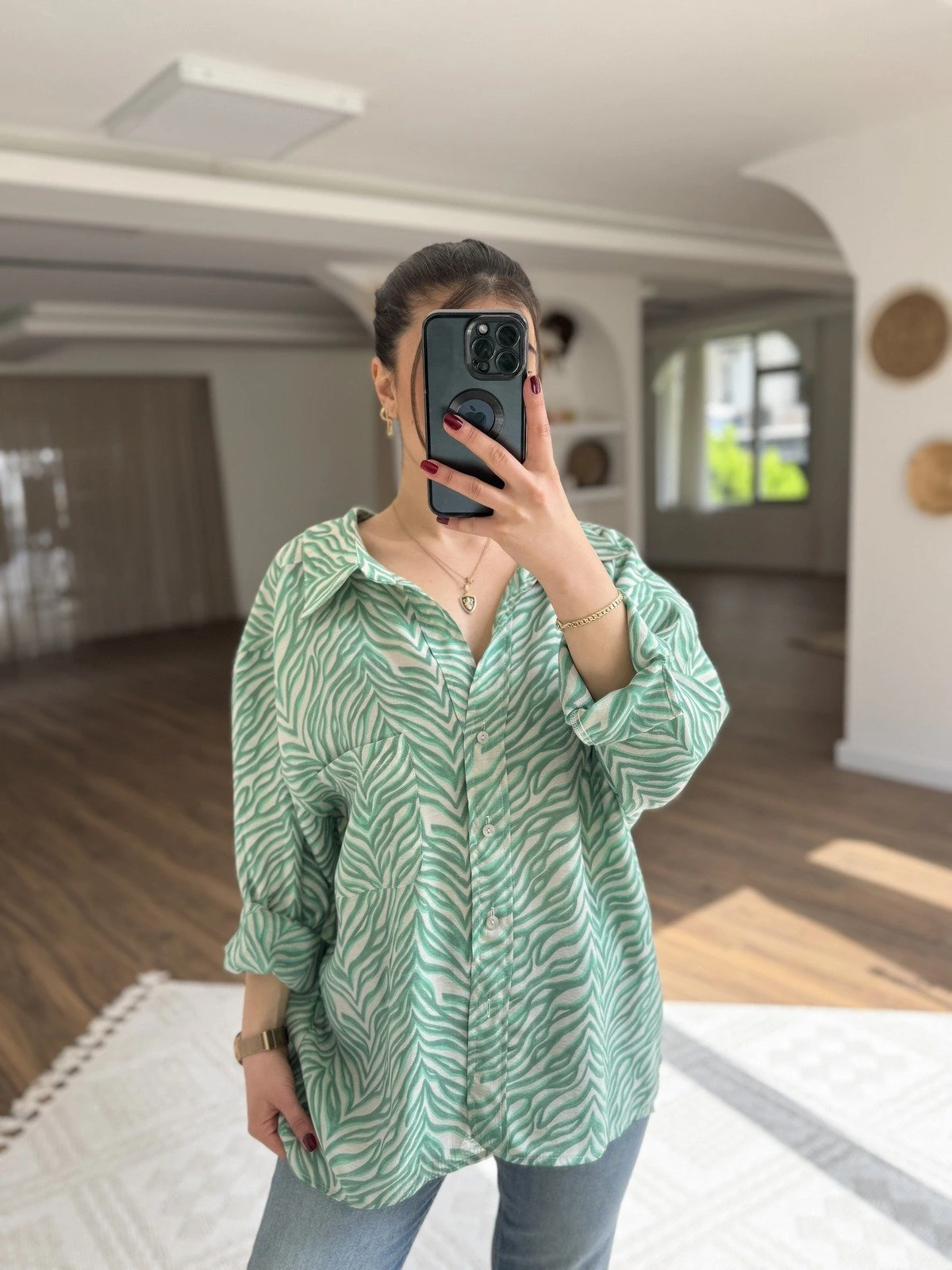 DESENLİ ARKA PİLE OVERSİZE MODAL GÖMLEK – ZÜMRÜT YEŞİL