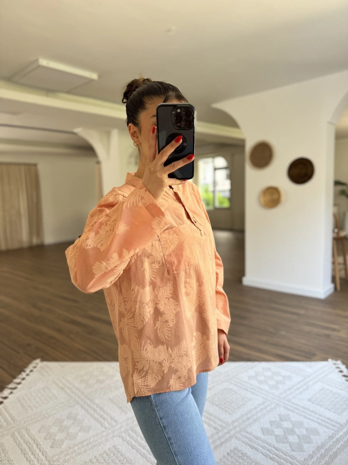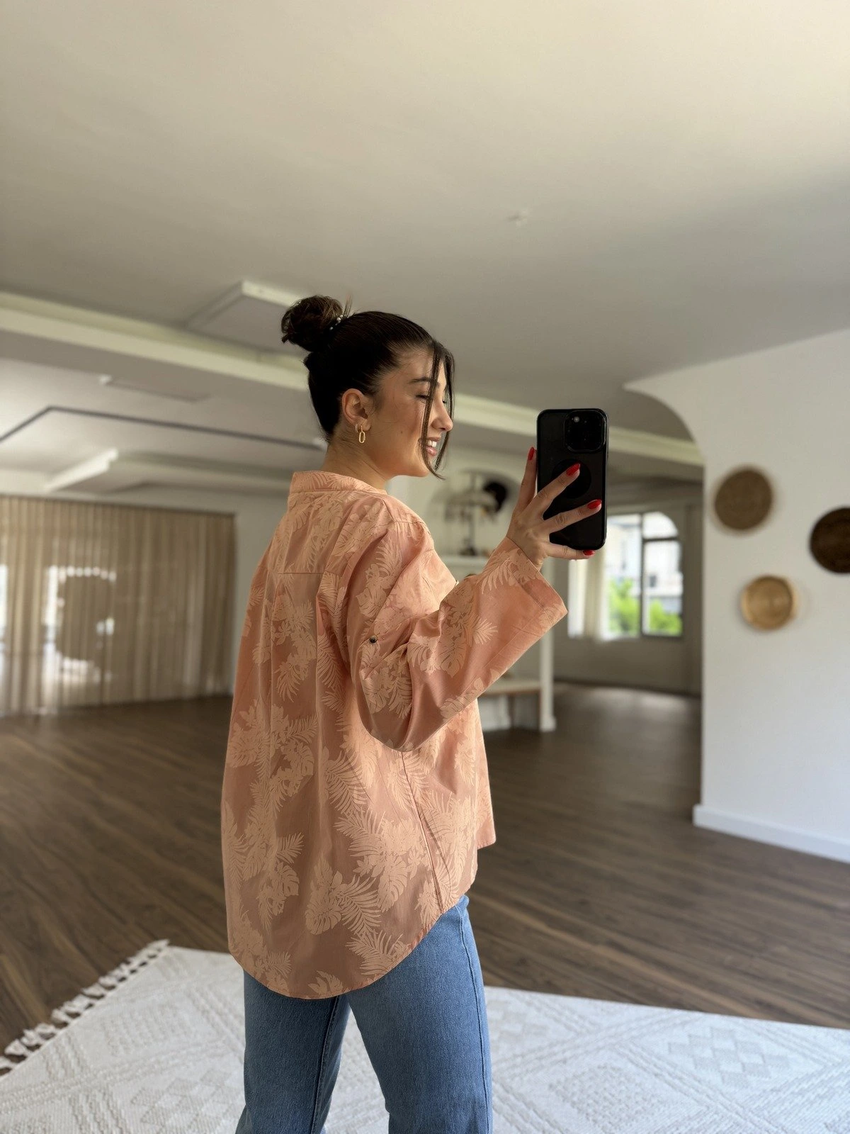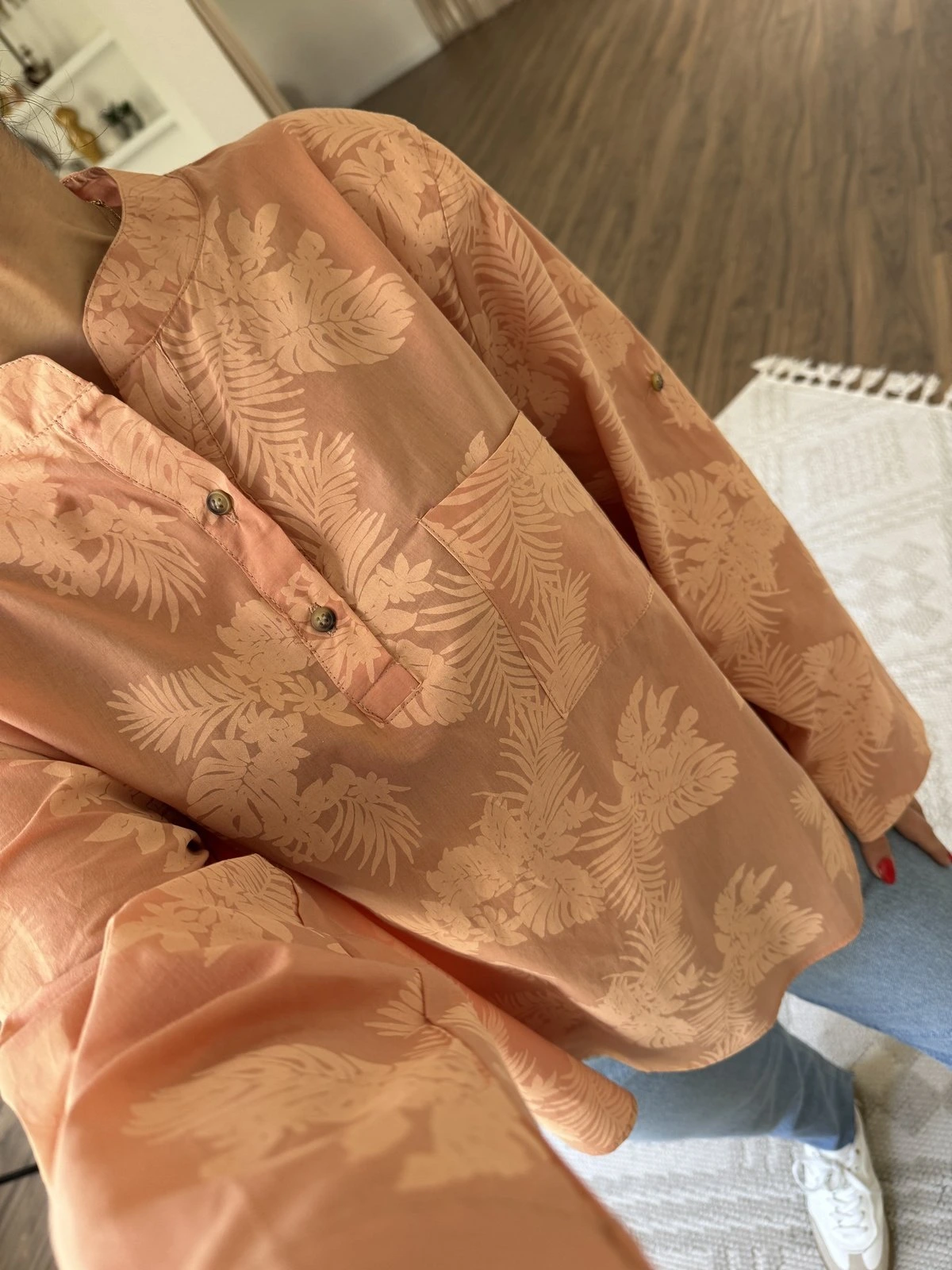 DİK YAKA YARI PATLI YAPRAK BASKI DESEN PAMUK VUAL SALAŞ GÖMLEK – SOMON