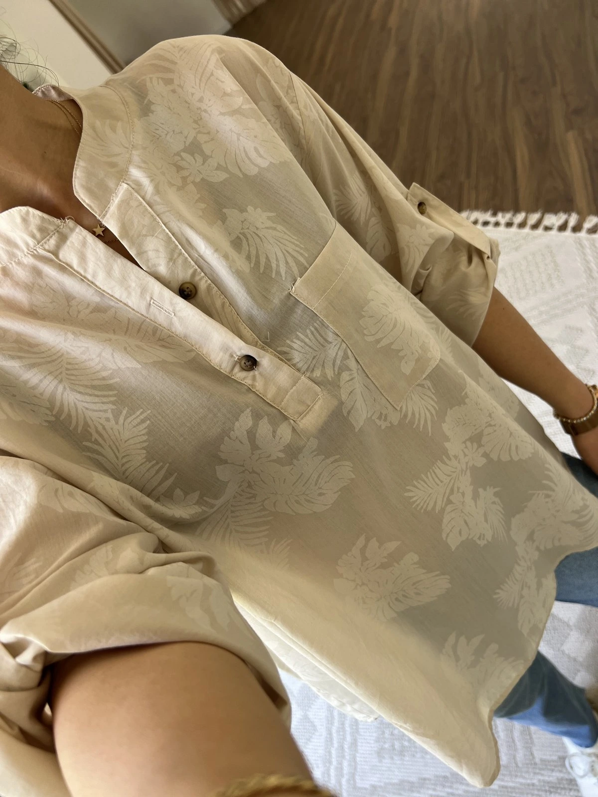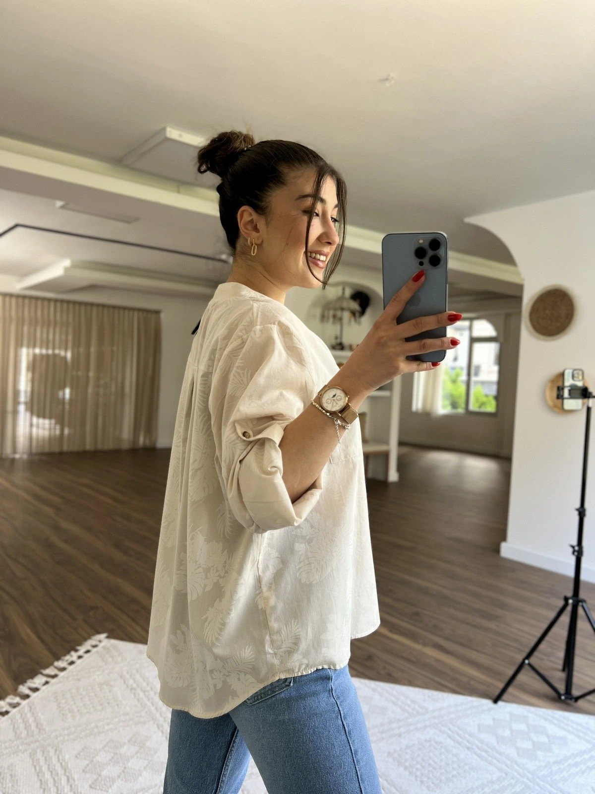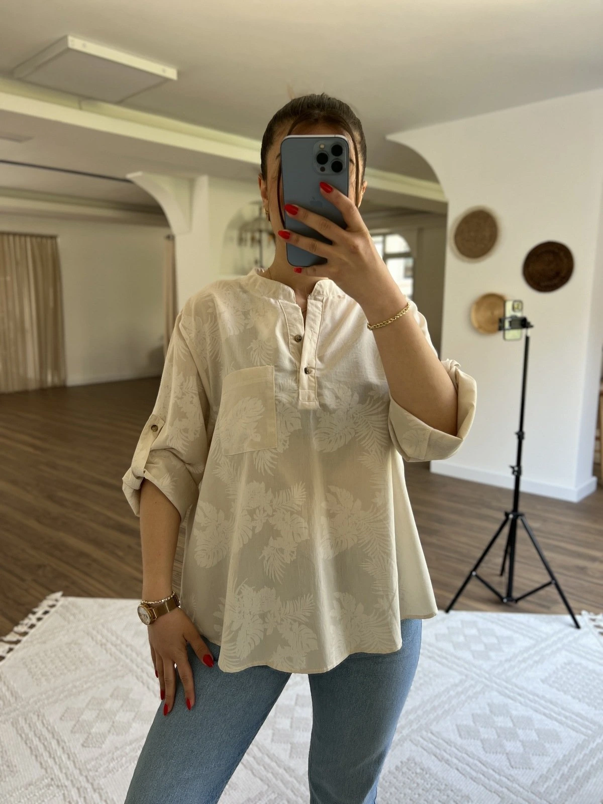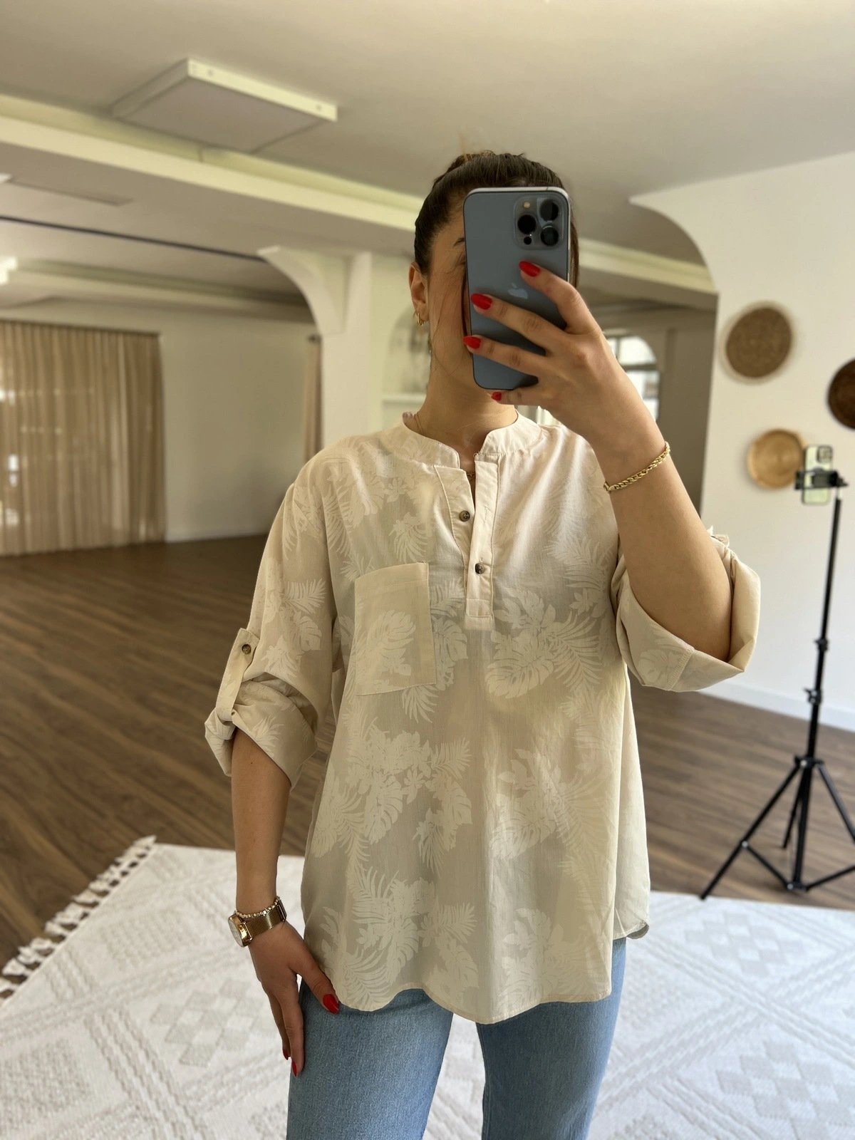DİK YAKA YARI PATLI YAPRAK BASKI DESEN PAMUK VUAL SALAŞ GÖMLEK – TAŞ