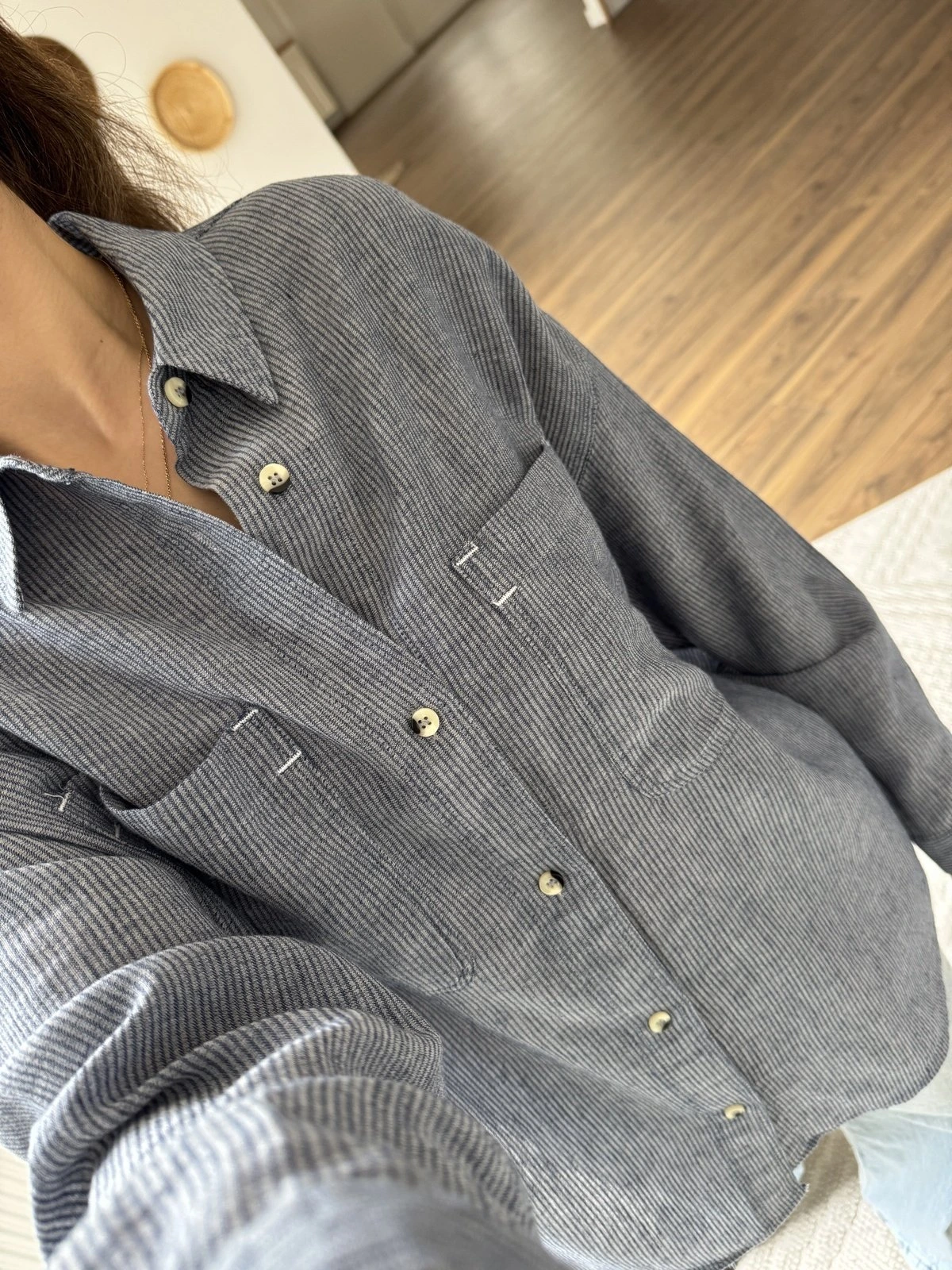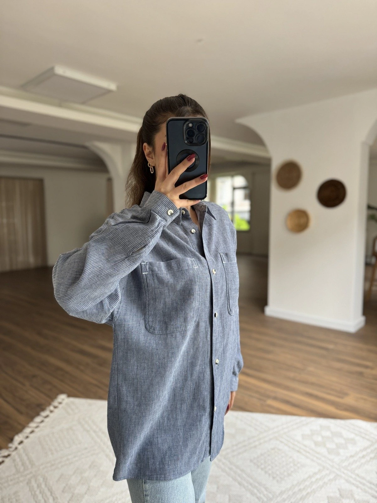 DOKU ÇİZGİ SALAŞ PAMUK KETEN GÖMLEK – LACİVERT