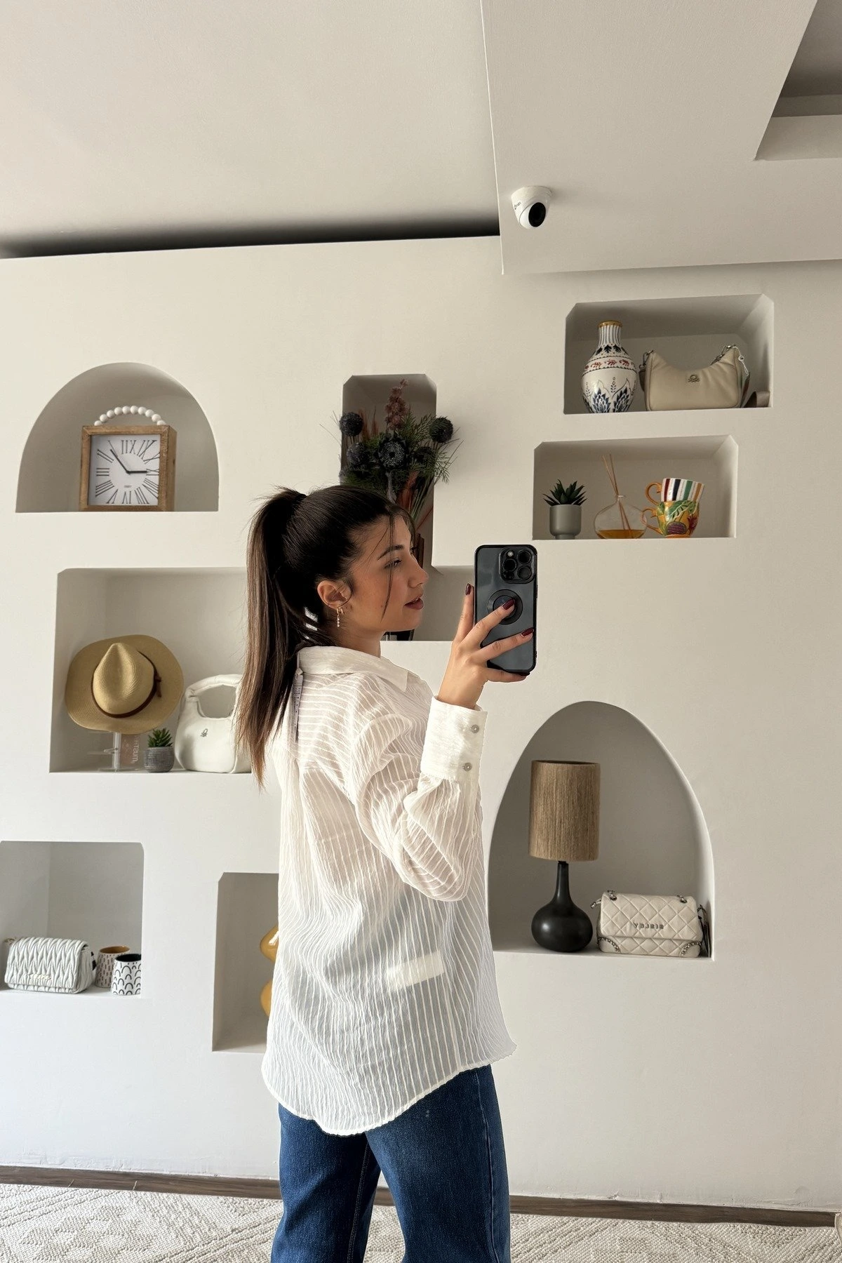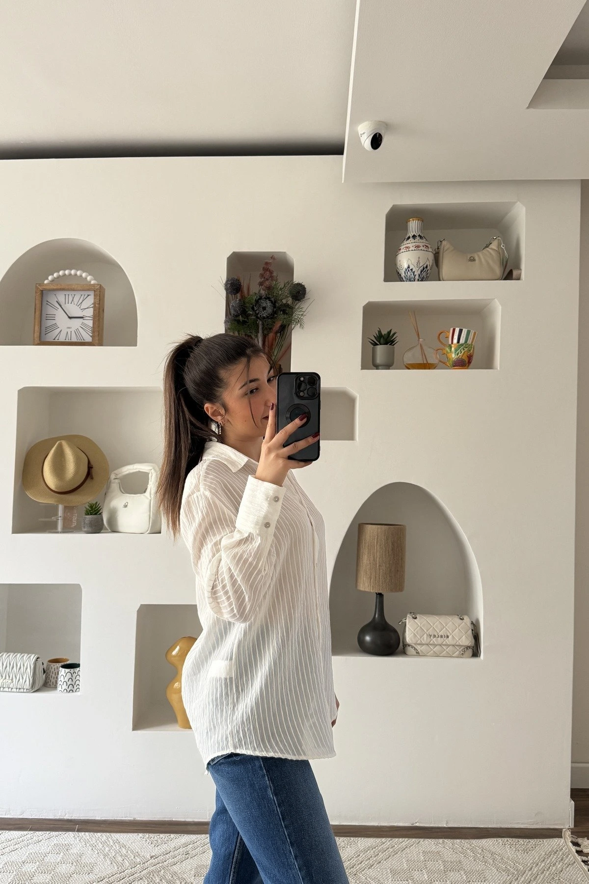 DOKULU ÇİZGİLİ PAMUK GÖMLEK - BEYAZ