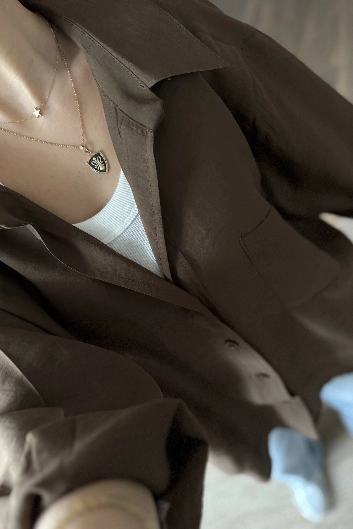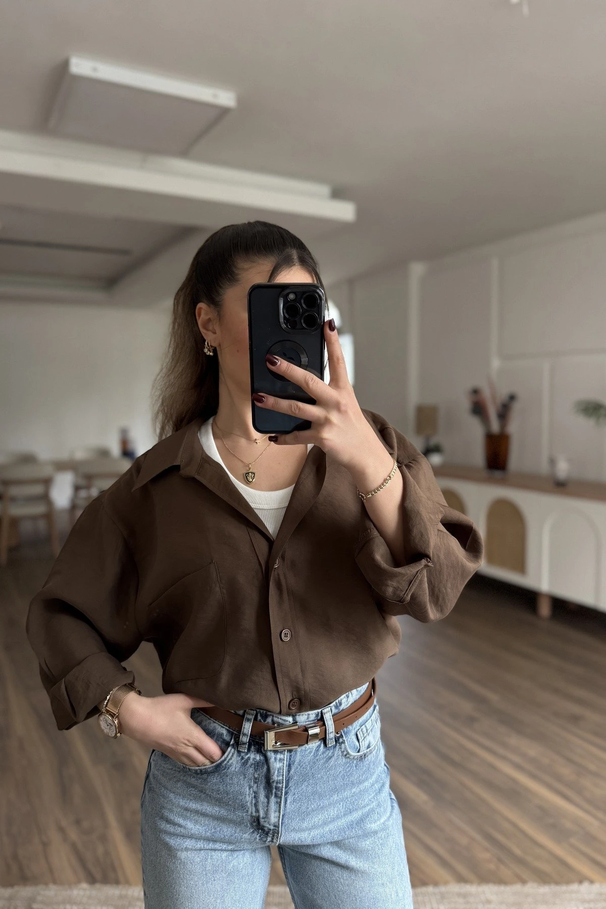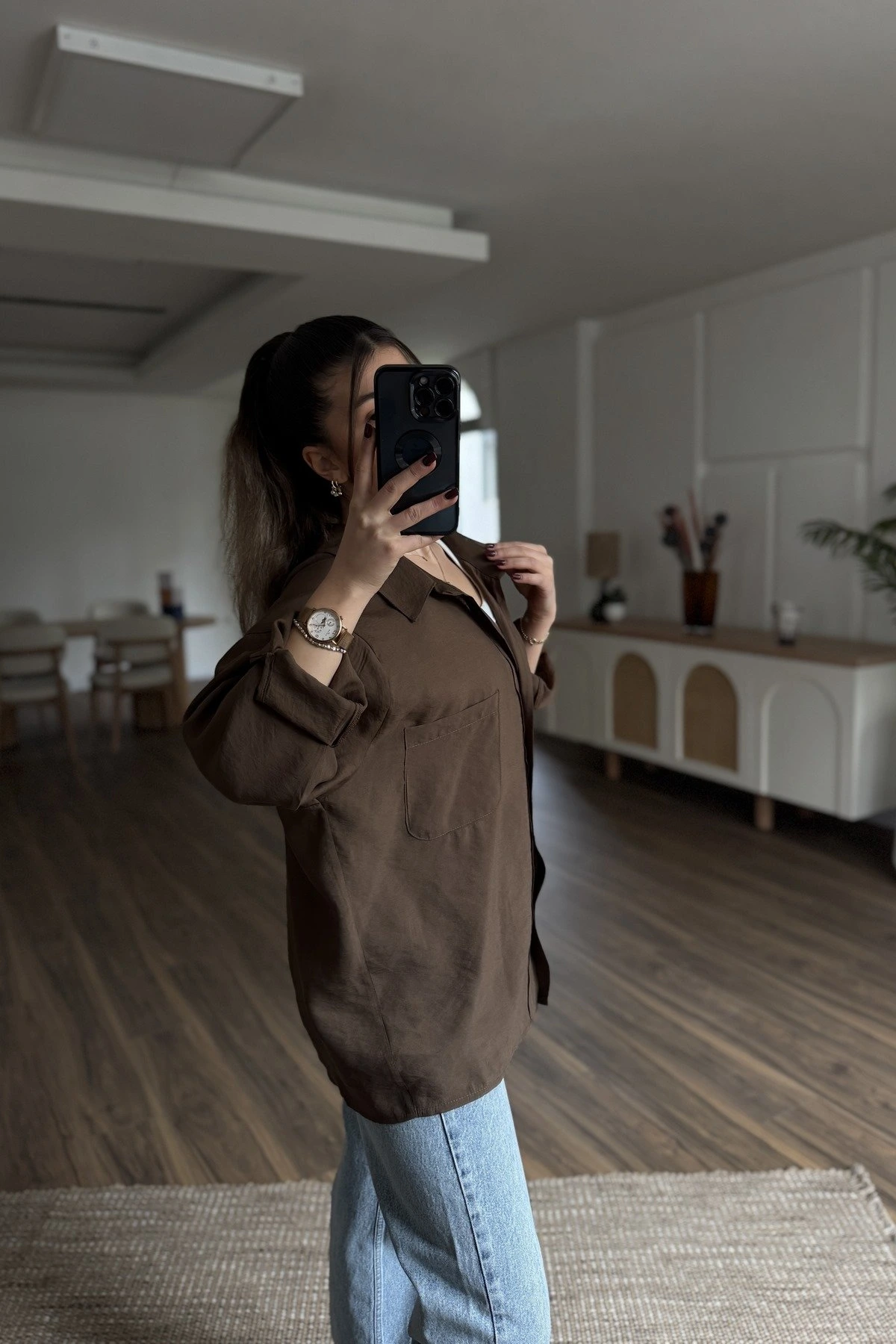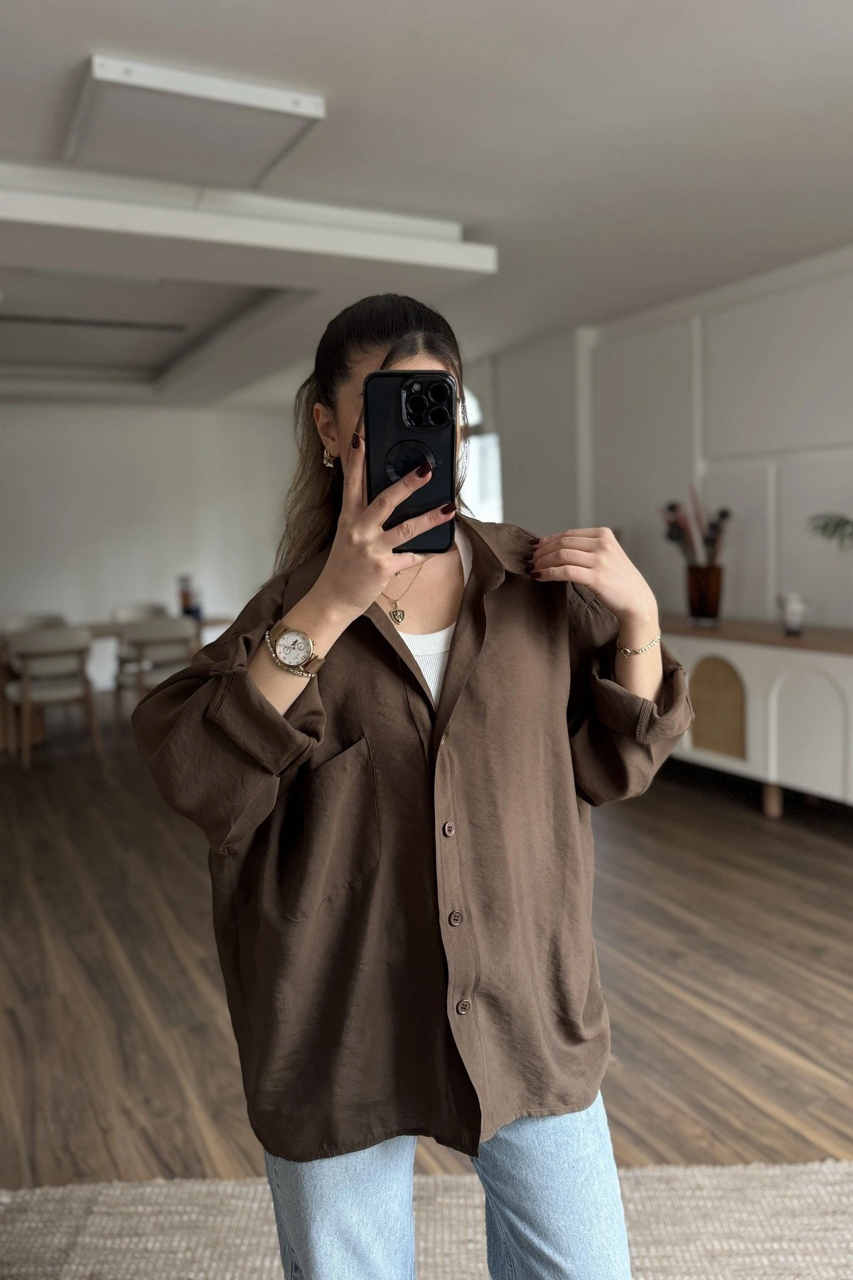 DÜŞÜK OMUZ ARKA A PİLE TEK CEP MODAL SALAŞ GÖMLEK – KAHVE