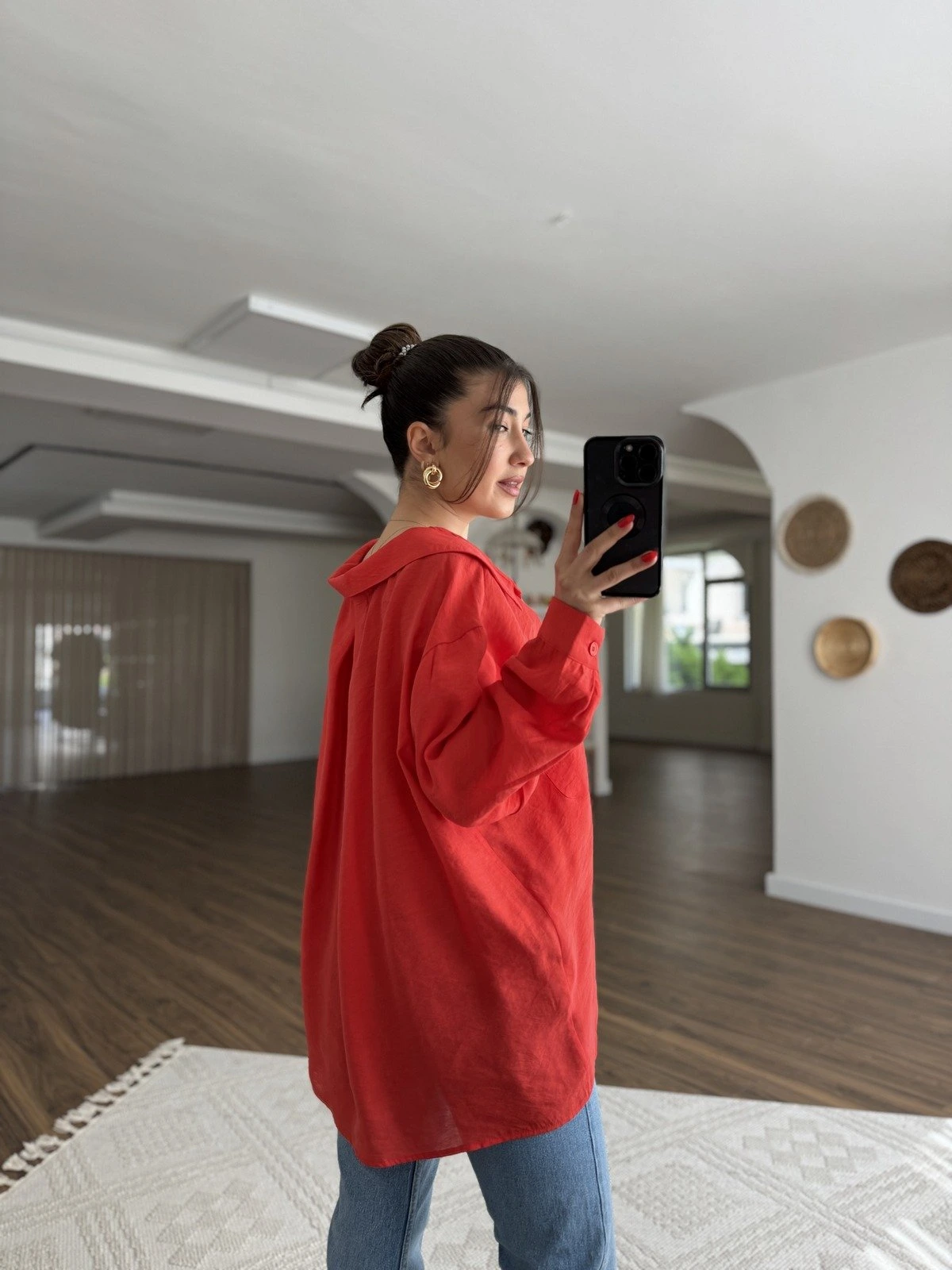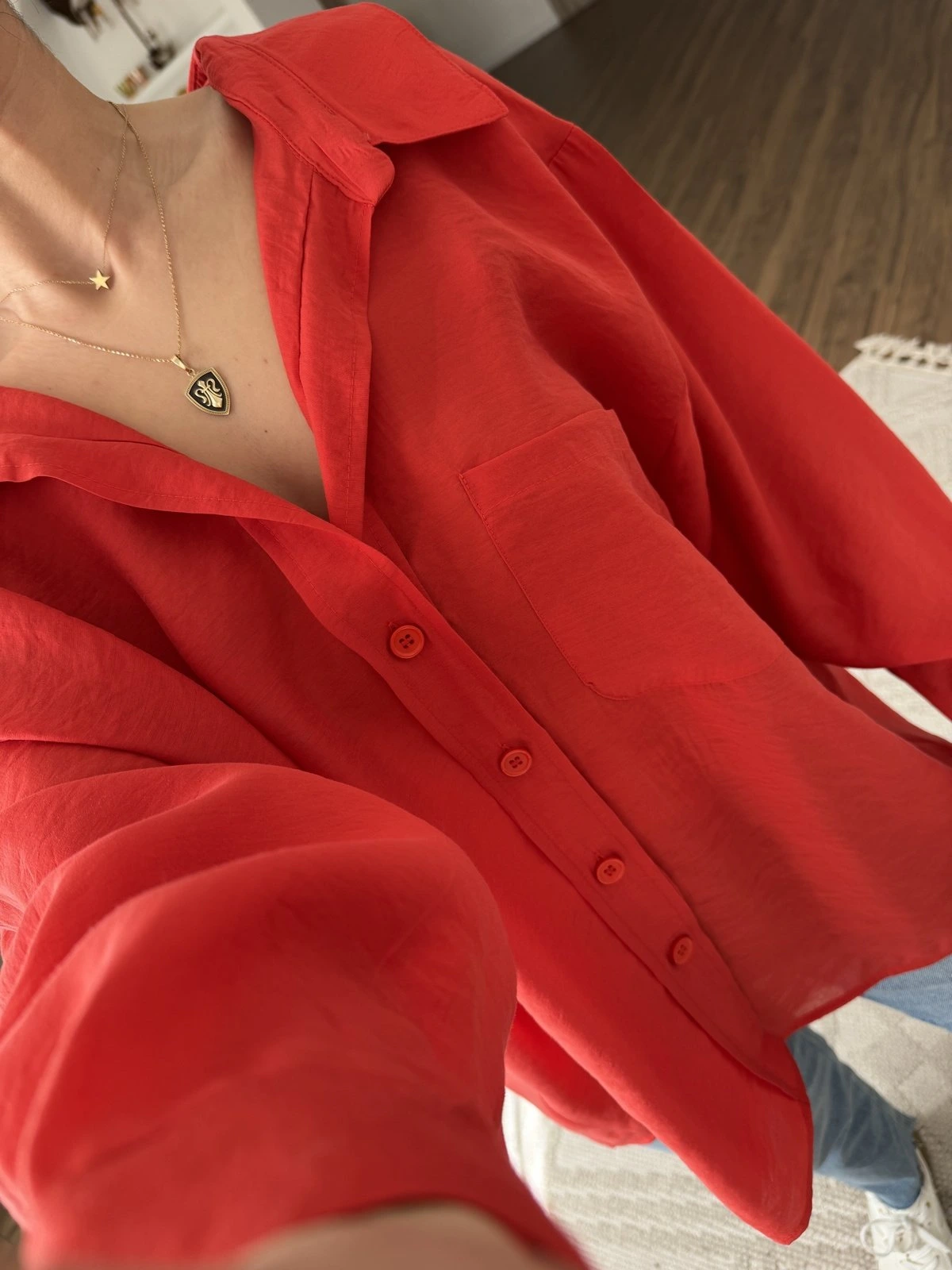 DÜŞÜK OMUZ ARKA A PİLE TEK CEP MODAL SALAŞ GÖMLEK – KIRMIZI