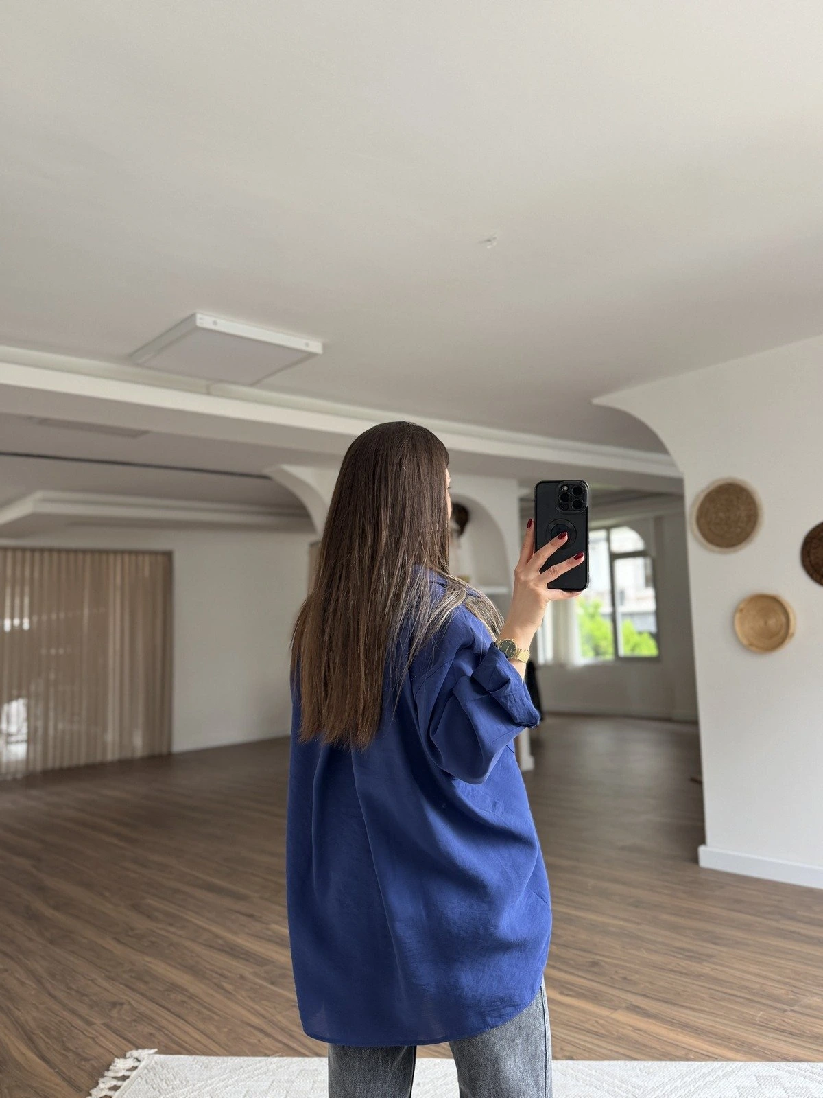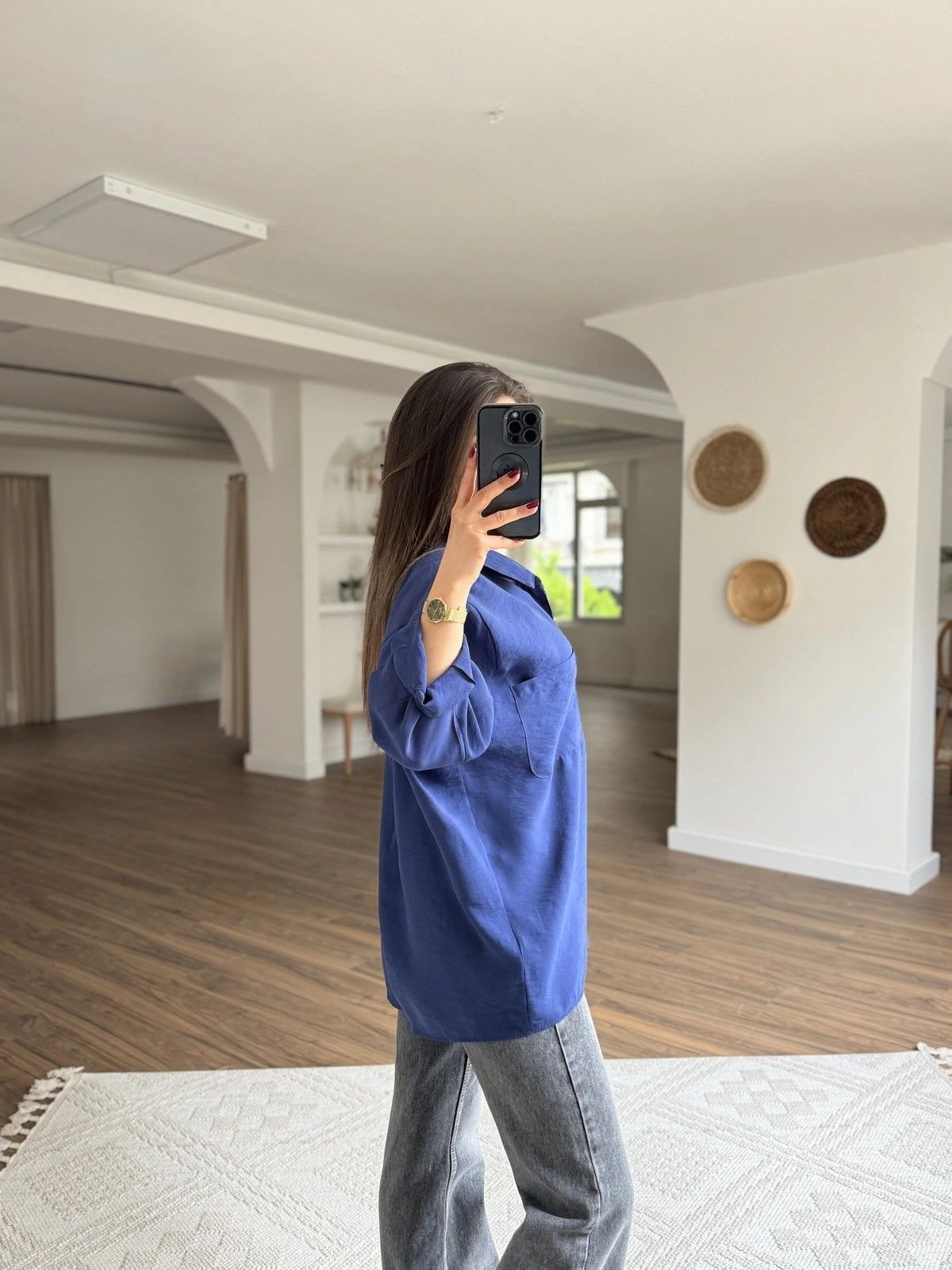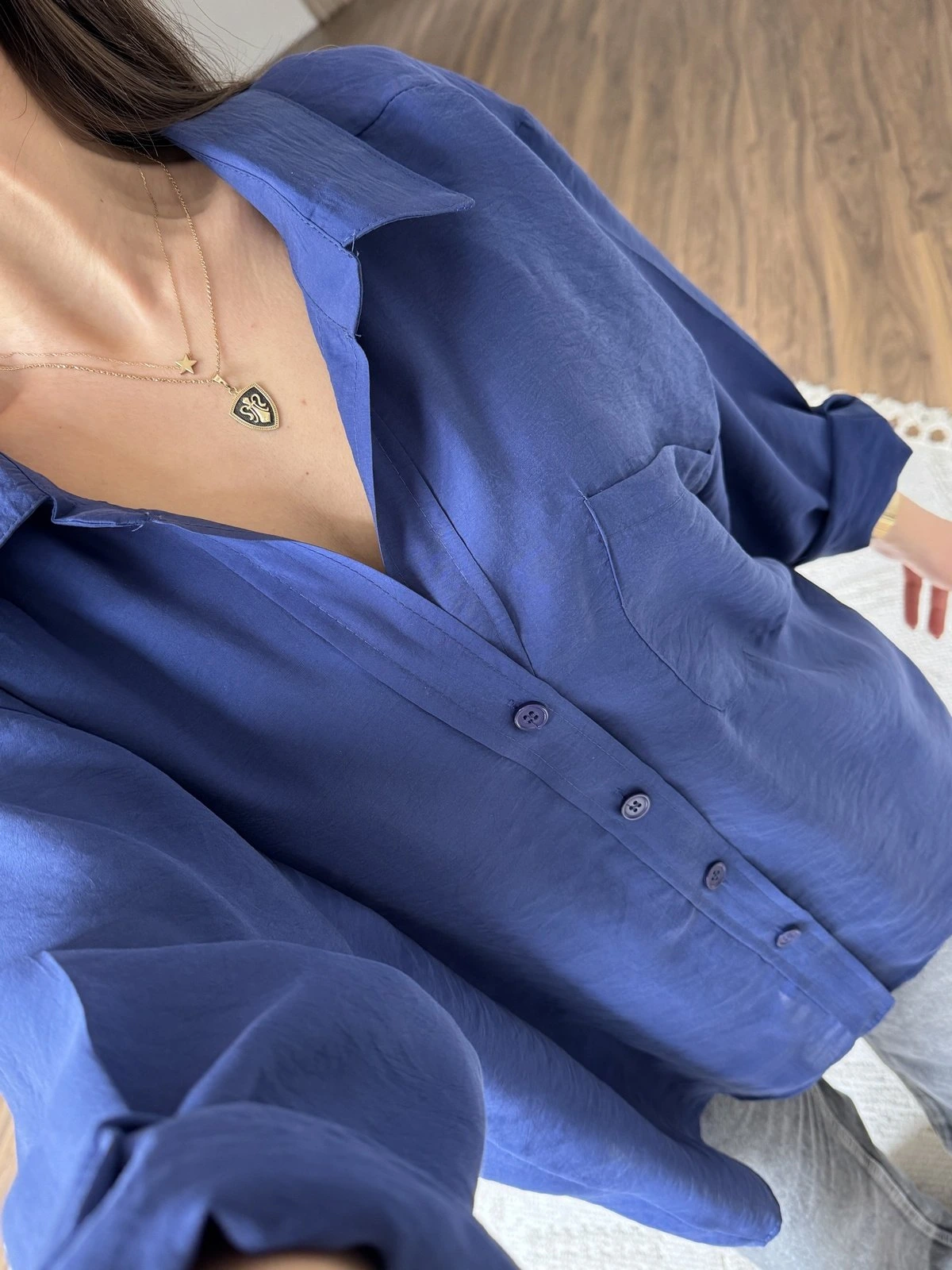 DÜŞÜK OMUZ ARKA A PİLE TEK CEP MODAL SALAŞ GÖMLEK – LACİVERT