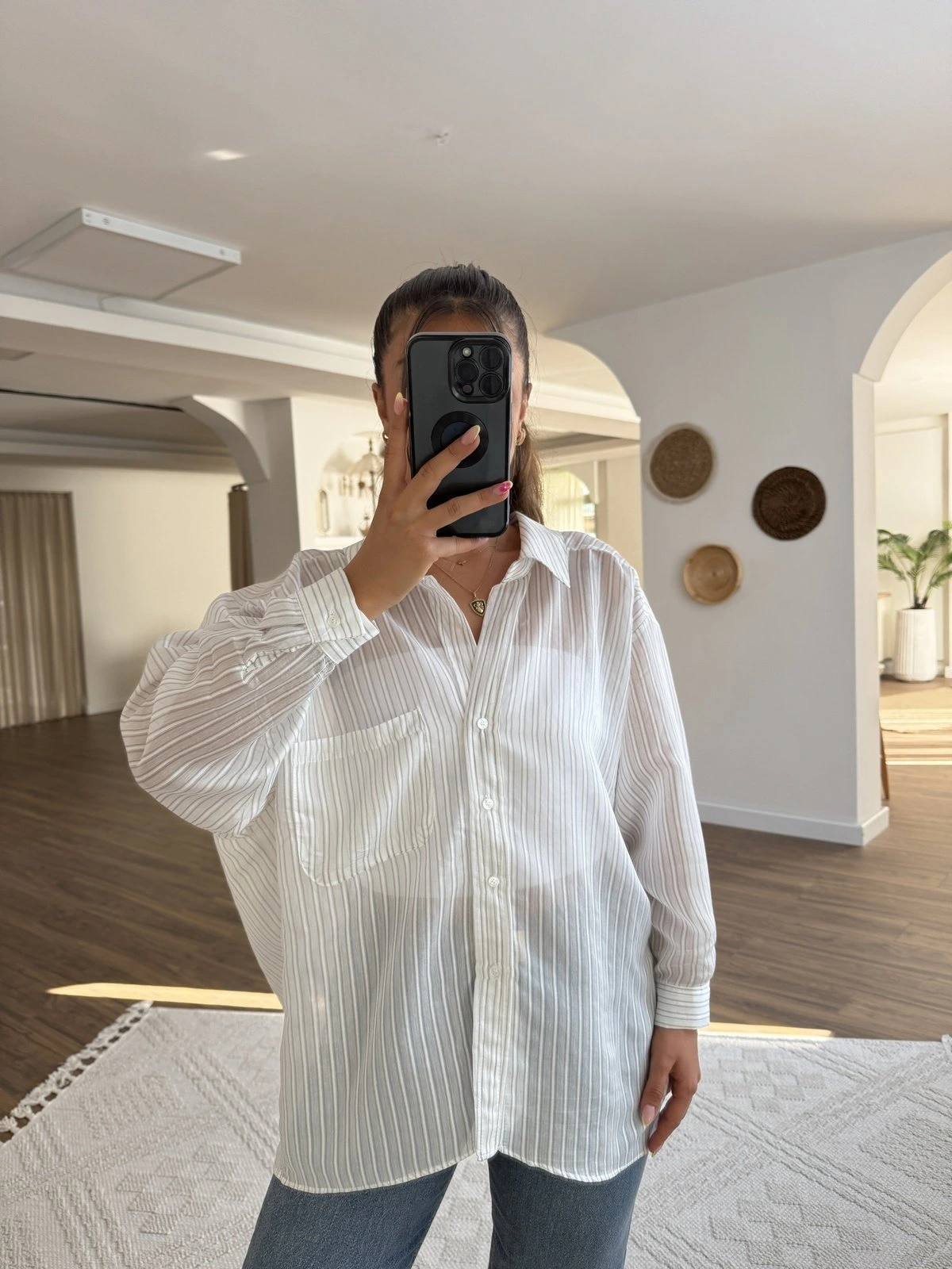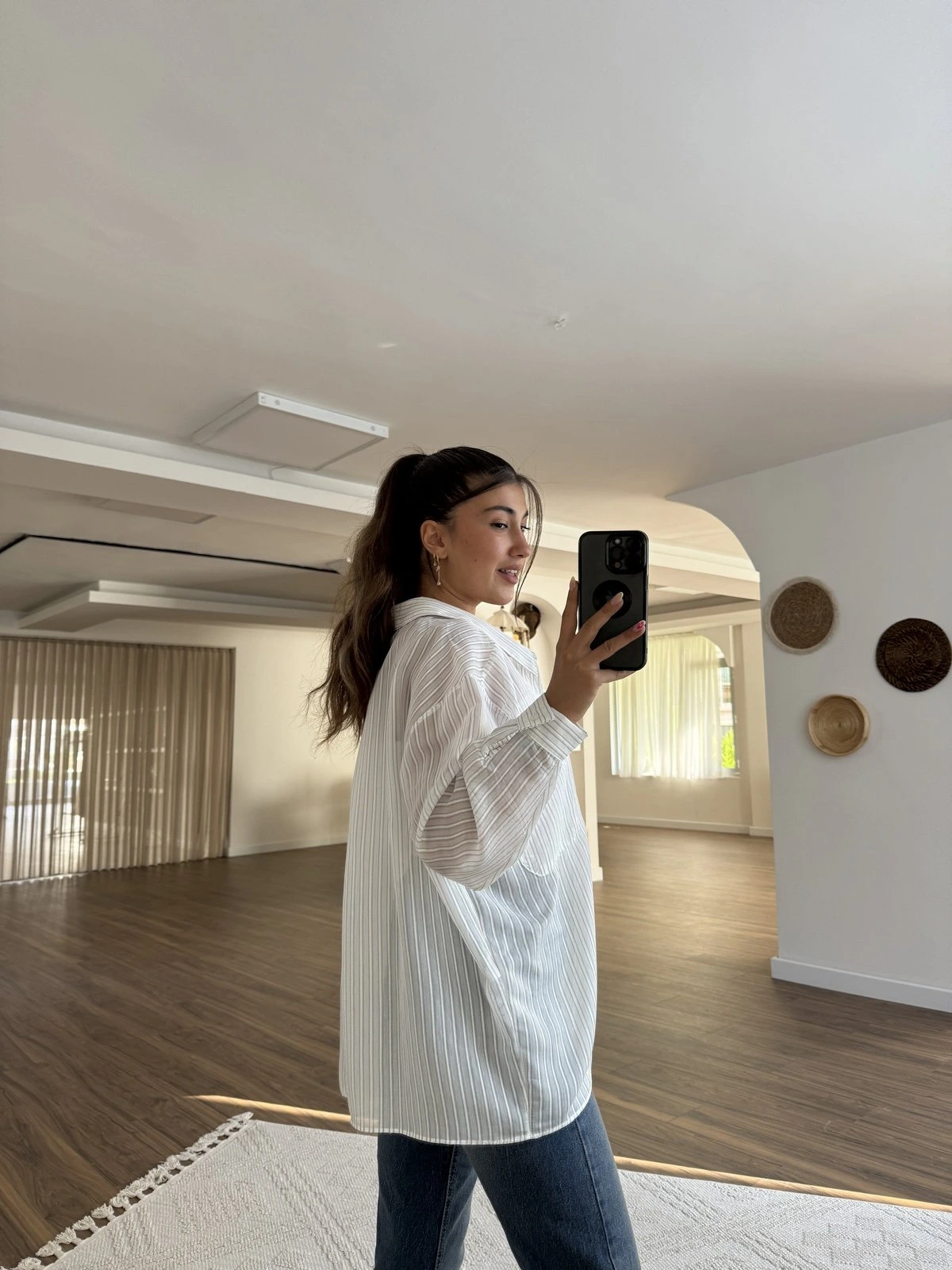 DÜŞÜK OMUZ ÇİZGİLİ ARKA A PİLE VİSKON SALAŞ GÖMLEK – GRİ BEYAZ