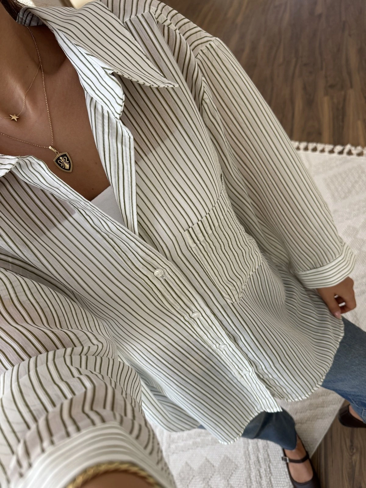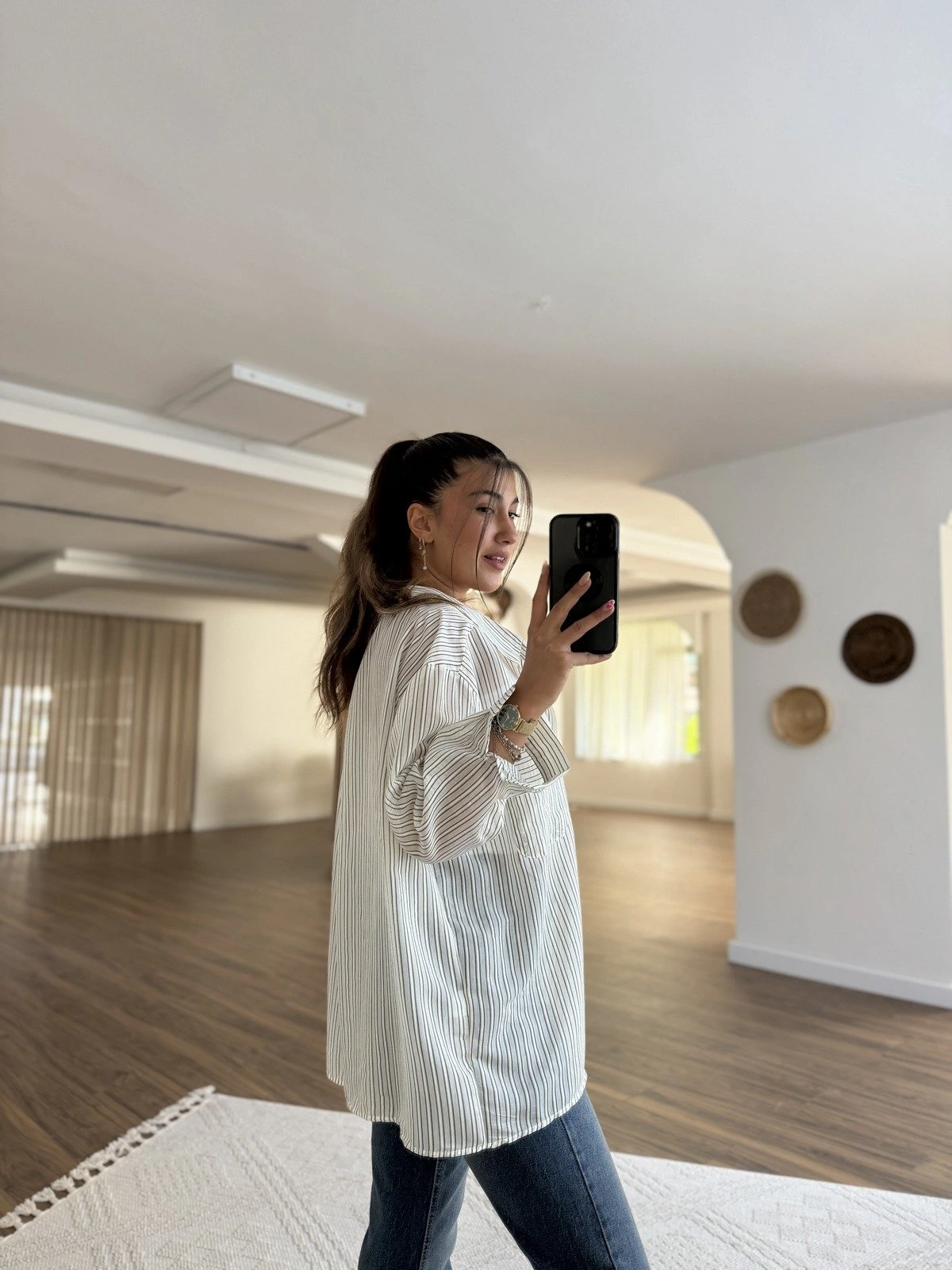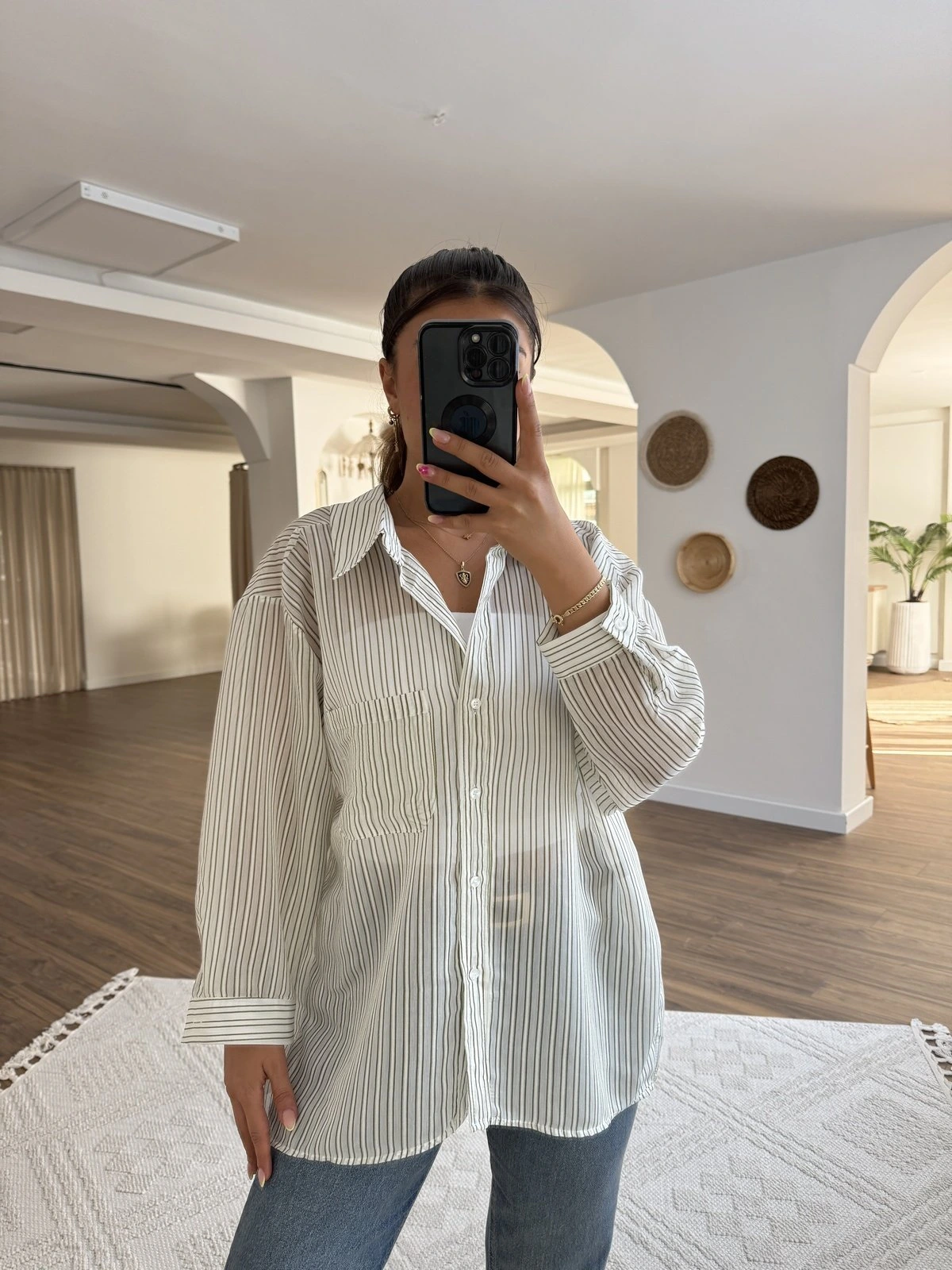 DÜŞÜK OMUZ ÇİZGİLİ ARKA A PİLE VİSKON SALAŞ GÖMLEK – HAKİ BEYAZ
