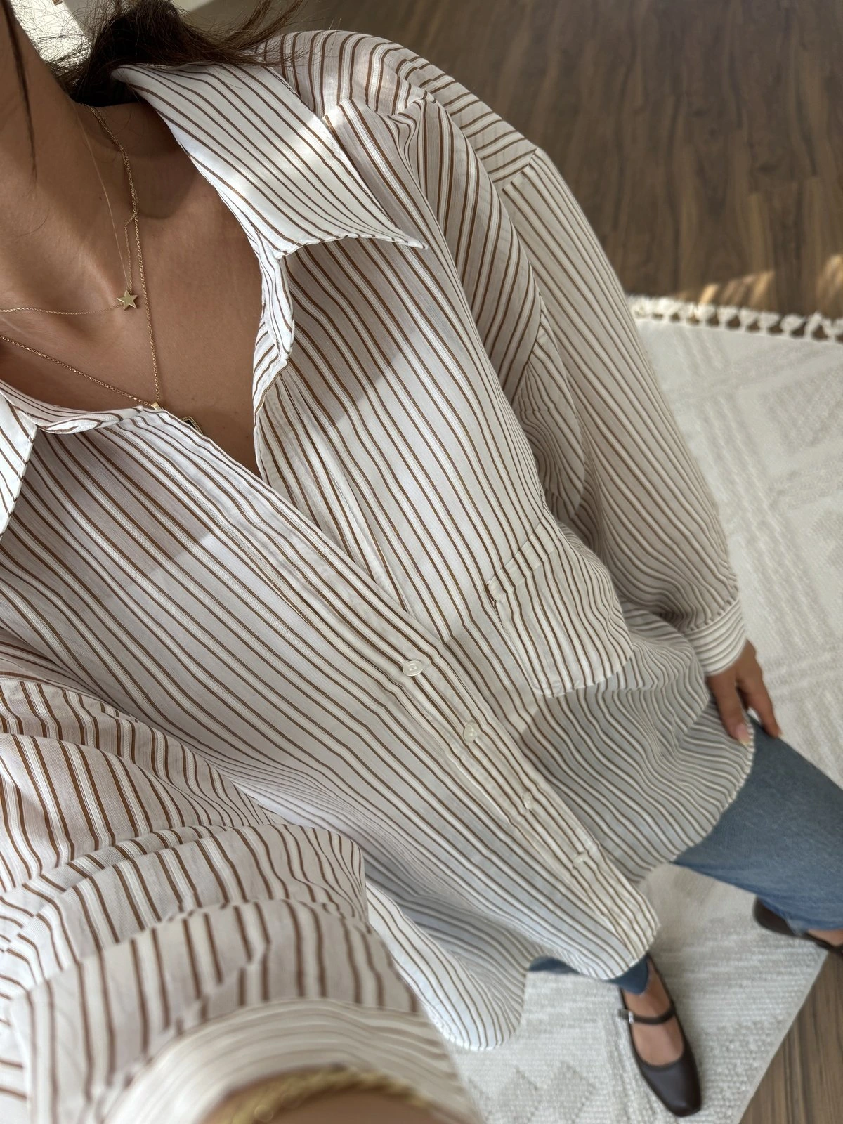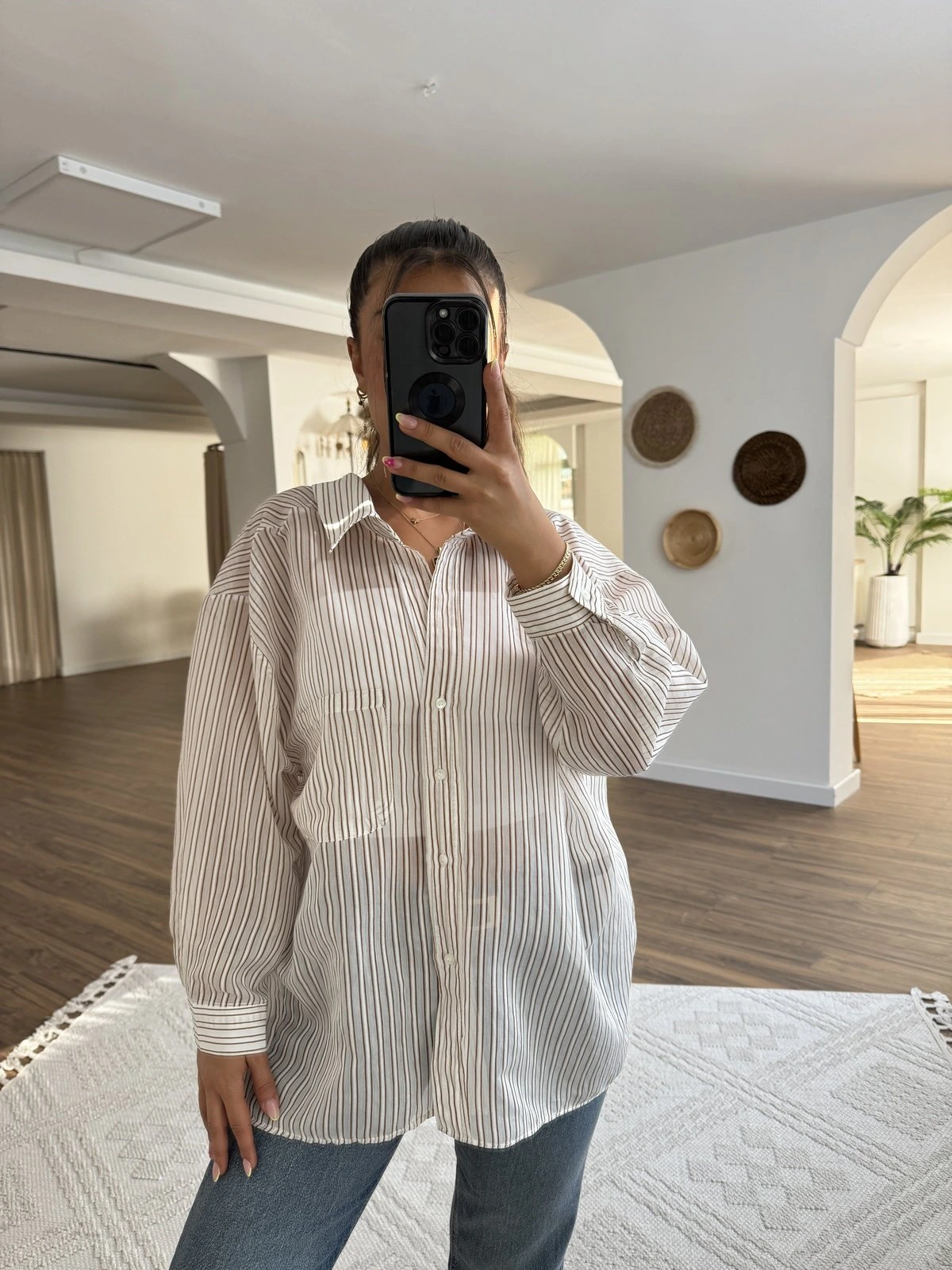 DÜŞÜK OMUZ ÇİZGİLİ ARKA A PİLE VİSKON SALAŞ GÖMLEK – KAHVE BEYAZ