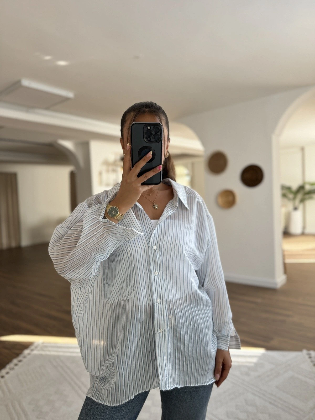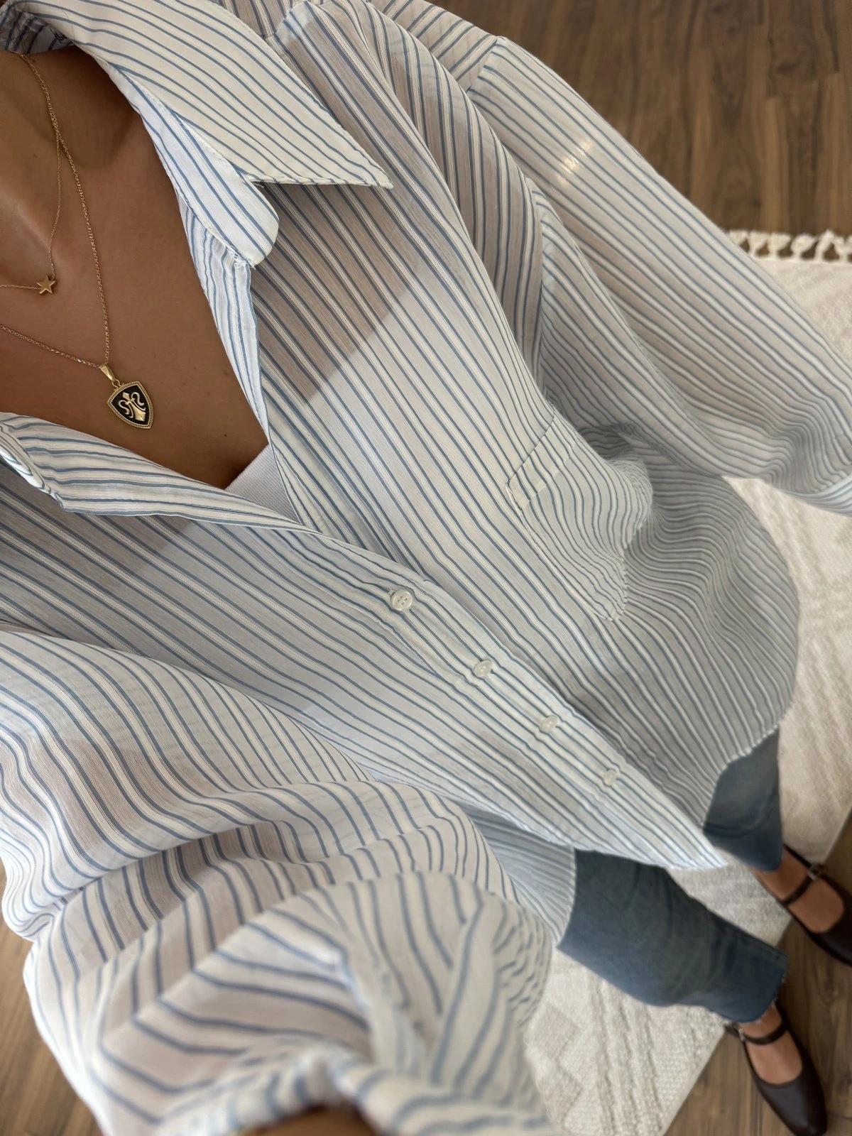 DÜŞÜK OMUZ ÇİZGİLİ ARKA A PİLE VİSKON SALAŞ GÖMLEK – MAVİ BEYAZ