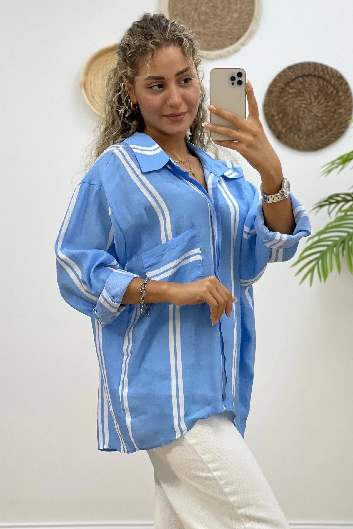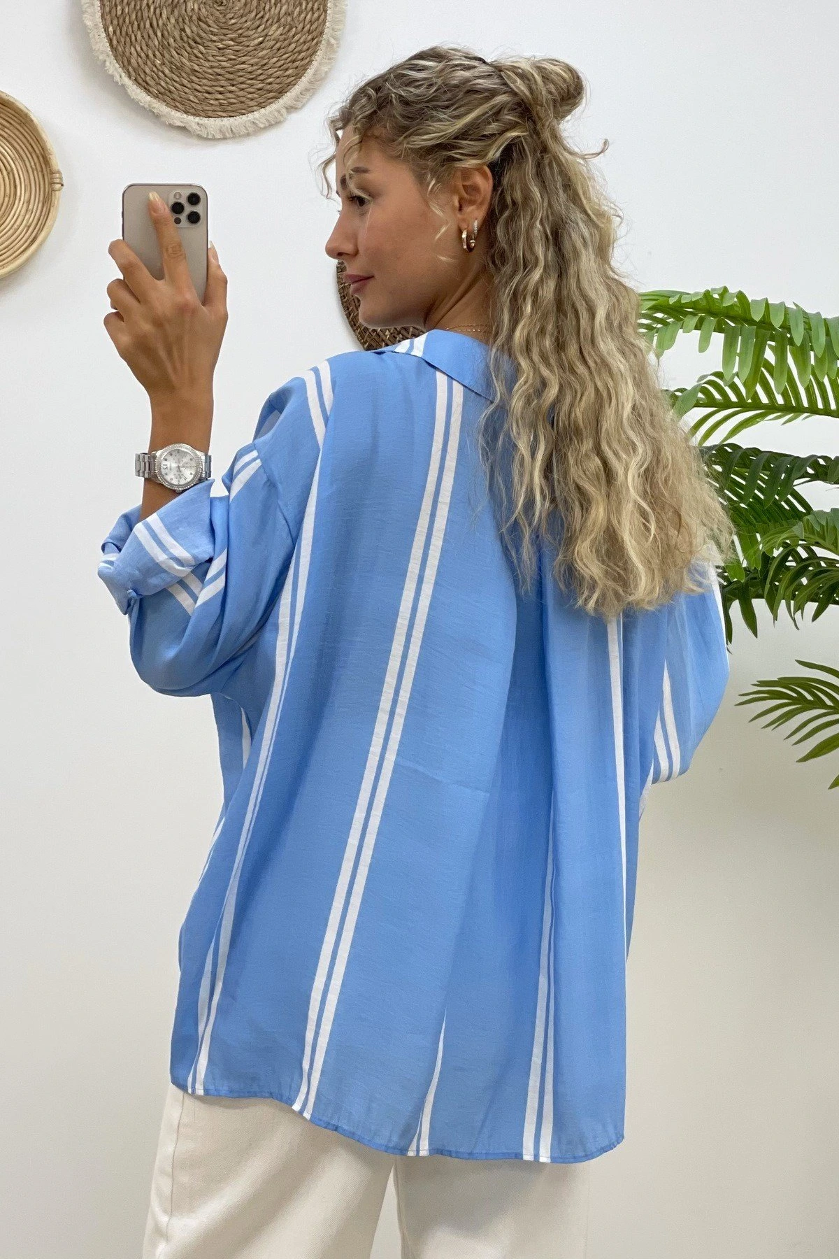 DÜŞÜK OMUZ TEK CEP ÇİZGİLİ GÖMLEK – MAVİ
