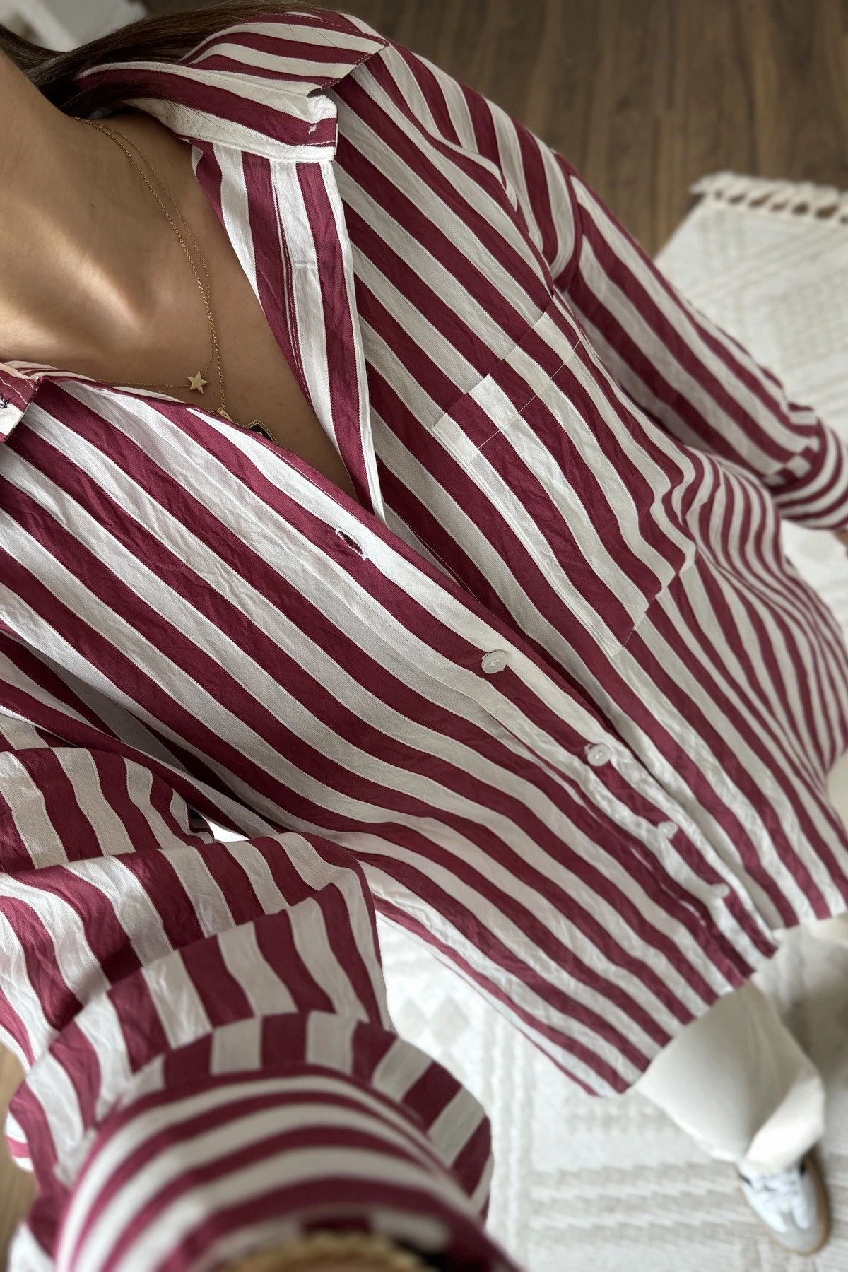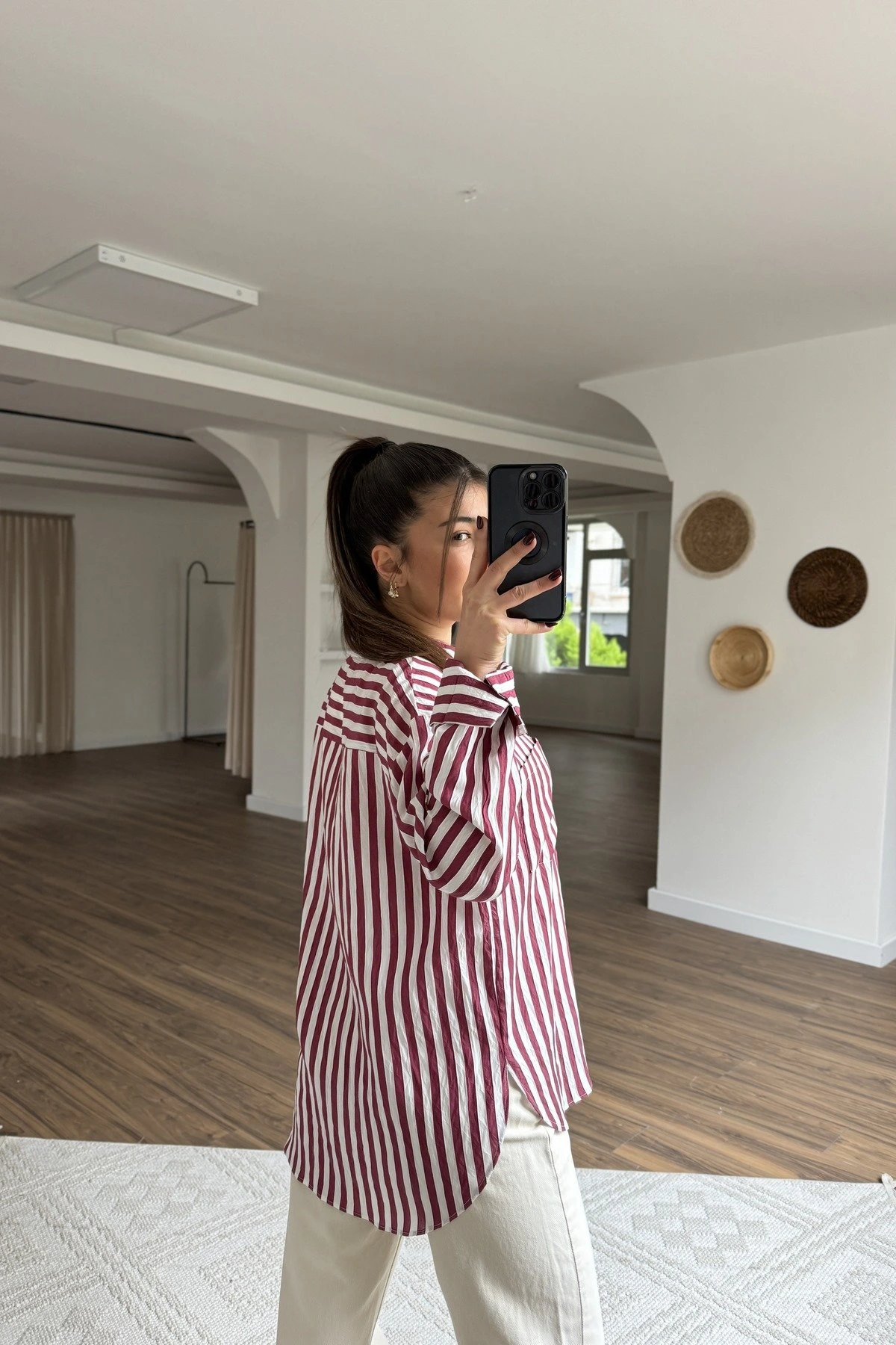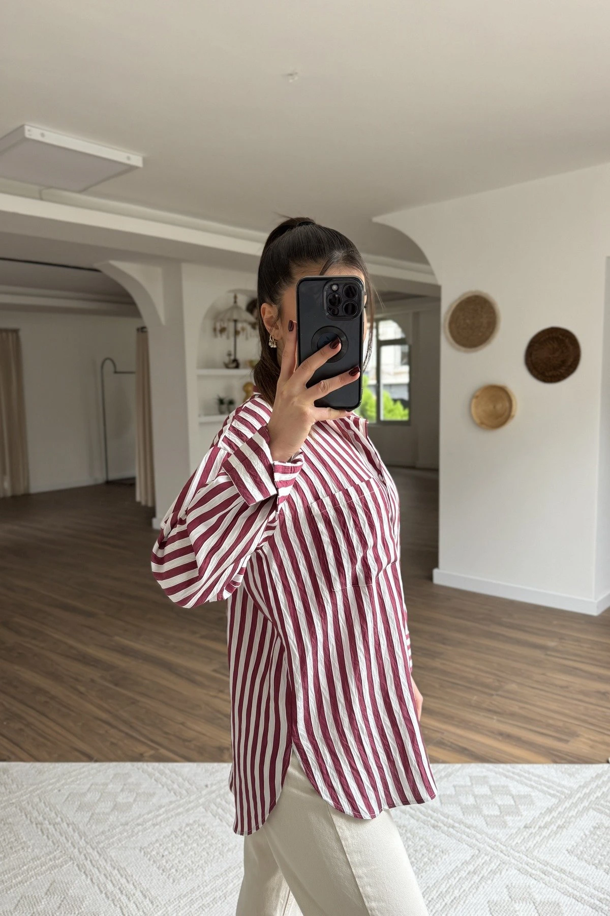 ETEĞİ OVAL DOKU ŞERİT VİSKON OVERSİZE GÖMLEK – BORDO