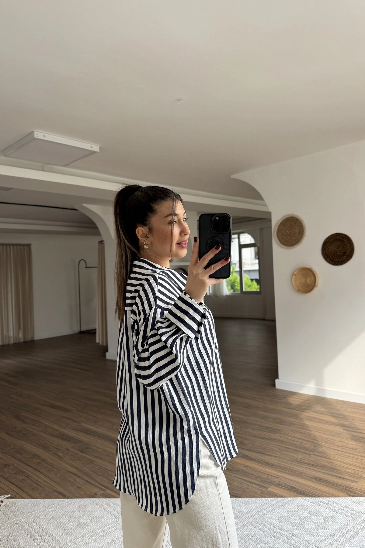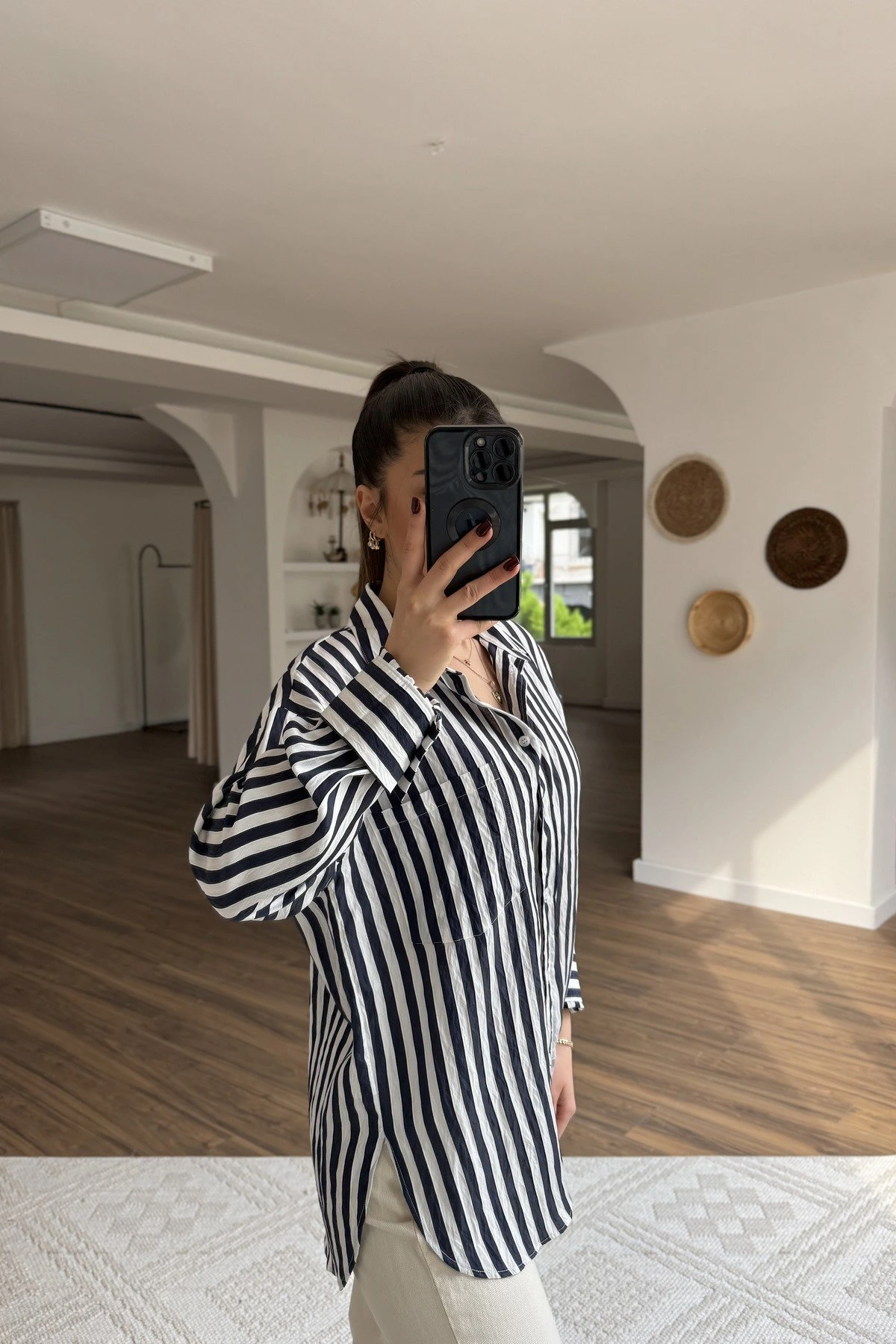 ETEĞİ OVAL DOKU ŞERİT VİSKON OVERSİZE GÖMLEK – LACİVERT