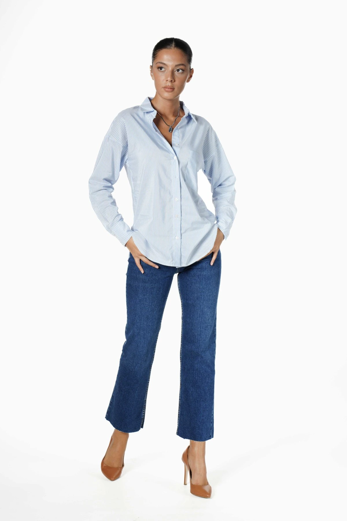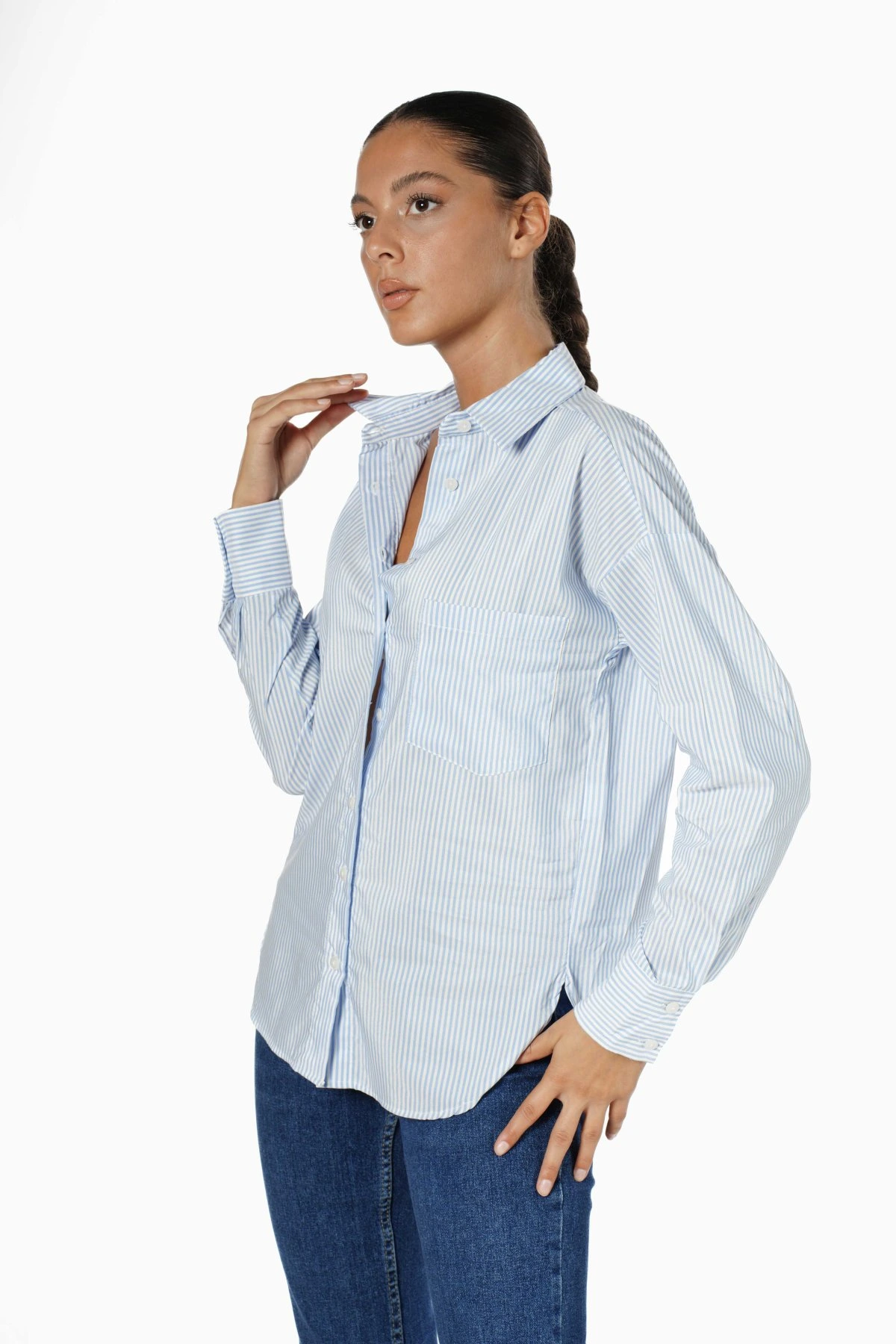 ETEĞİ OVAL TEK CEP ÇİZGİLİ PAMUK GÖMLEK – AÇIK MAVİ